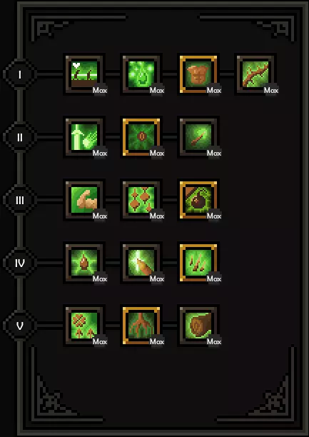 第一层:森林之甲,若存在魔力问题则选择投资回报 第二层:任意 第三层:森林冲击 第四层:任意 第五层:森林之根 次要技能:投掷长剑