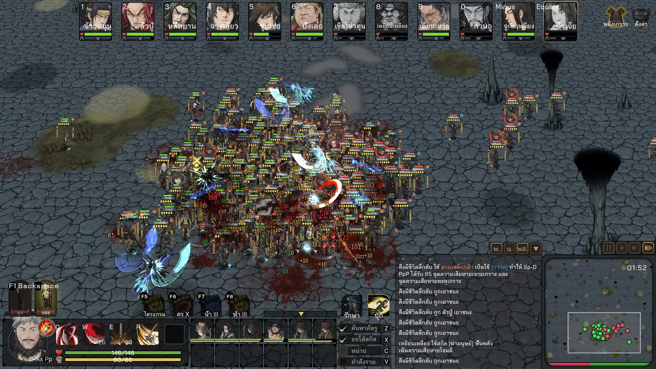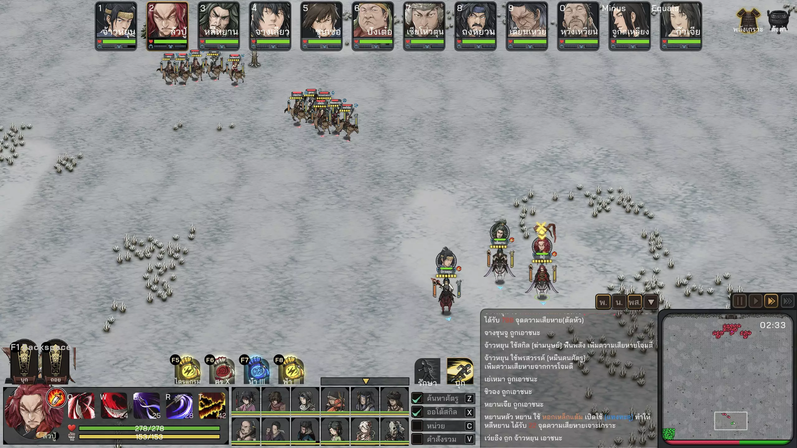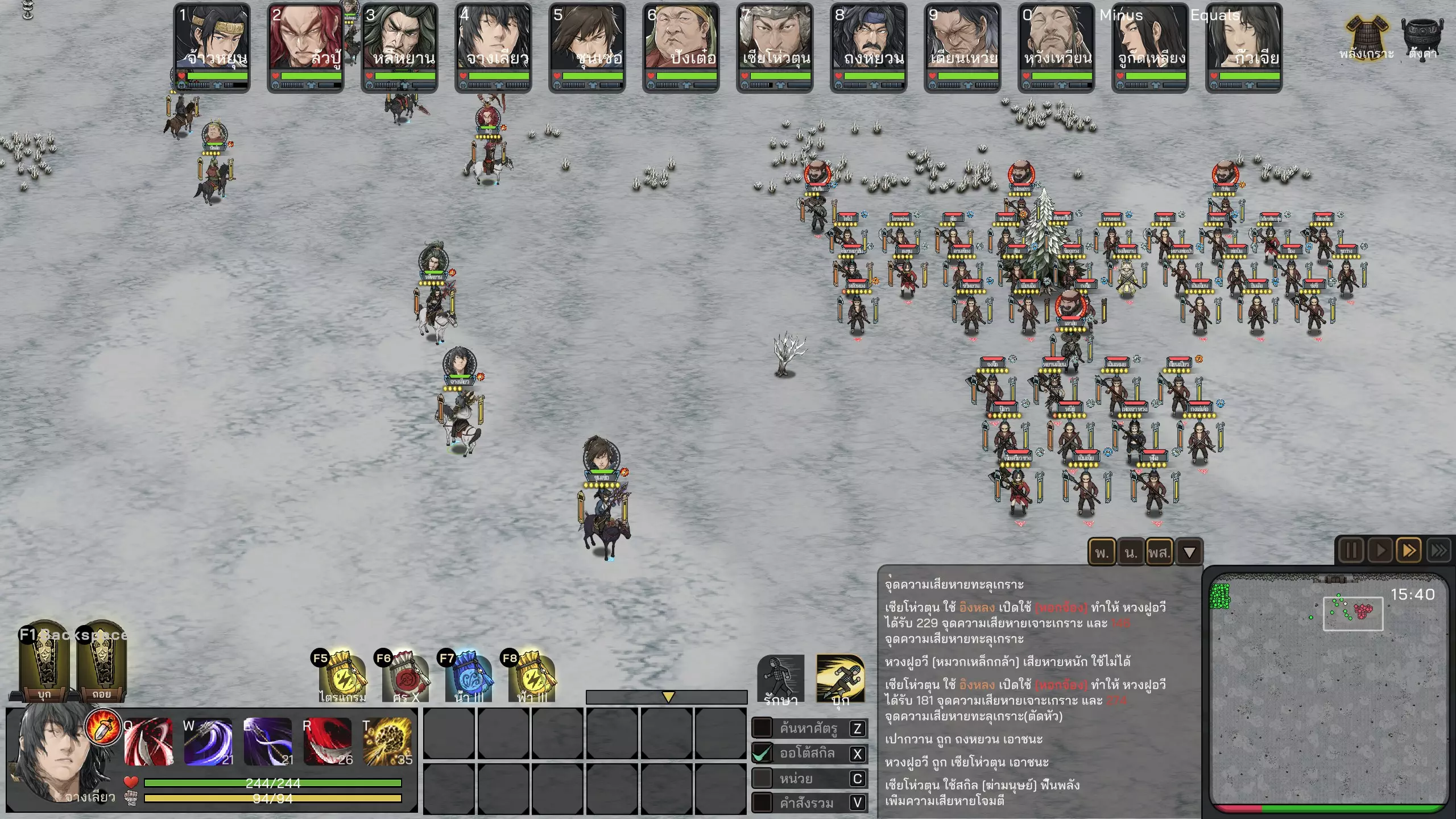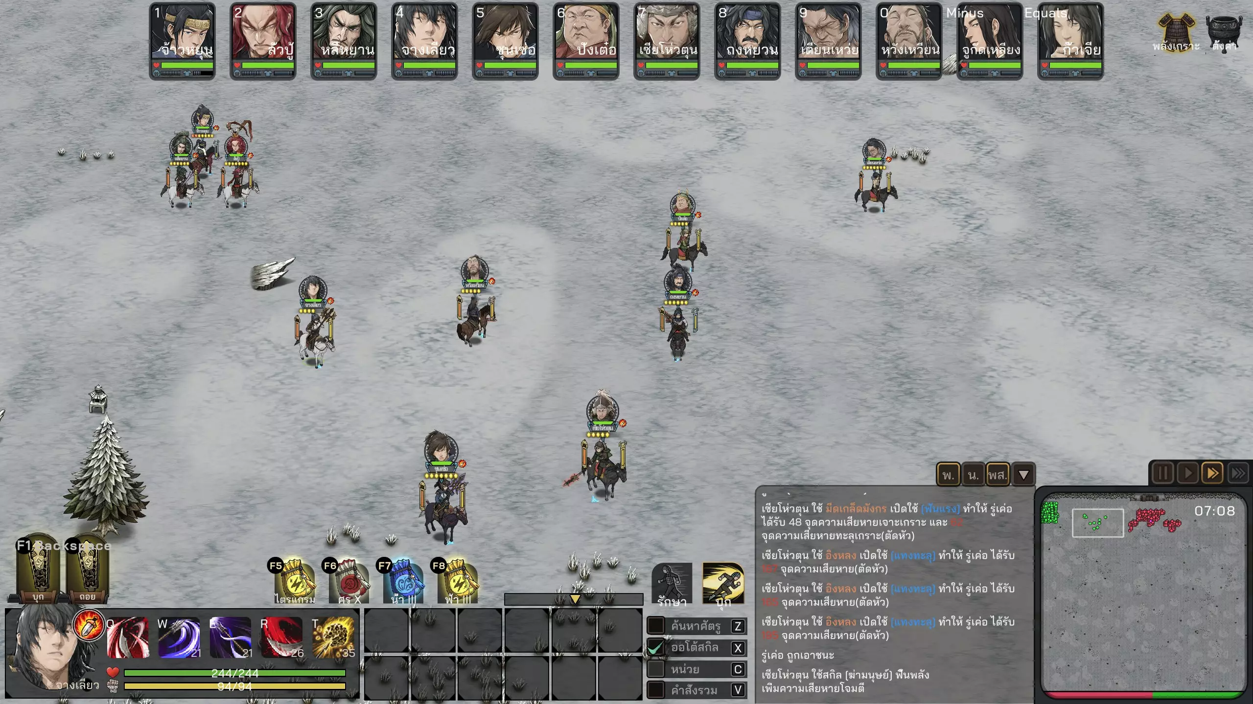 组队战斗的一般原则 - 该游戏的战斗以混乱的混战为主,因此团队凝聚力非常重要。你会注意到,当我方士兵集结在一起时往往较为强大,但一旦分散或单独冲锋,就容易变得脆弱 - 这也是我们不应贸然冲入或独自穿过战场去追击敌人的原因之一。因为您的军队会被分割成一条线,移动速度快的部队会先到达,然后被敌军分别释放技能,一个接一个地被击败。大多数情况下,我们通常会等敌人靠近后再按下F1键集结部队。按下F1之后,您在战斗中的任务就是努力保持部队的集结状态。在这款游戏中,我方士兵常常会傻乎乎地分散行动,独自乱跑,让敌方有机可乘。要注意观察那些脱离队伍的我方士兵,把他们拉回同伴身边。此外,您也可以尝试使用法术或武将技能来狙击敌方武将,但一般来说,如果我方士兵素质更高且布阵得当,这通常不是必需的。你的军队几乎全部,尤其是那些劣质士兵应该作为装备厚重盔甲的坦克单位。较高的格挡值有助于他们更持久地战斗——将领通常是拥有终极技能的角色,可以一次性横扫大量敌人。将领应该骑马,以便更快地转向和释放技能。如果将领阵亡,伤害通常会大幅下降。因此应穿戴最厚重的盔甲,此外,格挡值也同样重要,因为部队通常会率先冲向敌人,必须先承受敌人最初的几次攻击,之后其他士兵才会前来支援分担压力。在阵型部署界面务必始终调整阵型,以便根据需求获得额外的增益。当然,增加格挡机制是很棒的,但如果因此降低部队的移动速度,那就可能得不偿失了。为了便于操控和保持良好的凝聚力,我们不必过度拆分小部队。打个比方,如果有36名士兵,分成3支部队(每队3x12人,编号1-3)会比分成9支部队(每队9x4人,编号1-9)更容易操控。除非你拥有足够数量的精锐部队来进行分兵,分兵能让你更细致地指挥这些部队——军师建议将末尾的部队分出来,因为我们不常指挥它们,这些部队通常没有劣质士兵,应避免投入战斗(很多人体型单薄,容易阵亡)仅仅是因为必须按照游戏系统的设定,只有握住法杖才能释放法术而已。如果在布阵界面就调整好位置,我们就能对进入射程的敌人释放法术,而不必让自身陷入过多危险。战斗与战争(War & combat)涉及一般战斗:1.总的来说,这是一款战斗系统与其他游戏不太一样的游戏。普通玩家需要花些时间适应,因为不太熟悉。按键分为ZXCV的操控系统说实话非常令人困惑(不同于其他常见即时战略游戏的攻击移动、保持阵型等操作)。如果能熟练操控,游戏中会有许多可运用的微操细节,但大部分时候还是会让人感到困惑。因此我们常常更倾向于直接指挥部队正面交锋。2. 战斗中的实力强弱主要取决于部队的凝聚力。正如前面所提到的,在这款游戏中,士兵集结成整体时会更强大,分散开来就会变得脆弱,排成一条直线行进则会接连被消灭。所以我们的核心任务就是将部队集结成整体,然后按下全体攻击键(F1)。