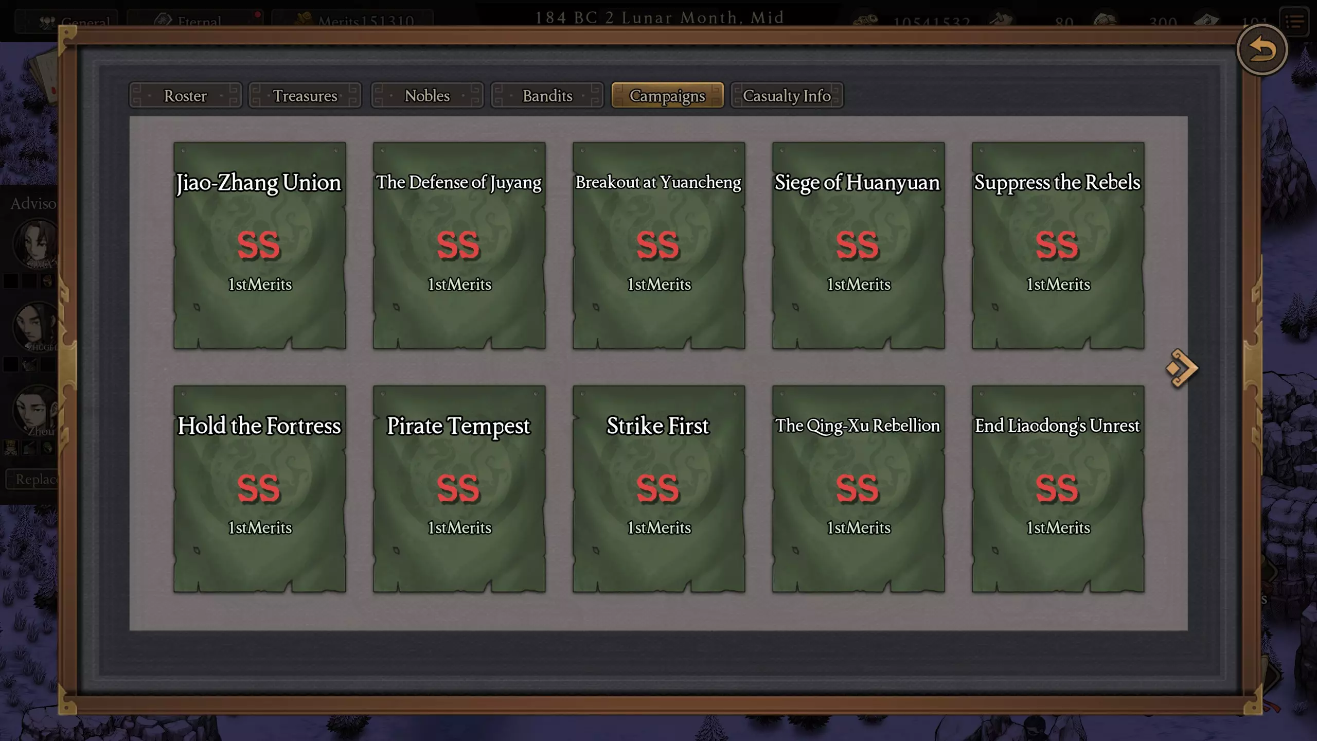 中国(及日本)的农历纪年法采用yy/mm/dd的格式,例如正月初一。而本游戏采用公历纪年,每月分为三个阶段,即月初、月中、月末,每个阶段各10天。交章联盟(周军):182年3月初 鲁氏豪强集团得知鲁直在返回城池途中将遭暗杀的密报,首战我们必须与桃园三兄弟联手,此战相当于热身之战结束辽东动乱(北平):183年6月末 正当鲜卑在辽东地区作乱之际,高句丽王国趁机入侵辽东边境,联合北平的公孙瓒军队,彻底击溃了高丽的嚣张气焰。九江之乱(阜城):183年8月末 原九江寨的贼寇本是行侠仗义的义贼,专劫豪强恶霸以救济百姓。后来一群毫无道义的贼寇前来夺取了山寨。请协助周泰与蒋钦(蒋奇)重新夺回九江寨。龙虎之争(卢阳):183年10月末,马元义在洛阳的太平道分支被官方逮捕,京城地区的宗教信徒群体集结力量试图劫狱。在此事件中,你必须与洛阳的诸侯们联手,防御来自四方的攻击。【最终之战】:184年1月中旬,第12次战役的结果。(肥马的命运)以及从之前的战役中积累的分数将是决定出现哪个剧情的因素。剧情1:黄巾军成为被攻击方,盟军将联合力量夺取最后三座城池,以彻底消灭黄巾军(通向最佳结局)。13. 邺城之战(元城)14. 巨鹿之战(常山)15.安平之战(乌夷) 剧本2:黄巾军为进攻方,从三个方向对城池外围发动攻击,我们需协助汉军防守来自三个方向的三座城池 16. 上党之战 17. 南皮之战 18.谯县之战 关卡3:这是最糟糕的情况,黄巾军已经占领了外围城池,并正集结兵力进攻主城。 最终战役发生在虎牢关。 19. 虎牢关之战 声望技能(Reputation skills)【沮阳(雁门)防御战】:182年4月末 鲜卑军队入侵并州北部,包围了沮阳城,我们必须与并州的将领们联手击退这些蛮夷的威胁。邺城突围战:182年6月中旬 陈耽、董太后因触怒十常侍而被罢官,甚至遭人追杀。请联合其他城主势力,共同保护董太后免受十常侍叛军的迫害。【华原(开封)之围】:182年8月初 今年灾祸频发,因旱灾导致产量下降,使得农民叛军向京城进发,我们必须与诸侯联军合作,以解除华原关的围困。镇压叛军(中山):182年9月末 中山城东的黄巾叛军正逐渐集结势力,此次需与 jijiu 大人联手,在其势力壮大前将该叛军彻底击溃坚守要塞(麻城):182年11月中旬 鲜卑羌族刚刚更换族长,正集结兵力再次进攻北方边境城镇,我们必须与北方武将联手解决这场危机。海盗风暴(杨欣):183年1月初 来自鄱阳湖的海盗开始集结兵力,准备进攻沿岸城镇,需联合友军彻底击溃这些海盗。先发制人(建宁):183年2月末 黄巾贼开始积蓄力量煽动蛊惑民众,此役将杀鸡儆猴,联合诸侯共同摧毁其位于谯县的核心据点青徐之乱(泰山):183年4月末 青州北部的军队发动叛乱,占领官府粮仓并劫掠百姓,联合泰山朱氏家族共同保护民众