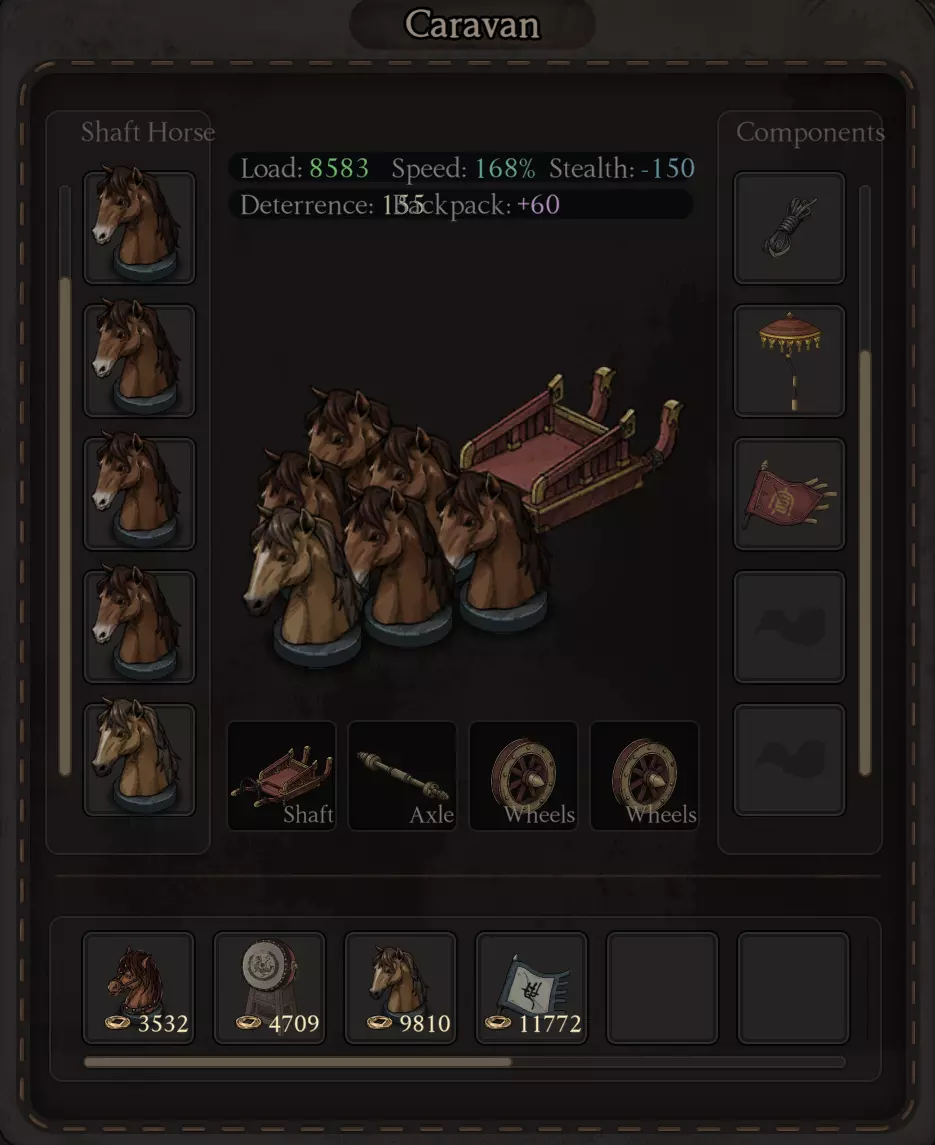 马车的速度取决于各个部件,但最重要的是马车本身决定了能牵引多少马匹。当然,优质的马车部件在初期相当昂贵。 宗族系统