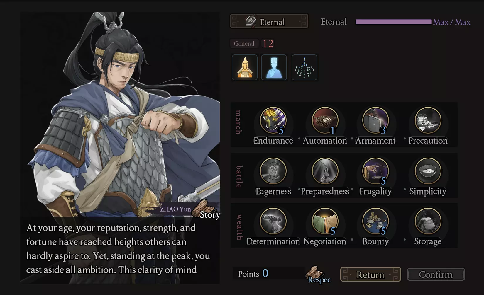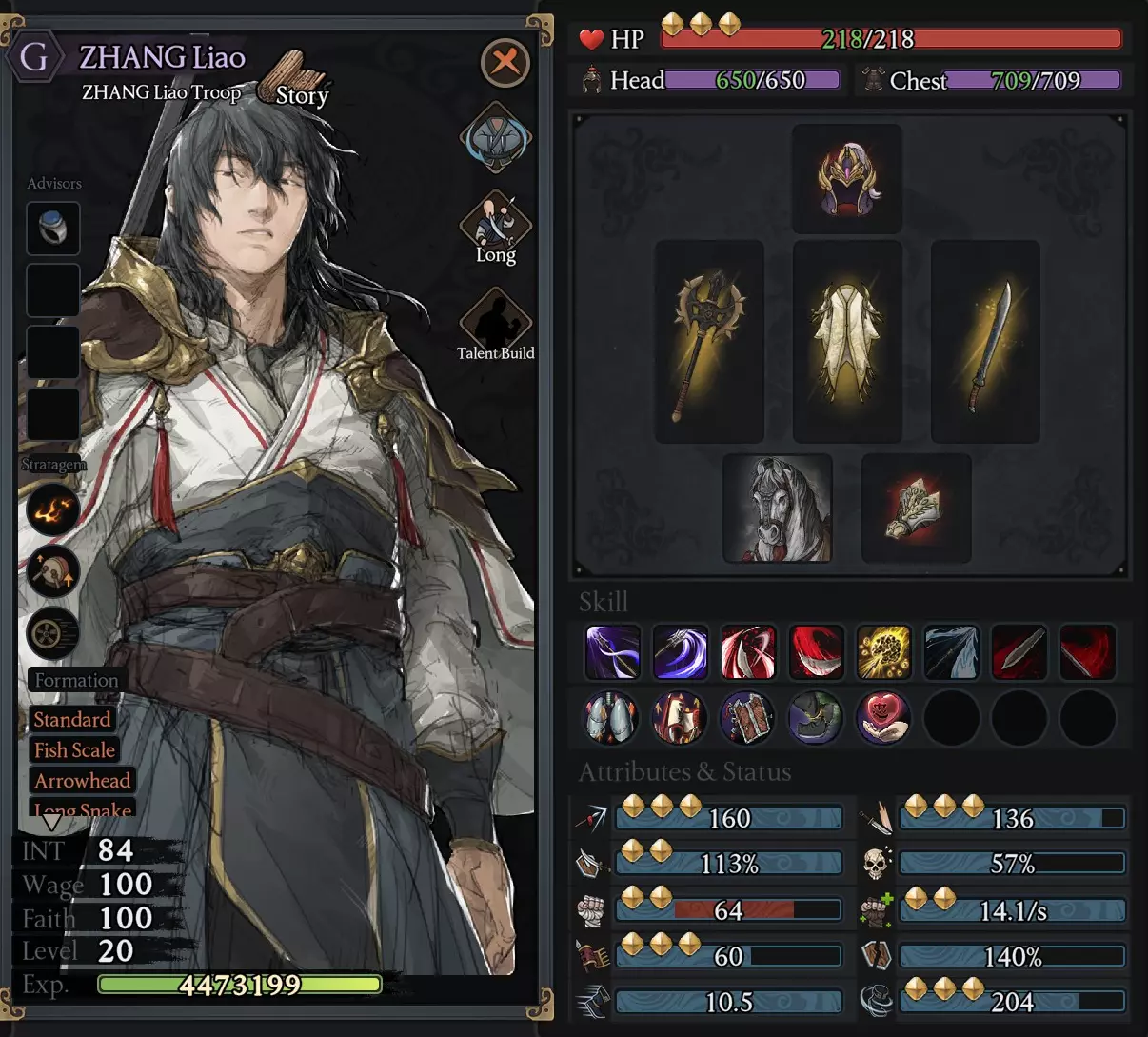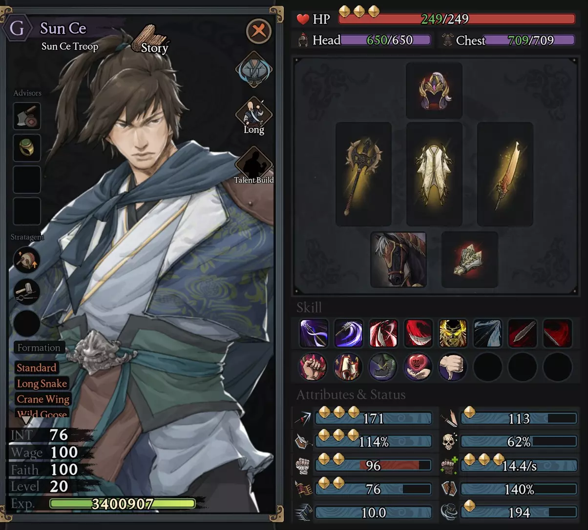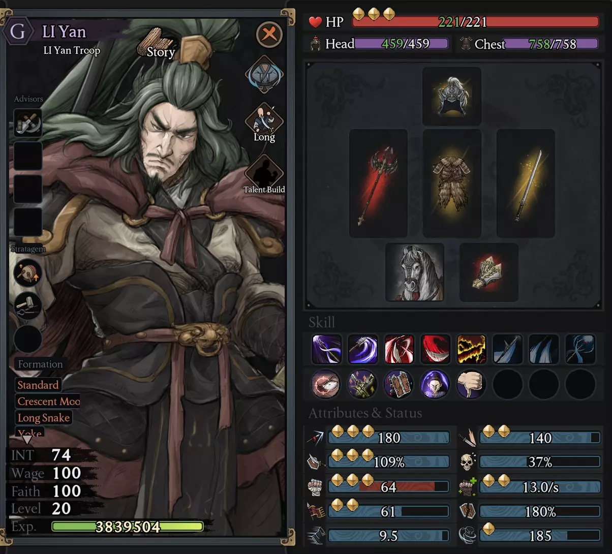 最佳的build是格挡build,格挡值会决定受到攻击时的防御概率。它会使武器性能略微下降,但总比直接承受攻击要好。当格挡值达到100就足够了,不需要再高于这个数值。每当敌人攻击时,我们的角色都能一直进行格挡,从而大幅节省盔甲的维修费用。(但使用格挡武器其实比一直穿盔甲更省资源)如果问会不会被围攻致死,答案是会的。特别是当你被敌人团困住无法脱身时,情况会从被围攻开始,直到武器的格挡值耗尽,然后盔甲受损、生命值下降。不过,这个数值越接近100,角色就会变得越强。尤其是像吕布这样优秀的无双武将,可以骑马使用范围技能后下马,等待冷却时间再使用新招式,如此反复直到敌人全部被消灭(或者武器损坏)。在战斗中,派他们到哪个战线,就能在该战线长时间支援队友,即便是那些能力较差的士兵,只要格挡率超过50%也能坚持很长时间。无需用力亲自攻击(让军队使用横扫技能)即可大幅降低受伤率。这个数值来自哪里?1. 角色的基础潜力取决于格挡栏的金星,如果你每级都提升这个数值……1. 角色等级达到20级时,0-1星角色的数值为20;2星角色的数值为40;3星角色的数值为60。 2. 技能(天赋)方面,升级4阶技能LW(+10)和3阶技能Dao(+10)。 3. 部分高阶的身体 armor 和头部 armor 会增加格挡值,具体为+5、+10、+20,但也有不少会减少格挡值,如-5、-10。部分武器,例如红刀,会减少50点格挡值。在战斗准备界面进行阵型配置时,高等级的武将通常拥有较好的阵型,例如八卦阵(Eight Trigrams)。 5. 其他方面,例如特性+5格挡。 部分拥有3颗格挡金星的精锐部队,可将格挡值培养至90-100以上。 拥有3颗格挡金星的普通士兵,建议将格挡值培养至70-80以上。 --------------------------------------------------------------------------- 问:角色没有终极技能(Ultimate skill)可以通过培养获得吗?A:可以通过使用技能卷轴来练习,该卷轴从我方已使用过该技能且达到1级的军队中掉落,每人只能掉落3次。 Q:如何重置技能点 A:可以使用黄色水晶进行重置,黄色水晶通常来自以下途径:1. 挑战秘境 2. 摧毁贼巢 3. 参与战争并取得良好表现 4.从不同的氏族兑换 问:不小心使用了技能卷轴/升级错了技能怎么办? 答:您可以在不使用那个卷轴的情况下完成游戏,所以不要太在意,黄色水晶也是如此。未来您将有机会不断获得它们,如图所示。