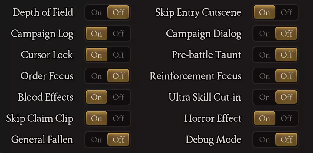 推荐以下设置调整以获得流畅的游戏体验: - 重要的是关闭【General Fallen】,如果你不想让军队覆灭。当军队不会覆灭时,这将确保你的游戏能够持续顺利进行。 - 开启【skip entry cutscene】,否则每次进入领主宅邸时都会遇到士兵对话场景(整个游戏中你会频繁进入)。关闭右侧的2-5选项,以关闭战斗中的对话、支援部队出现时的对话(这些会让我们的屏幕来回切换),还可以关闭使用奥义时的特效(如果没什么特别的,在初期战斗中你可以开启来看看他们互相嘲讽,挺有趣的,但当你需要在一场战争中进行多次战斗时就关掉吧,听一次就够了)