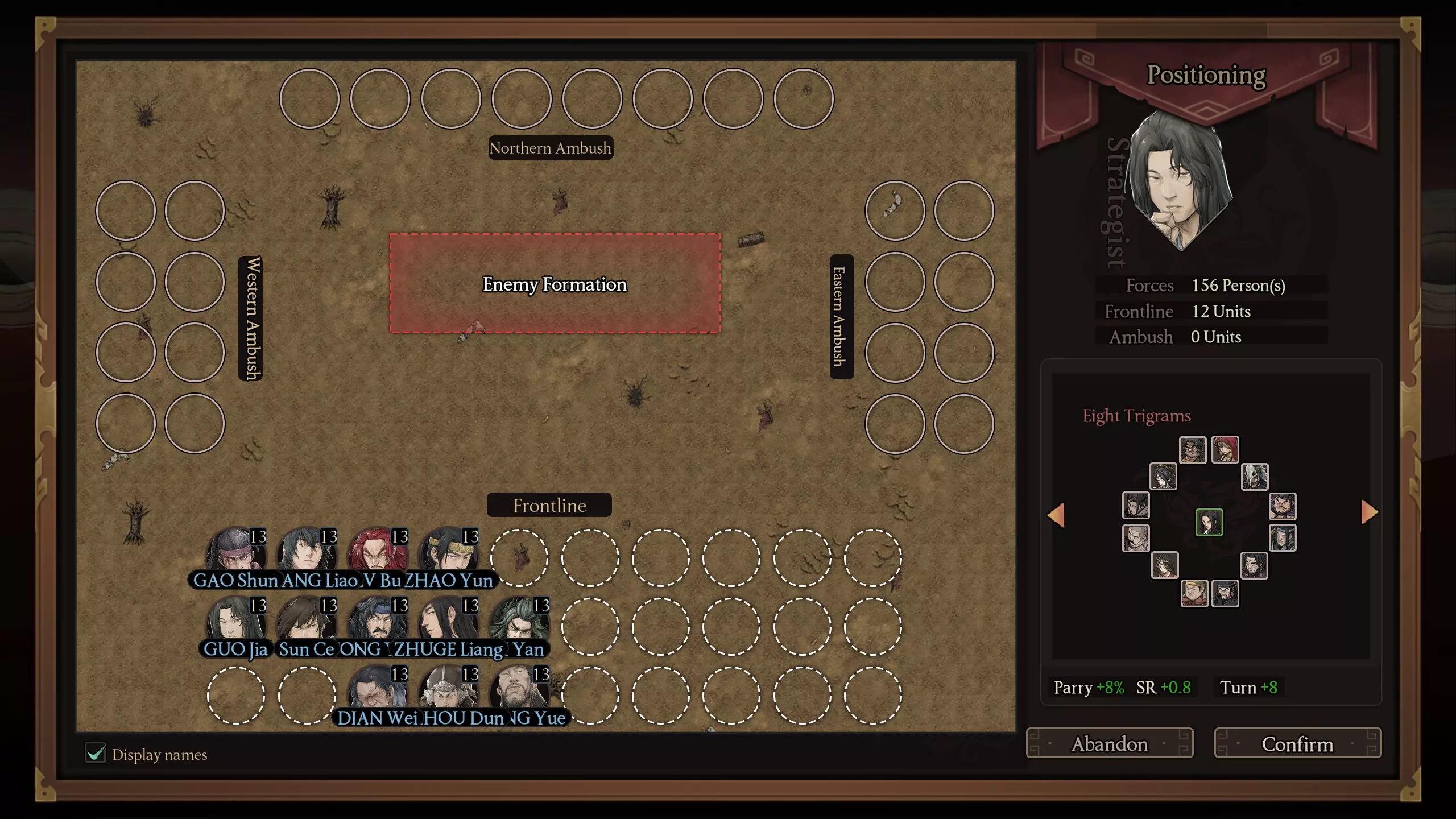 举例说明设置方法如下:假设【朱儁】正在攻击一个低阶敌人(优先级2-4),此时又有3个敌方部队和低阶士兵在射程内接近。【朱儁】不会立即攻击新出现的敌方部队,因为需要先处理完原本的低阶敌人(原目标)。一旦处理完毕,将根据上述优先级表重新选择目标。因此,朱儁将再无视3名敌方士兵,然后选择锁定攻击下一名敌方将领,以此类推。如前所述,在布阵界面中,您可以设置部队从侧面或后方发动突袭。这些主要用于以下策略:让单个高敏捷的士兵作为诱饵,吸引部分敌军追击,使您的主力部队不必一次性面对所有敌人。