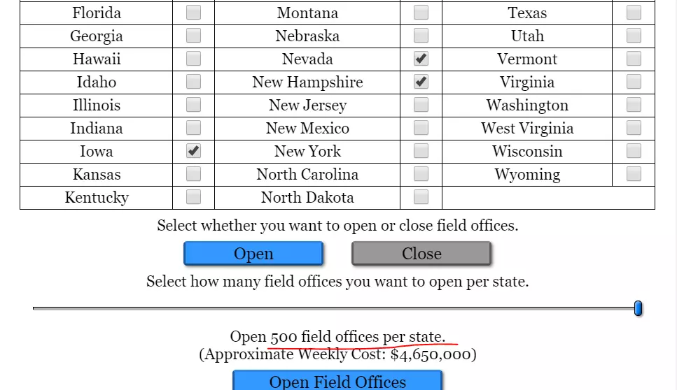 特朗普总统对其医疗保健计划态度模糊,尽管多年前他的观点相当明确。这种模糊性是一把双刃剑,它会让人们怀疑你的能力,但同时也能让你采取最符合自身目标的立场。 “风中之苇,柔而不折;暴风中的巨橡,刚而易断。”——孔子 【游戏玩法】初选:夸下海口 至少可以说,希拉里·克林顿是一位颇具争议的政客。不过我确实认为,针对围绕她的种种争议,她对伯尼·桑德斯的问题描述得很到位: “你必须对自己所说的话和承诺要做的事负责。我们需要重建美国同胞之间以及对我们机构的信任。”“如果你承诺了遥不可及的目标却无法兑现,那只会成为我们彼此间难以信任的又一个证明。” 在这款游戏中,我们这些“纸上谈兵”的政客们都知道,我们可以许下不切实际的诺言。 通用提示: 拥有私人观点和公开观点。作为政客,撒谎是可以接受的! 民主党候选人应选择社会和财政方面的自由派预设。 共和党候选人应选择保守派预设。 围绕政党支持的正统议题(且是优先议题)展开竞选活动。 攻击对手以避免热情度下降。作为共和党人,我总是通过攻击对手的税收政策来维持热情度并赢得公众支持。 既要赢得支持,也要保持受欢迎度。 前期游戏: 筹集资金并参加每一场辩论。选择传统的答案(始终选择最热门的那个) 你在阿肯色州没有知名度。你需要在爱荷华州、新罕布什尔州、内华达州、南卡罗来纳州以及超级星期二I的各州获得知名度。 在所有4个初选起始地区雇佣所有志愿者,并始终进行上门拜访。 需要大量微操,但要在初选中的每个即将到来的州进行营销。 【游戏流程】示例:王者归来 认识卡拉布·阿马博,他是哈佛大学毕业生,是共和党的温和派。我将新罕布什尔州翻红,并且曾是该州的州长和参议员。我会以55%的得票率让他以(温和派,温和派)的身份在新罕布什尔州获胜。这家伙是个相当冷静的人,但在共和党初选中却陷入困境。温和派共和党人(RINO)行不通……除非他们撒谎。