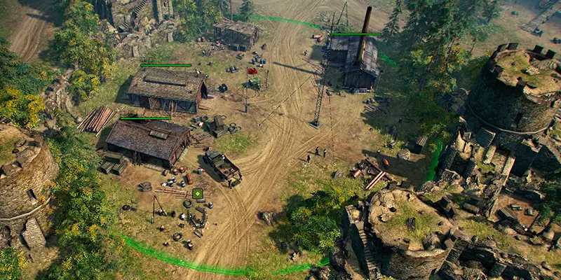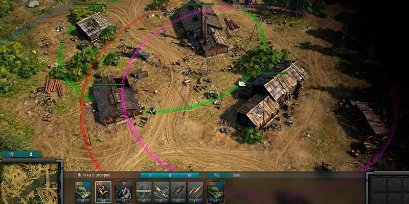在部署防御时,守住控制点至关重要——不要让敌人占领它们!可以直接在基地部署防御工事。位于敌军单位视野范围外的迫击炮,有助于更快取得胜利。防御时不要忘记使用榴弹炮以及防坦克壕来压制敌人的进攻。 请注意,【突击】模式分为两种不同的子模式。具体如下: 1)【玩家突袭】,在此模式下你将与其他玩家进行对战(PvP)。 2)【基地突袭】,在此模式下你的对手为人工智能(PvE)。 【基地突袭】也常被称为异步模式(相对而言,【玩家突袭】则为同步模式)。 下面解释这些术语的由来。同步模式指的是一场战斗中有两名玩家参与,即他们以“同步”方式进行游戏。在异步模式下,一名玩家进攻另一名玩家的基地,但此时对方玩家并不在线,由人工智能代为防守。人工智能指挥基地的部队,努力保卫防御区域。与真人玩家一样,它会在战斗中使用支援技能,派遣步兵占领建筑物。因此,您的基地永远不会闲置——无论您是否在线,基地上都会持续发生战斗。 4. 战术建议 现在是战术建议时间! 1) 不要在战斗开始前将所有储备点数都用于招募部队。保留90点储备点数将帮助您在战斗初期夺取控制点。 2) 不要忘记让步兵躲藏在建筑物或树林带中!在部署士兵时,你会看到他们周围有2个或3个不同半径的圆圈。蓝色圆圈是视野范围。红色圆圈表示攻击范围。紫色圆圈(仅当步兵隐蔽在树林中时显示)是敌方单位发现你部队的范围。