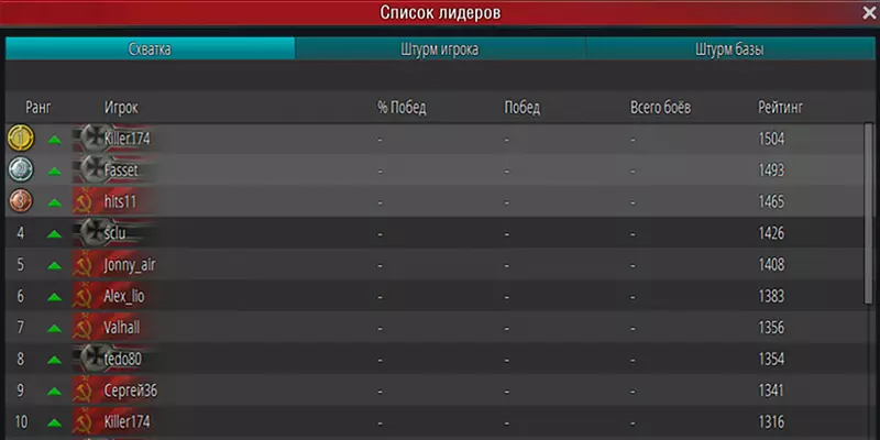 小面板上用数字显示了您在以下方面的等级: 1) 遭遇战 2) 玩家突袭 3) 基地突袭 点击小面板,您将看到上述类别的玩家排行榜。