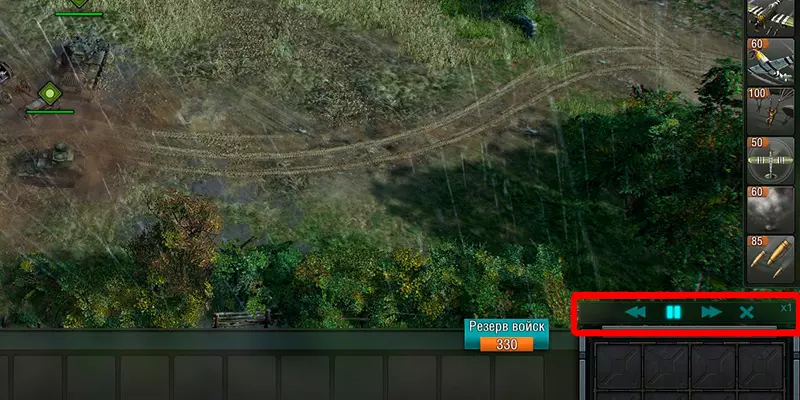 让我们详细了解一下最后一个指标。 【击毁倍率】以补给点数计算,而非击毁的单位数量。毕竟,击毁一辆虎式坦克和击毁一辆T-70坦克的意义是不同的。 【伤亡数】显示的是您在战斗中投入的兵力数量。因此,通过比较第1列和第2列的数据,您可以计算出自己的战斗效率。 您还能看到在战斗中造成的总伤害量。若要查看回放,您需要进入战斗报告,选择您感兴趣的战斗并点击【观看回放】。您可以对回放进行加速、减速和暂停操作。点击叉号即可结束观看。时间控制面板位于支援列表的正下方。