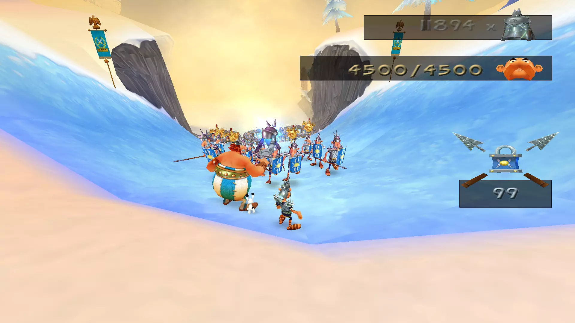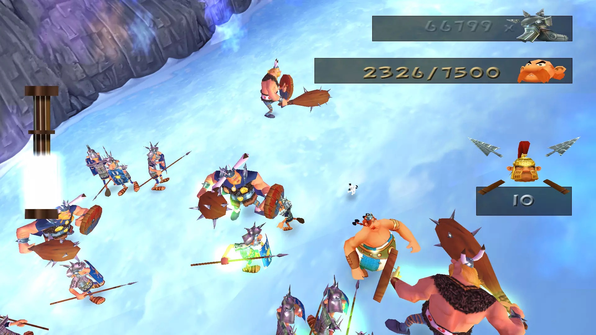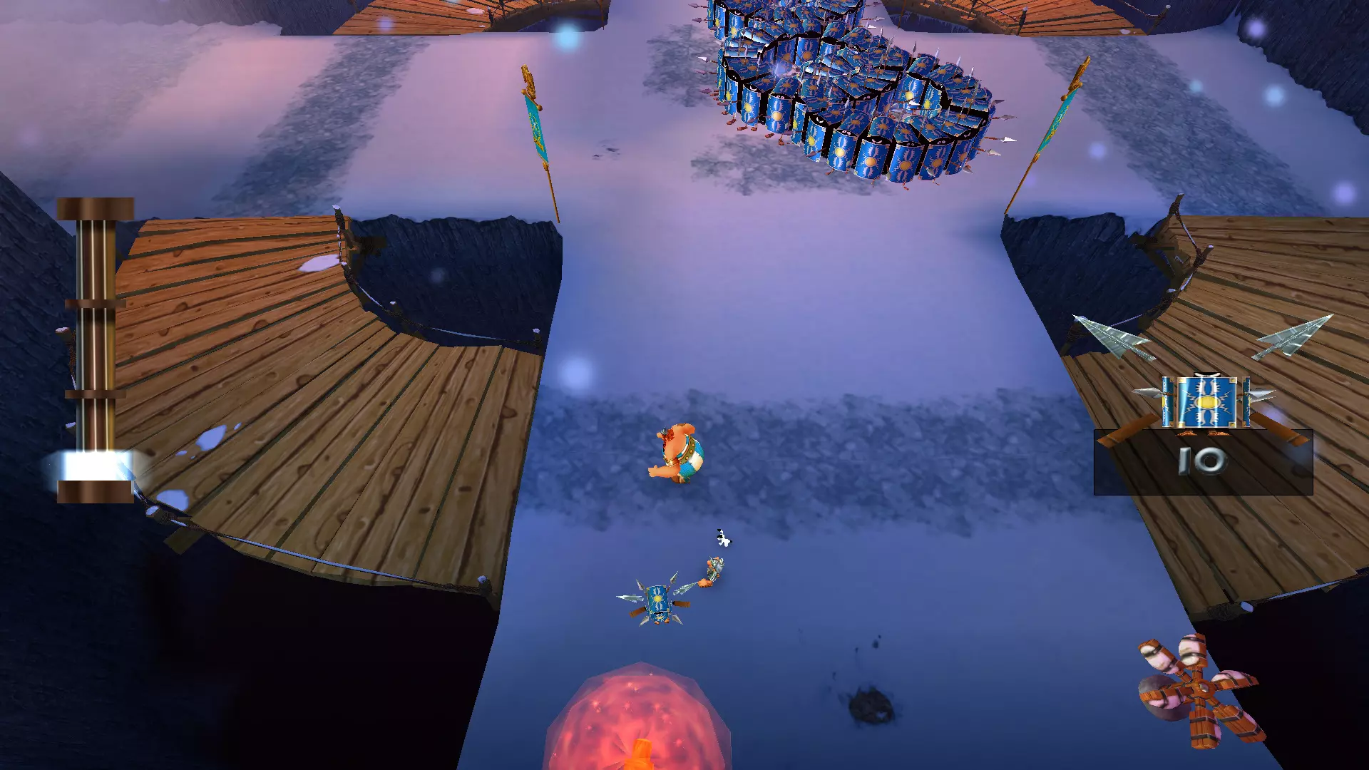 从斜坡滑下和乘船航行 那些曾在战斗前起到某种缓冲作用的滑行环节,如今已变成了一场生存竞速。更别提还要收集4500顶头盔,而在原作中返回途中只需收集1500顶,如果我没记错的话。 似乎这还不够,你还得在欢快的圣诞音乐声中,在下滑过程中痛扁100名罗马士兵。下面有罗马“乌龟阵”,所以如果太往下掉就会立刻死亡,比赛也得重新开始