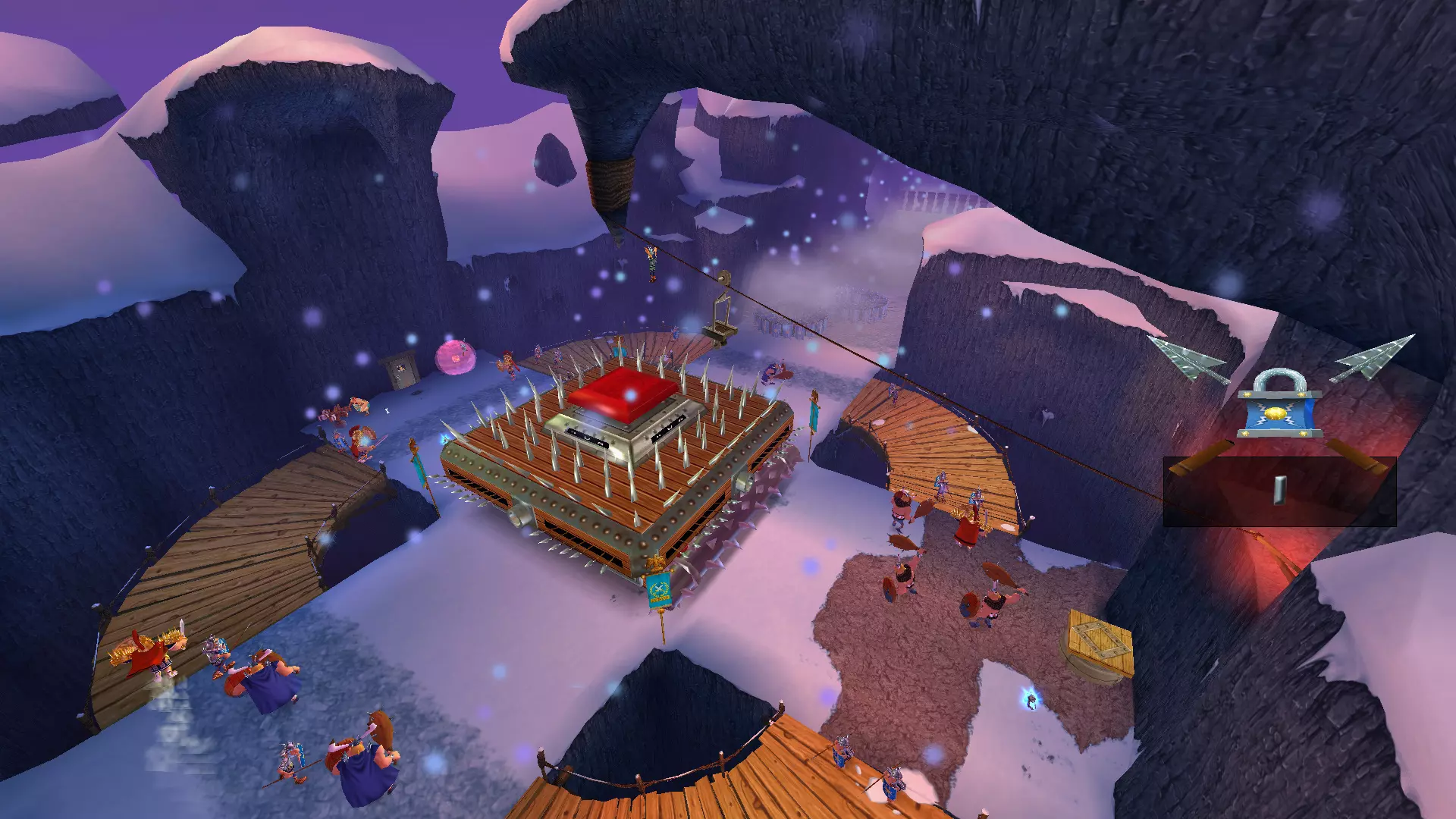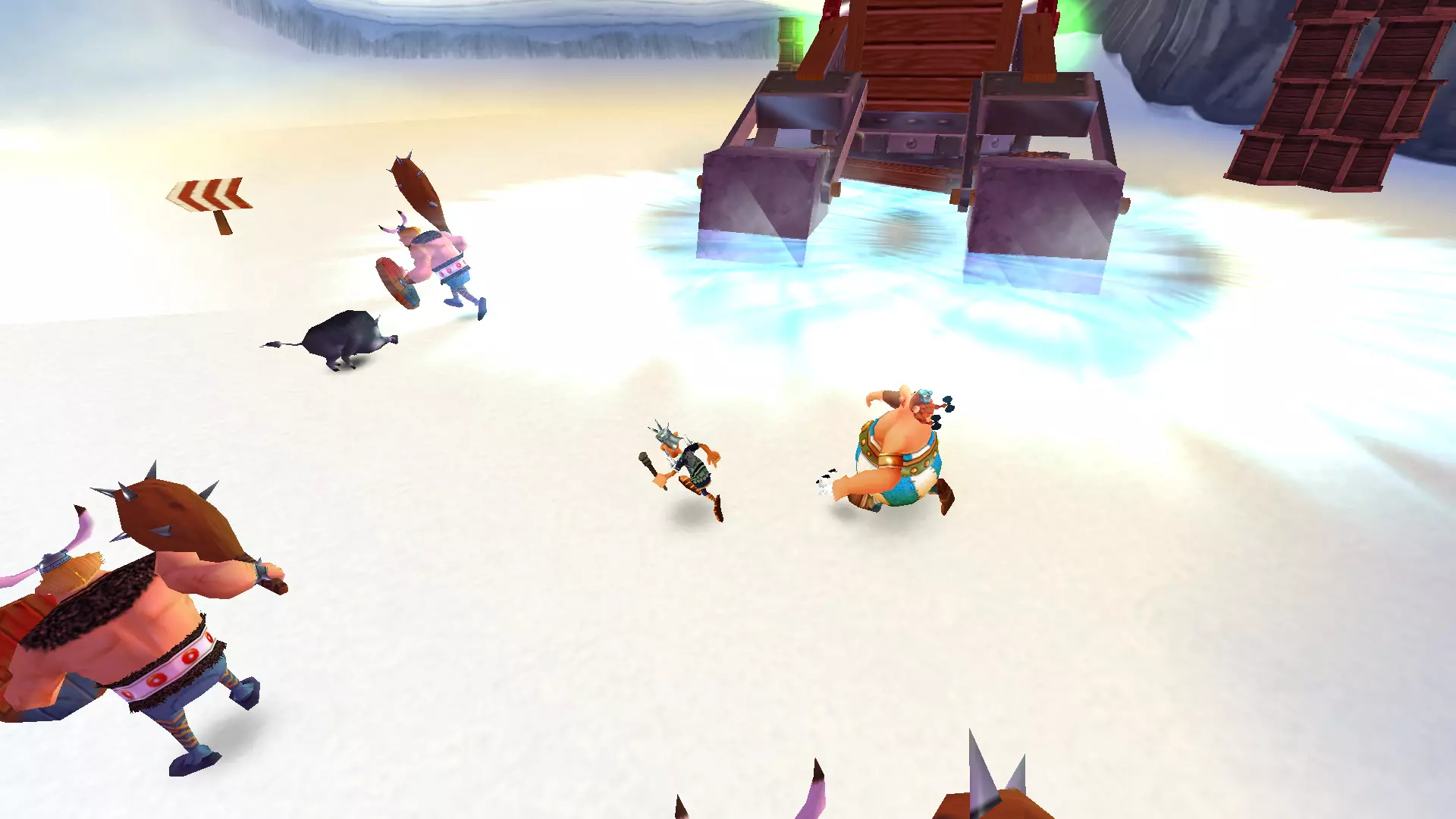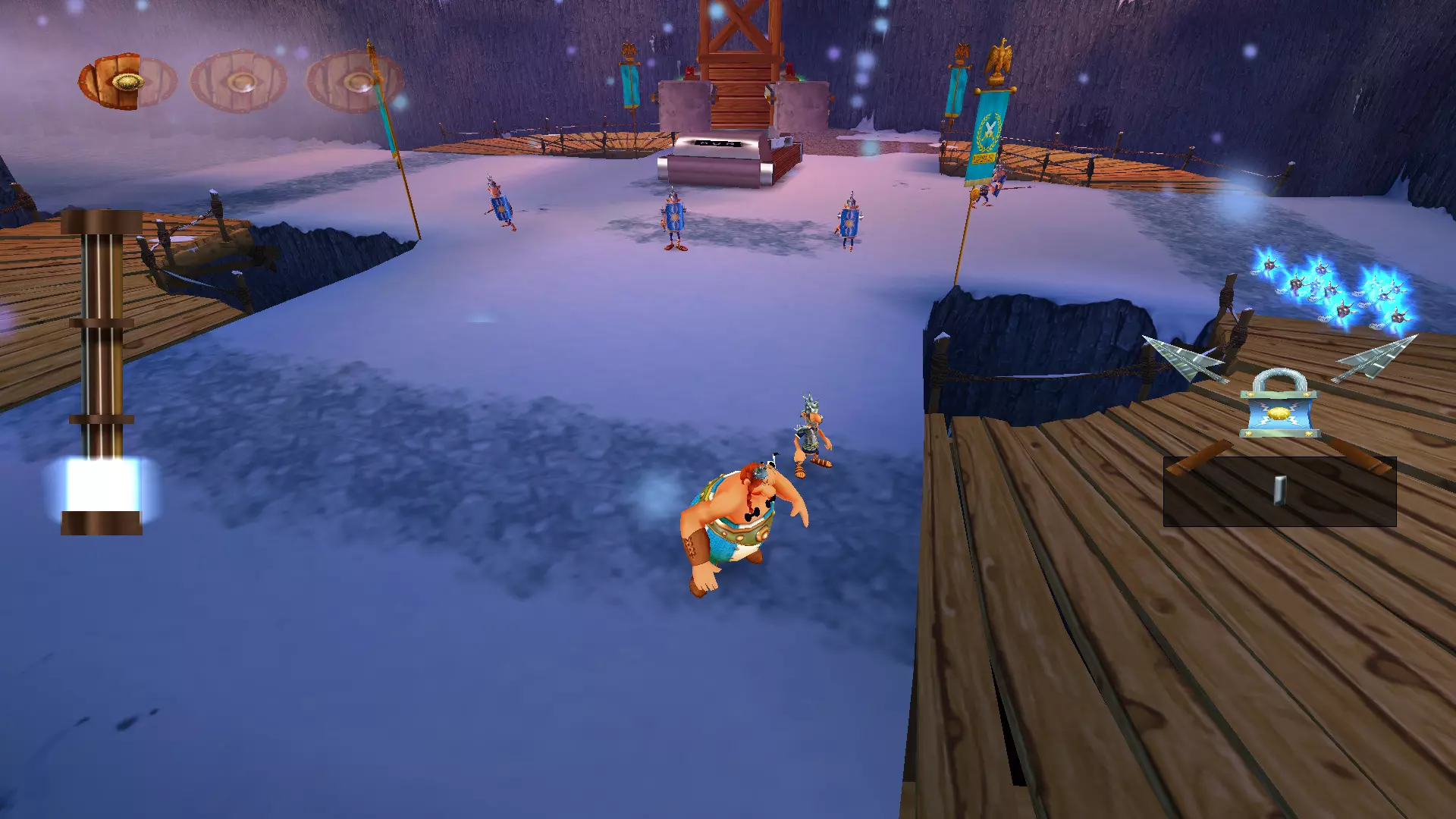 从斜坡滑下和乘船航行 那些曾在战斗前起到某种缓冲作用的滑行环节,如今已变成了一场生存竞速。更别提还要收集4500顶头盔,而在原作中返回途中只需收集1500顶,如果我没记错的话。 似乎这还不够,你还得在欢快的圣诞音乐声中,在下滑过程中痛扁100名罗马士兵。下面有罗马“乌龟阵”,所以如果太往下掉就会立刻死亡,比赛也得重新开始