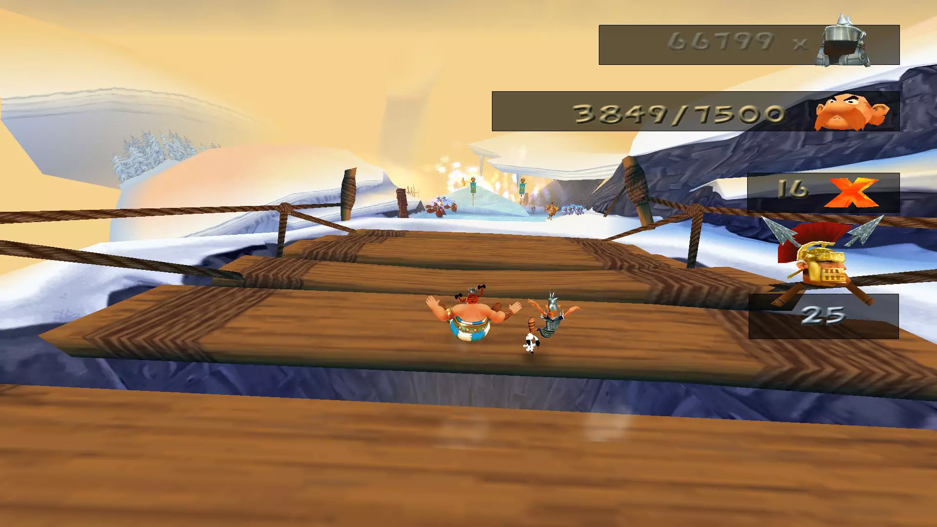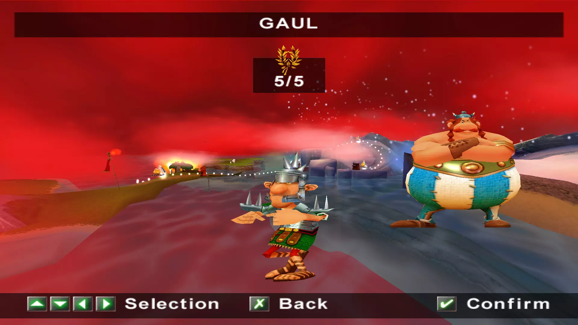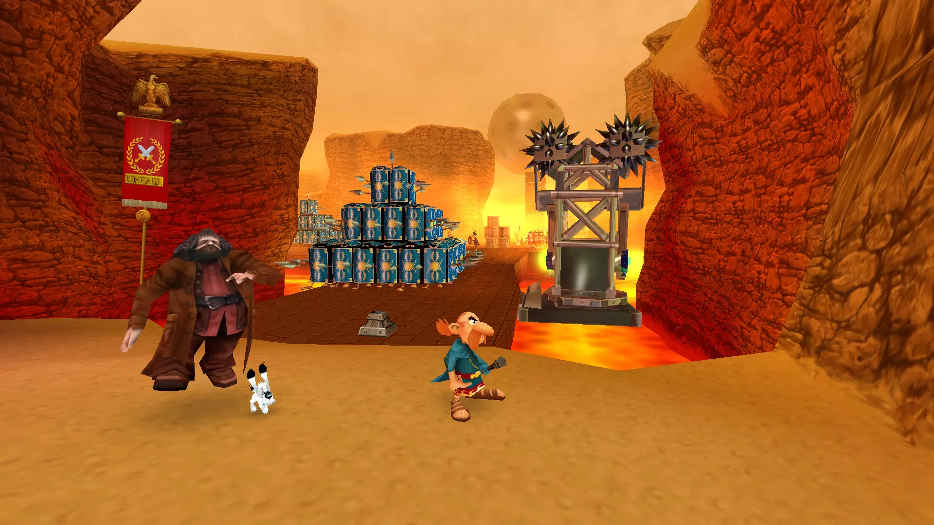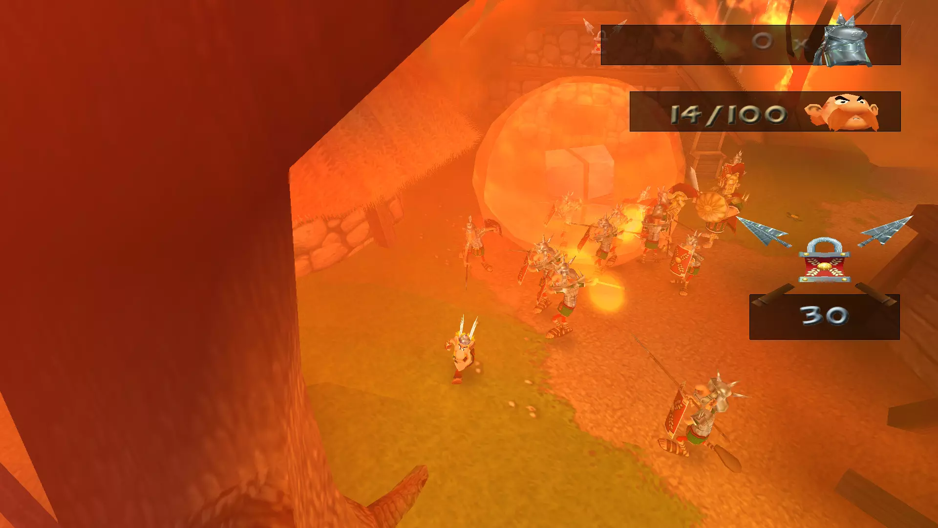 一天,阿斯特里克斯和奥贝利克斯像往常一样散步,决定去拜访他们的朋友——德鲁伊狄阿贝蒂克斯,他懂得如何治疗肥胖,他们想向他要些胰岛素。后来,一队罗马士兵袭击了他们,要求他们交出财物。但高卢人决定不听从,像往常一样把他们痛扁了一顿。没把这事太放在心上的两位英雄随后前往埃及。另一位德鲁伊沃米蒂克斯(Vomitix)在那里等着他们,准备检查奥贝利克斯的健康状况。之后,阿斯特里克斯在尼罗河中泡澡,没有注意到这位壮汉不见了。他和伊德菲克斯开始琢磨奥贝利克斯可能去了哪里。原来是奥布莱利克斯搞的鬼!他是奥贝利克斯邪恶的双胞胎兄弟,出生时就被人叫做“笨蛋”,是他把奥贝利克斯关进了笼子。绝望的奥贝利克斯的希望,就掌握在阿斯特里克斯手中。奥贝利克斯回到埃及并重新加入,但阿斯特里克斯甚至没有怀疑朋友被调包了。 与此同时,间谍山姆在希腊发动了共产主义革命,旨在推翻当地领袖卡皮塔利斯特克斯。他改名为塞缪尔,换了衣服,闯入了暴君的住所。他杀死了卡皮塔利斯特克斯,成为希腊新的法西斯独裁者,并将死者的所有财富据为己有。莫布斯博士用在自己胡子里找到的维度钥匙释放了古老的邪恶力量Microids。该机构的秘书正在教莫布斯博士一种未知的魔法。之后,他对凯撒的军队施了魔法,赋予他们各种正面和负面的效果。凯撒本人在高卢的深处发现了一个装满尖刺球的容器。他将这些尖刺球遍布整个地区,以阻碍阿斯特克斯。回到罗马后,凯撒找到了一种通过“近亲繁殖”战术来增加军队数量的新方法,这使得士兵数量在短短几个月内增加了十倍。他将这些士兵派往了不同的国家。 塞缪尔向崇拜球体的东正教会求助,想了解一些咒语,但在此之前神父拒绝了他。然而,塞米尤埃尔说服了他,向他展示了如何通过一种被称为“重制艺术”的方式在短时间内迅速致富。最后,他念动咒语,将阿斯特里克斯和奥贝利克斯传送回了高卢。我们的冒险就此开始。 哇,这可真是有趣的胡闹啊))))他们调侃了Microids和重制这个话题。而且,从游戏来看,似乎每个大陆通关后都会有这样的剧情过场。各种杂七杂八的事 我们终于到了核心地带。首先映入眼帘的是一段简短的过场动画,展示了高卢村庄被烧毁的景象: 一开始就有不少敌人,这一点非常显眼。