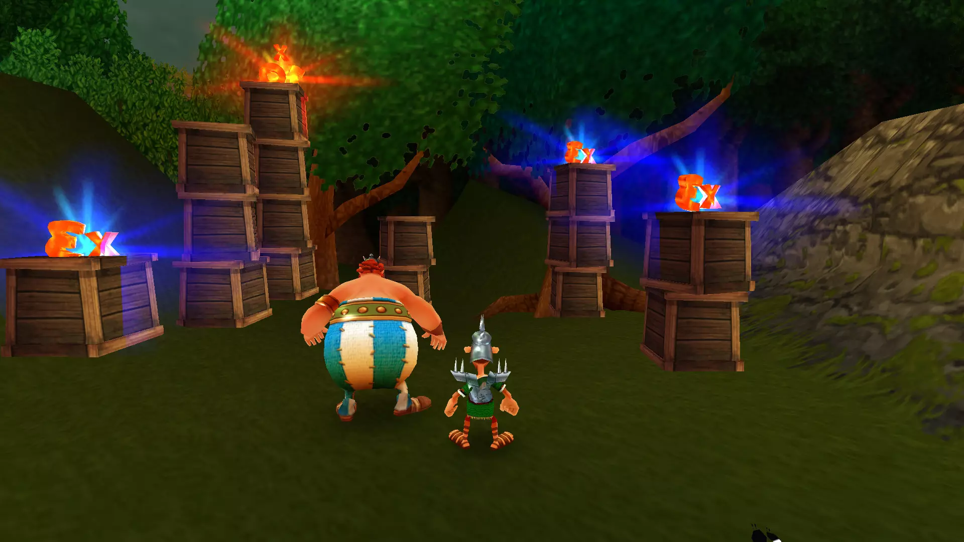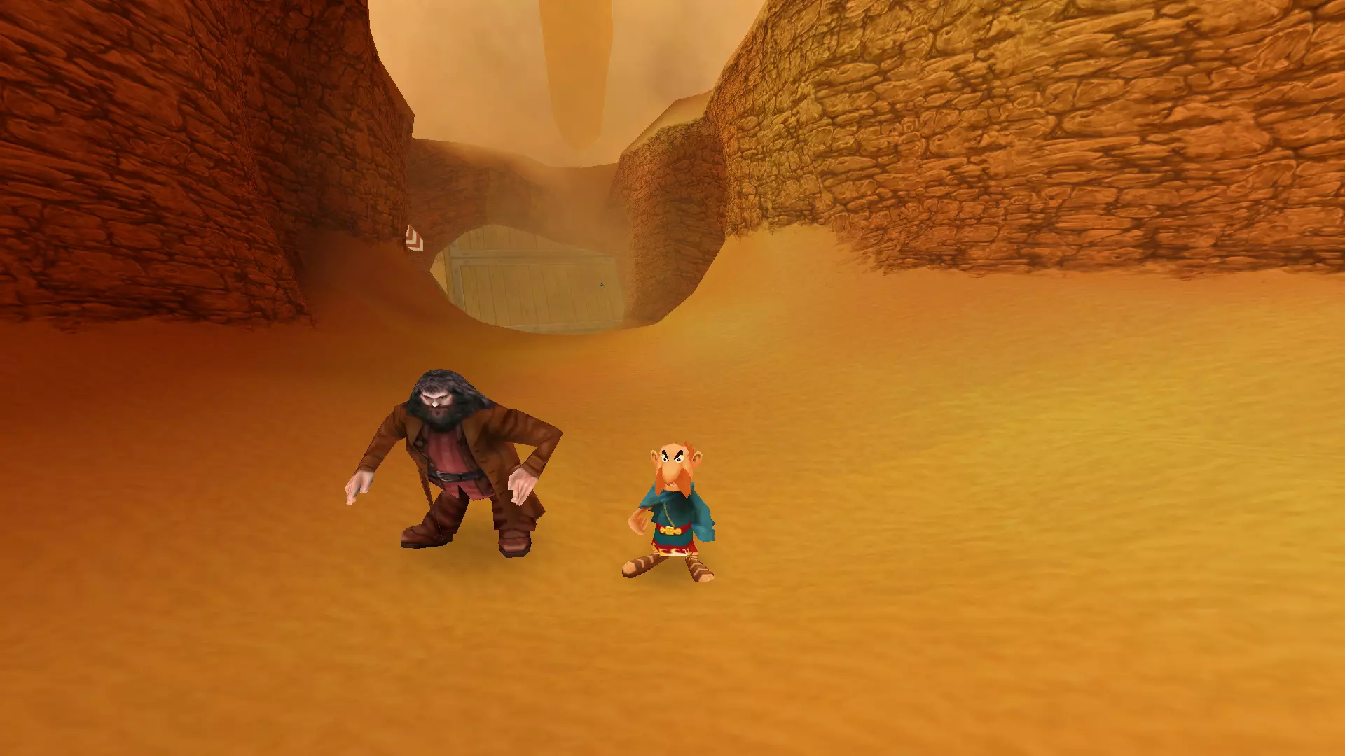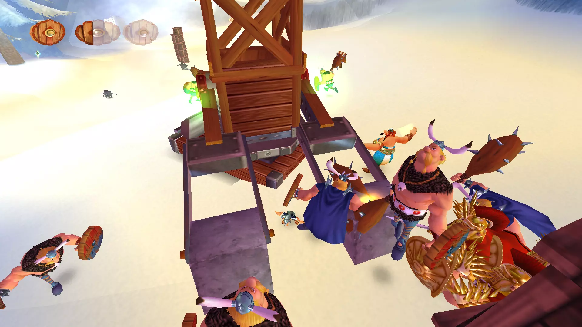 一天,阿斯特里克斯和奥贝利克斯像往常一样散步,决定去拜访他们的朋友——德鲁伊狄阿贝蒂克斯,他懂得如何治疗肥胖,他们想向他要些胰岛素。后来,一队罗马士兵袭击了他们,要求他们交出财物。但高卢人决定不听从,像往常一样把他们痛扁了一顿。没把这事太放在心上的两位英雄随后前往埃及。另一位德鲁伊沃米蒂克斯(Vomitix)在那里等着他们,准备检查奥贝利克斯的健康状况。之后,阿斯特里克斯在尼罗河中泡澡,没有注意到这位壮汉不见了。他和伊德菲克斯开始琢磨奥贝利克斯可能去了哪里。原来是奥布莱利克斯搞的鬼!他是奥贝利克斯邪恶的双胞胎兄弟,出生时就被人叫做“笨蛋”,是他把奥贝利克斯关进了笼子。绝望的奥贝利克斯的希望,就掌握在阿斯特里克斯手中。奥贝利克斯回到埃及并重新加入,但阿斯特里克斯甚至没有怀疑朋友被调包了。 与此同时,间谍山姆在希腊发动了共产主义革命,旨在推翻当地领袖卡皮塔利斯特克斯。他改名为塞缪尔,换了衣服,闯入了暴君的住所。他杀死了卡皮塔利斯特克斯,成为希腊新的法西斯独裁者,并将死者的所有财富据为己有。莫布斯博士用在自己胡子里找到的维度钥匙释放了古老的邪恶力量Microids。该机构的秘书正在教莫布斯博士一种未知的魔法。之后,他对凯撒的军队施了魔法,赋予他们各种正面和负面的效果。凯撒本人在高卢的深处发现了一个装满尖刺球的容器。他将这些尖刺球遍布整个地区,以阻碍阿斯特克斯。回到罗马后,凯撒找到了一种通过“近亲繁殖”战术来增加军队数量的新方法,这使得士兵数量在短短几个月内增加了十倍。他将这些士兵派往了不同的国家。 塞缪尔向崇拜球体的东正教会求助,想了解一些咒语,但在此之前神父拒绝了他。然而,塞米尤埃尔说服了他,向他展示了如何通过一种被称为“重制艺术”的方式在短时间内迅速致富。最后,他念动咒语,将阿斯特里克斯和奥贝利克斯传送回了高卢。我们的冒险就此开始。 哇,这可真是有趣的胡闹啊))))他们调侃了Microids和重制这个话题。而且,从游戏来看,似乎每个大陆通关后都会有这样的剧情过场。各种杂七杂八的事 我们终于到了核心地带。首先映入眼帘的是一段简短的过场动画,展示了高卢村庄被烧毁的景象: 一开始就有不少敌人,这一点非常显眼。