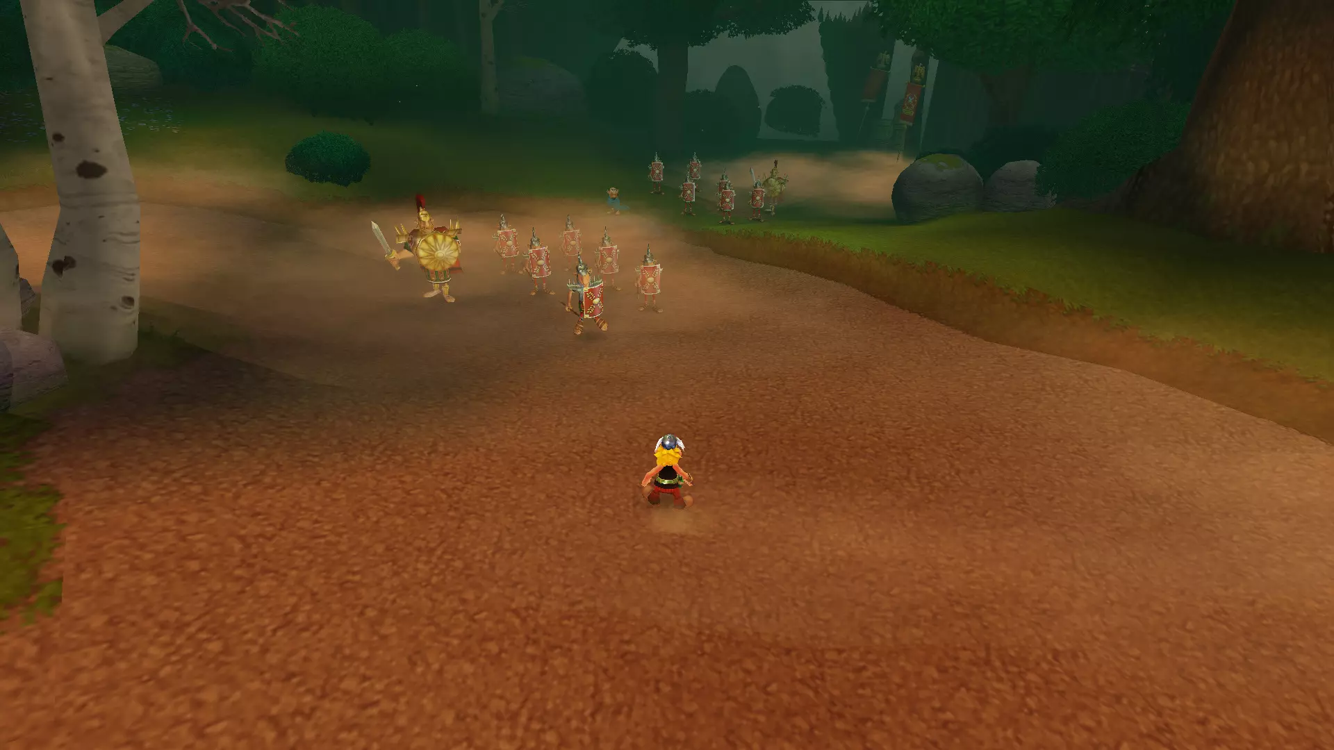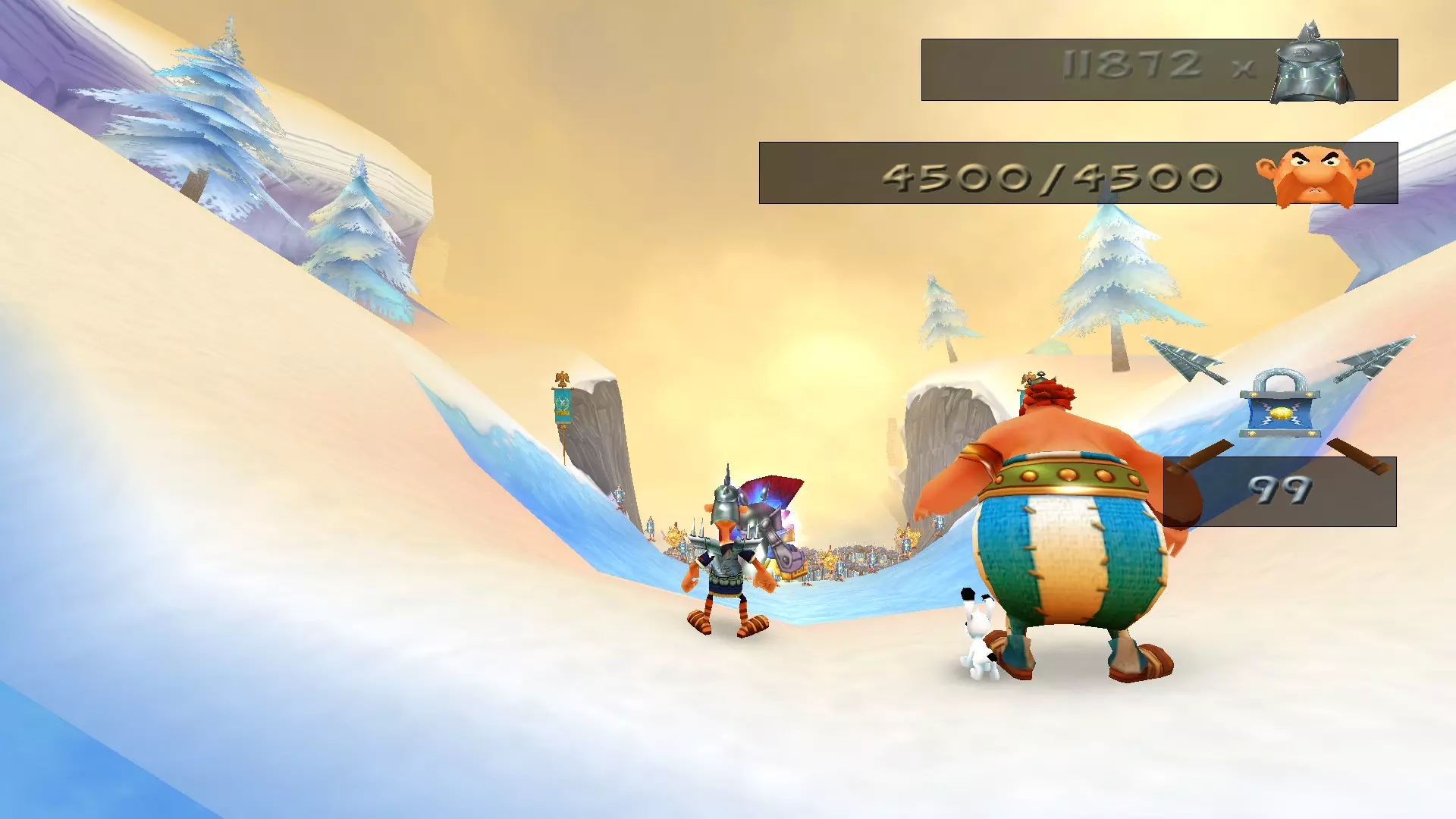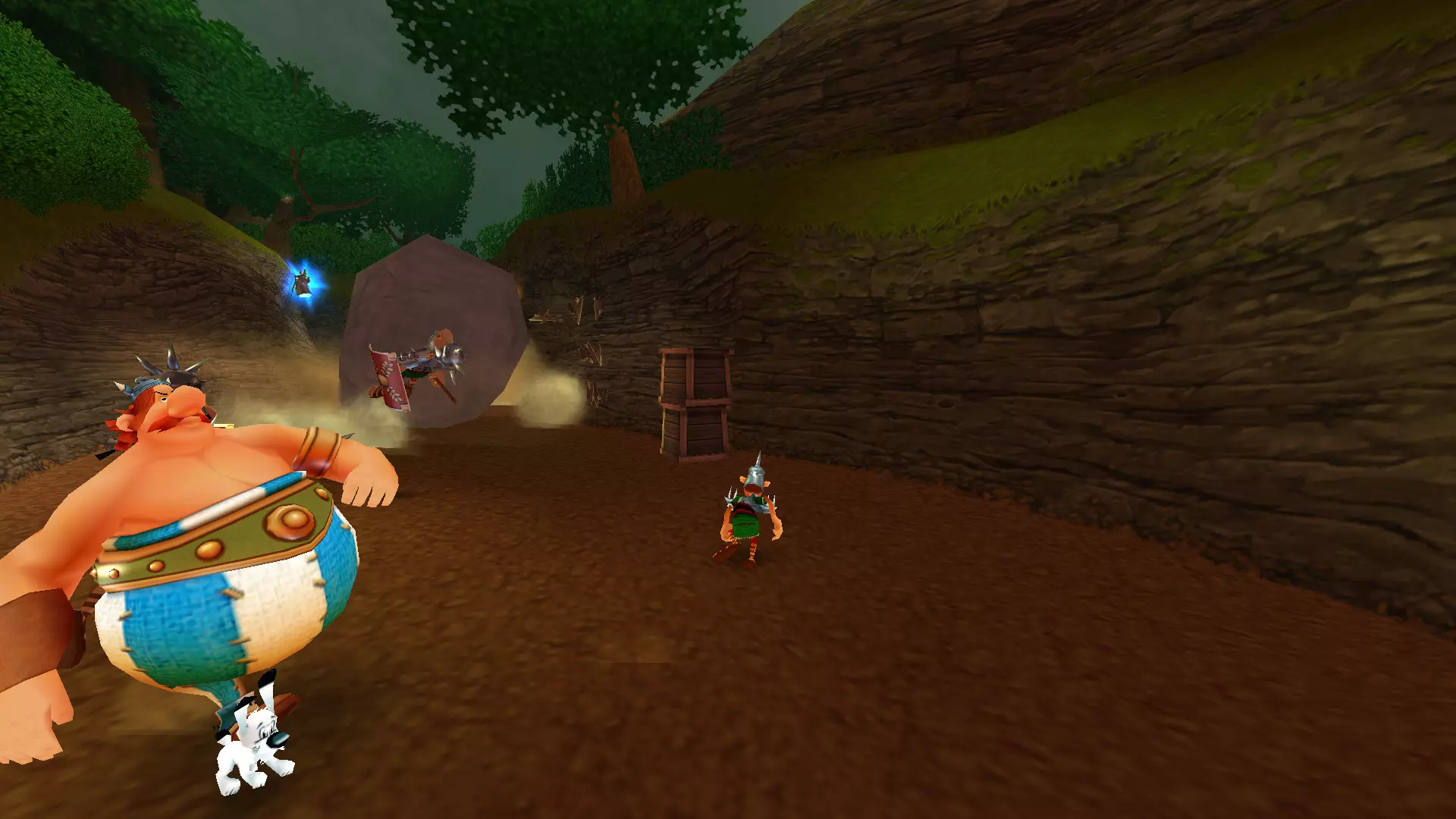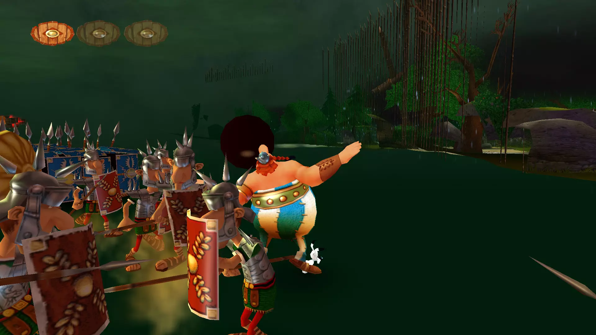 一天,阿斯特里克斯和奥贝利克斯像往常一样散步,决定去拜访他们的朋友——德鲁伊狄阿贝蒂克斯,他懂得如何治疗肥胖,他们想向他要些胰岛素。后来,一队罗马士兵袭击了他们,要求他们交出财物。但高卢人决定不听从,像往常一样把他们痛扁了一顿。没把这事太放在心上的两位英雄随后前往埃及。另一位德鲁伊沃米蒂克斯(Vomitix)在那里等着他们,准备检查奥贝利克斯的健康状况。之后,阿斯特里克斯在尼罗河中泡澡,没有注意到这位壮汉不见了。他和伊德菲克斯开始琢磨奥贝利克斯可能去了哪里。原来是奥布莱利克斯搞的鬼!他是奥贝利克斯邪恶的双胞胎兄弟,出生时就被人叫做“笨蛋”,是他把奥贝利克斯关进了笼子。绝望的奥贝利克斯的希望,就掌握在阿斯特里克斯手中。奥贝利克斯回到埃及并重新加入,但阿斯特里克斯甚至没有怀疑朋友被调包了。 与此同时,间谍山姆在希腊发动了共产主义革命,旨在推翻当地领袖卡皮塔利斯特克斯。他改名为塞缪尔,换了衣服,闯入了暴君的住所。他杀死了卡皮塔利斯特克斯,成为希腊新的法西斯独裁者,并将死者的所有财富据为己有。莫布斯博士用在自己胡子里找到的维度钥匙释放了古老的邪恶力量Microids。该机构的秘书正在教莫布斯博士一种未知的魔法。之后,他对凯撒的军队施了魔法,赋予他们各种正面和负面的效果。凯撒本人在高卢的深处发现了一个装满尖刺球的容器。他将这些尖刺球遍布整个地区,以阻碍阿斯特克斯。回到罗马后,凯撒找到了一种通过“近亲繁殖”战术来增加军队数量的新方法,这使得士兵数量在短短几个月内增加了十倍。他将这些士兵派往了不同的国家。 塞缪尔向崇拜球体的东正教会求助,想了解一些咒语,但在此之前神父拒绝了他。然而,塞米尤埃尔说服了他,向他展示了如何通过一种被称为“重制艺术”的方式在短时间内迅速致富。最后,他念动咒语,将阿斯特里克斯和奥贝利克斯传送回了高卢。我们的冒险就此开始。 哇,这可真是有趣的胡闹啊))))他们调侃了Microids和重制这个话题。而且,从游戏来看,似乎每个大陆通关后都会有这样的剧情过场。各种杂七杂八的事 我们终于到了核心地带。首先映入眼帘的是一段简短的过场动画,展示了高卢村庄被烧毁的景象: 一开始就有不少敌人,这一点非常显眼。