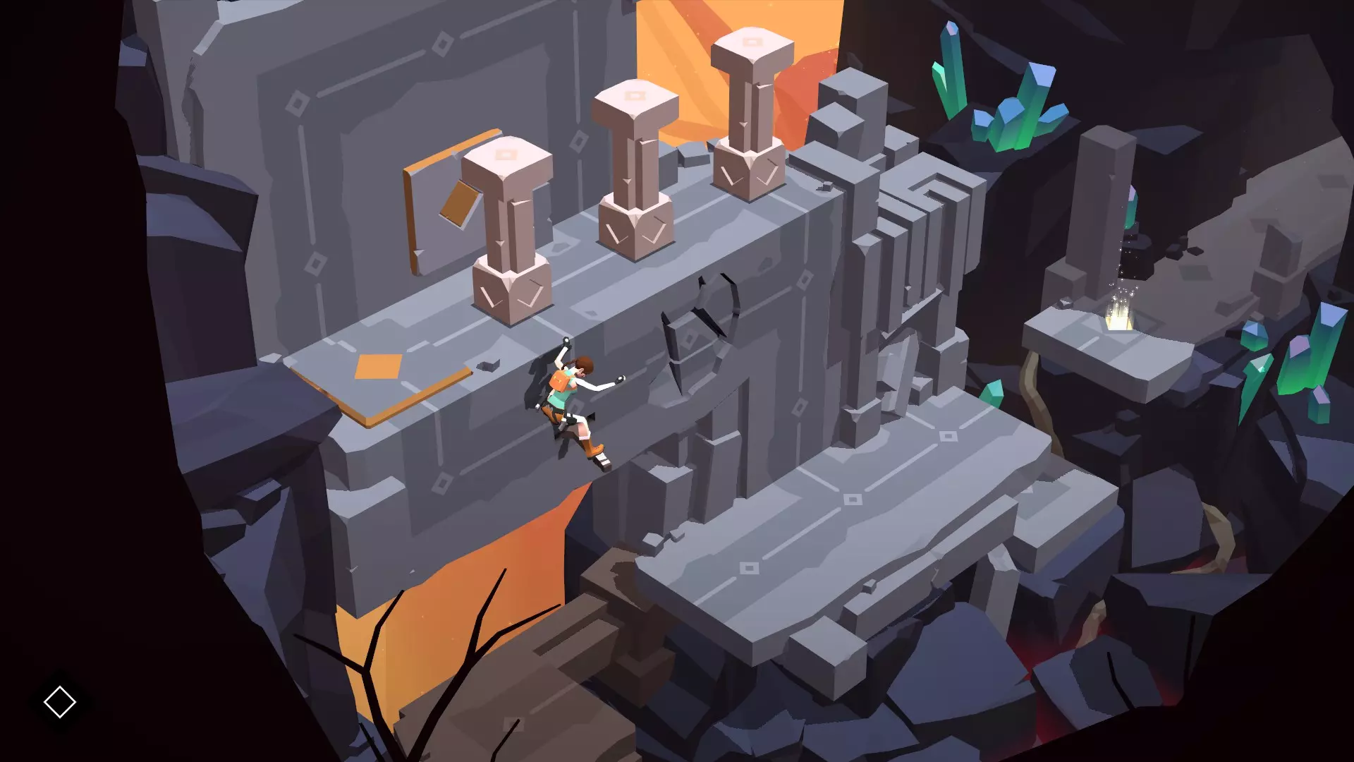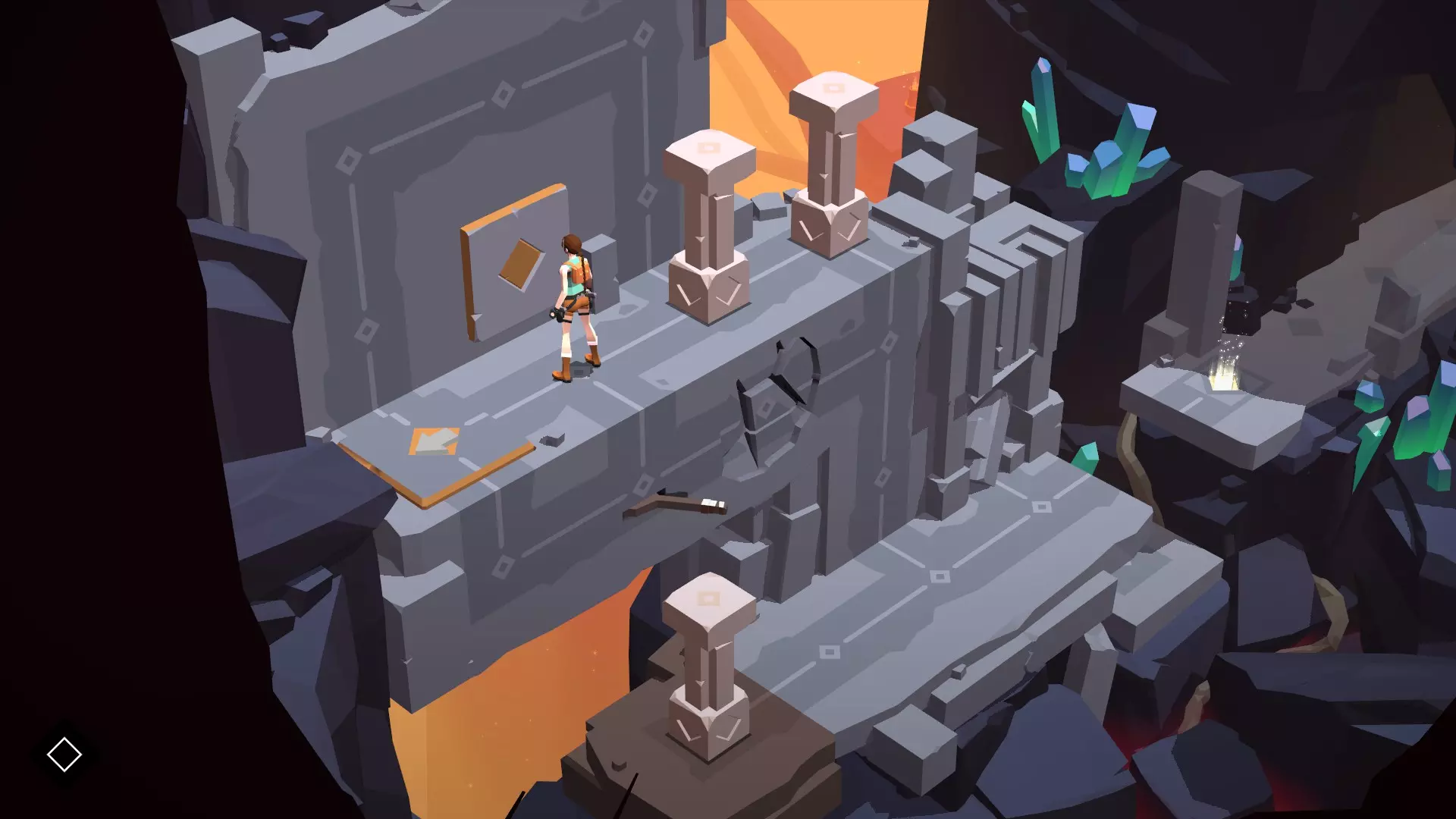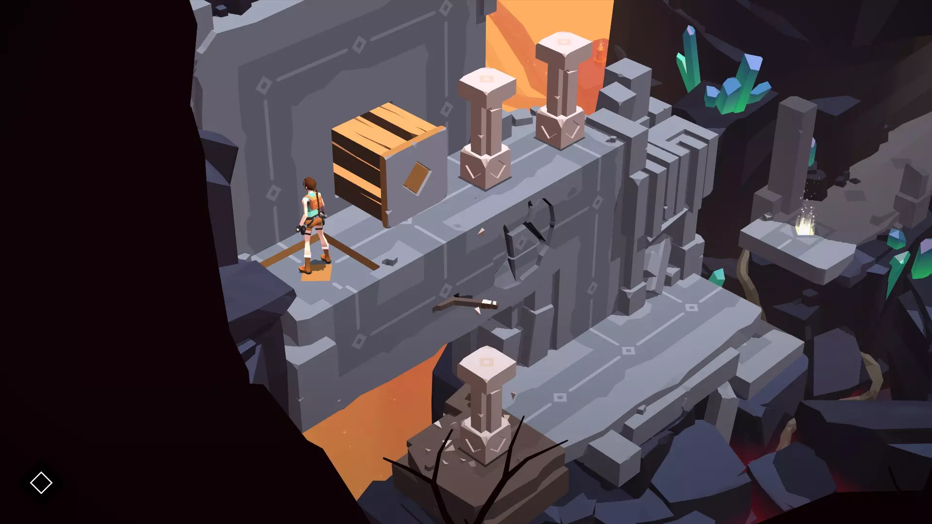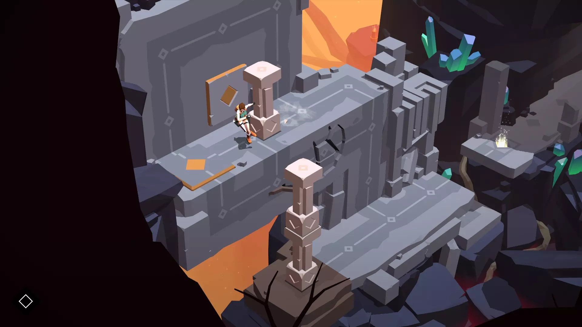 分步流程 操作步骤非常简单。首先,你需要激活附近唯一的拉杆,这会启动棕色平台,使其移动到墙壁活塞的正下方:这样一来,柱子就不会坠入深渊了。