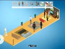 这是《Life in the Machine》的视频介绍片段,展示了等距视角的房间场景,画面里有两位角色,其中一位向另一位递出通讯器,呈现了视频里的互动情节。