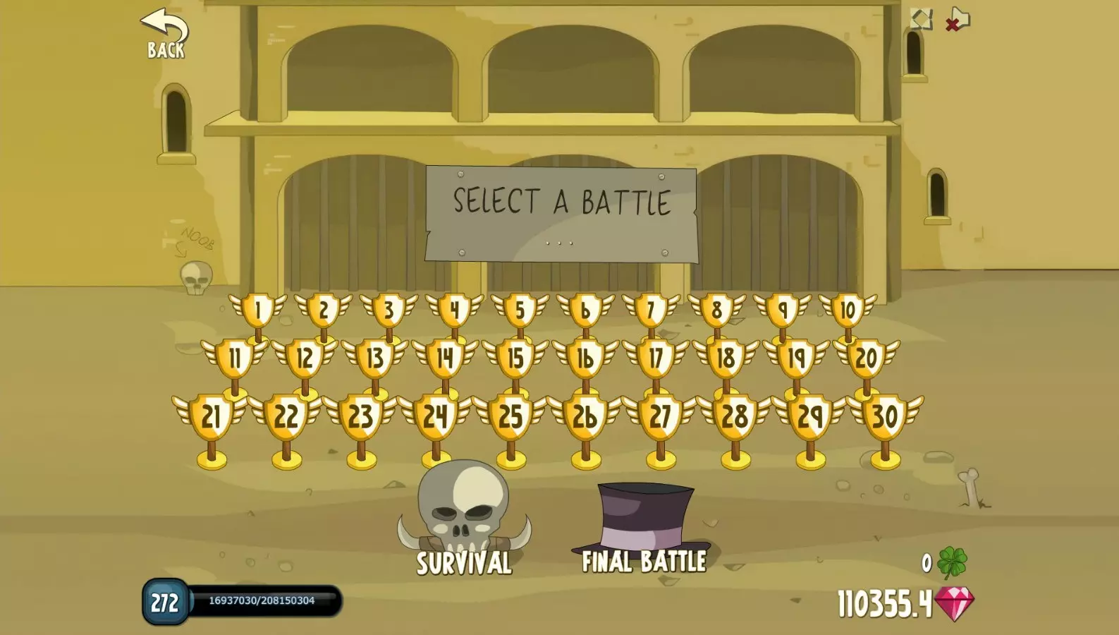 ➤ 每击败一场新战斗,游戏内获得的金币就会线性增加 ➤ 击败第30场战斗可解锁【生存模式】(无尽游戏模式) 5.1.1. 第1-10场战斗 战斗1 - 新手之敌 [等级1] 蚊子 4生命值 [等级1] 鼹鼠 9生命值 [首领] 蚊子王 41生命值 战斗2 - 流亡之徒 [等级2] 强盗 39生命值 [等级3] 劫掠者 68生命值 [等级4] 劫掠者 108生命值 [首领] 强盗王 358生命值 战斗3 - 村庄守卫 [等级5] 卫兵 225生命值 [等级6] 卫兵 305生命值 [等级7] 士兵 401生命值 [首领] 士兵王 1,183生命值 战斗4 - 哥布林跟班 [等级8] 哥布林苦工 642生命值 [等级9] 哥布林矛兵 790生命值 [等级10] 哥布林苦工 957生命值 [首领] 哥布林矛兵王 2,713生命值 战斗5 - 振翅怪物 [等级11] 蚊子 1,354生命值 [等级12] 病蝙蝠 1,584生命值 [等级12] 蚊子 1,838生命值战斗6 - “准备开工!” [13级] 病蝙蝠 2,115 HP [首领] 巨型苍蝇王 5,867 HP [15级] 兽人苦工 2,743 HP [15级] 兽人苦工 3,095 HP [16级] 兽人苦工 3,474 HP [17级] 兽人苦工 3,880 HP [首领] 兽人苦工王 10,727 HP 战斗7 - 蛮兵 [18级] 蛮兵学徒 4,777 HP [19级] 蛮兵 5,269 HP [20级] 蛮兵学徒 5,792 HP [20级] 蛮兵 6,345 HP [首领] 蛮兵王 17,629 HP 战斗8 - 城镇卫兵 [22级] 弓箭手 7,545 HP [22级] 士兵 8,195 HP [23级] 精英士兵 8,877 HP [24级] 卫兵 9,593 HP [首领] 精英士兵王 26,914 HP [25级] 哥布林矛兵 11,130 HP [26级] 哥布林苦工 11,951 HP [27级] 哥布林战士 12,809 HP27] 哥布林矛兵 13,704 HP [首领] 哥布林勇士王 38,925 HP 战斗10 - 学徒们 [等级29] 法师 15,607 HP [等级30] 法师 16,616 HP [等级30] 法师 17,664 HP [等级31] 法师 18,751 HP [首领] 法师王 54,013 HP 5.1.2. 战斗11-20 战斗11 - 沼泽小队 [等级32] 查姆普罗姆 21,049 HP [等级33] 莫斯quito 22,259 HP [等级34] 巨型苍蝇 23,511 HP [等级35] 查姆普罗姆 24,806 HP [等级35] 巨型苍蝇 26,143 HP [首领] 鼹鼠王 76,369 HP 战斗12 - 洛克塔 [等级37] 兽人战士 28,950 HP [等级37] 装甲兽人 30,420 HP [等级38] 兽人战士 31,934 HP [等级39] 装甲兽人 33,495 HP [等级40] 兽人战士 35,101 HP [首领] 装甲兽人王 104,089 HP 战斗13 - 亡命之徒 [等级41] 强盗 38,454 HP [等级42] 掠夺者 40,201 HP [等级战斗14 - 朋克帮派 [等级45] 哥布林战士 49,670 HP [等级46] 哥布林战士 51,713 HP [等级47] 哥布林战士 53,806 HP [等级47] 哥布林战士 55,952 HP [等级48] 哥布林战士 58,149 HP [首领] 兽人狂战士之王 177,997 HP 战斗15 - 稻草人联盟 [等级50] 稻草人 62,701 HP [等级50] 稻草人 65,056 HP [等级51] 稻草人 67,465 HP [等级52] 稻草人 69,929 HP [等级52] 稻草人 72,447 HP [首领] 稻草人之王 225,398 HP 战斗16 - 城市守卫 [等级54] 精英士兵 77,648 HP [等级55] 弓箭手 80,332 HP [等级55] 精英守卫 83,073 HP [等级56] 弓箭手 85,870 HP [等级57] 士兵 88,725 HP战斗17 - 帽子公会 [精英守卫] 生命值91,637 [首领] 国王队长 生命值289,691 [等级59] 教徒 生命值97,637 [等级60] 法师 生命值100,725 [等级60] 查姆普罗姆 生命值103,872 [等级61] 教徒 生命值107,079 [等级62] 法师 生命值110,347 [等级62] 教徒 生命值113,675 [首领] 国王查姆普罗姆 生命值365,181 战斗18 - 洞穴爬行者 [等级64] kobold 生命值120,515 [等级65] 鼹鼠 生命值124,027 [等级65] kobold 生命值127,602 [等级66] 病蝙蝠 生命值131,239 [等级67] 胆汁 kobold 生命值134,940 [等级67] 鼹鼠 生命值138,704 [首领] 国王胆汁 kobold 生命值452,821 战斗19 - 伯林小队 [等级69] 流浪汉 生命值146,425 [等级70] 刺客 生命值150,382 [等级70] 掠夺者 生命值154,404 [等级71] 强盗 生命值158,492 [等级72] 掠夺者 生命值162,646战斗20 - 风之主宰 [等级72] 刺客 166866 HP [首领] 伯林·胡德王 553584 HP [等级74] 蚊子 175506 HP [等级75] 鹰 179928 HP [等级75] 病蝙蝠 184417 HP [等级76] 鹰 188975 HP [等级77] 病蝙蝠 193601 HP [等级77] 巨型苍蝇 198296 HP [首领] 鹰王 668461 HP 5.1.3. 战斗21 - 30 战斗21 - 苦工联盟 [等级79] 哥布林苦工 207895 HP [等级80] 哥布林苦工 212800 HP [等级80] 兽人苦工 217775 HP [等级81] 兽人苦工 222822 HP [等级82] 哥布林苦工 227939 HP [等级82] 哥布林苦工 233129 HP [首领] 哥布林工程王 798463 HP 战斗22 - 畸形秀 [等级84] 愤怒苹果 243724 HP [等级85] 稻草人 249130 HP [等级85] 巨型苍蝇 254610 HP [等级86] 查姆普罗姆 260163 HP [等级87] 愤怒苹果 265791 HP战斗23 - 蛮族 [等级 87] 胆汁 kobold 271,492 HP [首领] 冰霜巨魔之王 944,619 HP [等级 89] 小 brute 283,120 HP [等级 90] brute 289,046 HP [等级 90] 狂战士 295,048 HP [等级 91] brute 301,127 HP [等级 92] 小 brute 307,282 HP [等级 92] 狂战士 313,513 HP [等级 93] 小 brute 319,822 HP [首领] 狂战士之王 1,130,101 HP 战斗24 - 死亡小丑 [等级 95] 教徒 332,673 HP [等级 95] 教徒 339,215 HP [等级 96] 教徒 345,837 HP [等级 97] 教徒 352,537 HP [等级 97] 收割者 359,316 HP [等级 98] 收割者 366,175 HP [等级 99] 收割者 373,114 HP [首领] 收割者之王 1,338,761 HP 战斗25 - 复仇复仇者 [等级 100] 哥布林祭司 387,233 HP [等级 101] 哥布林萨满 394,414 HP [等级 102] 哥布林战士 401,676 HP战斗26 - 帝国卫兵 [等级106] 精英士兵 446979 HP [等级107] 队长 454820 HP [等级107] 精英卫兵 462746 HP [等级108] 队长 470756 HP [等级109] 精英卫兵 478851 HP [等级110] 精英士兵 487030 HP [等级110] 队长 495296 HP [首领] 黑队长之王 1831647 HP 战斗27 - 大熔炉 [等级112] 寒冰巨魔 512084 HP [等级112] 流浪汉 520608 HP [等级113] 弓箭手 529218 HP [等级114] 哥布林工程师 537915 HP [等级115] 狗头人 546700 HP [等级115] 收割者 555573 HP战斗28 - “此路不通!” [敌人] 雄鹰 564533 HP [首领] 愤怒苹