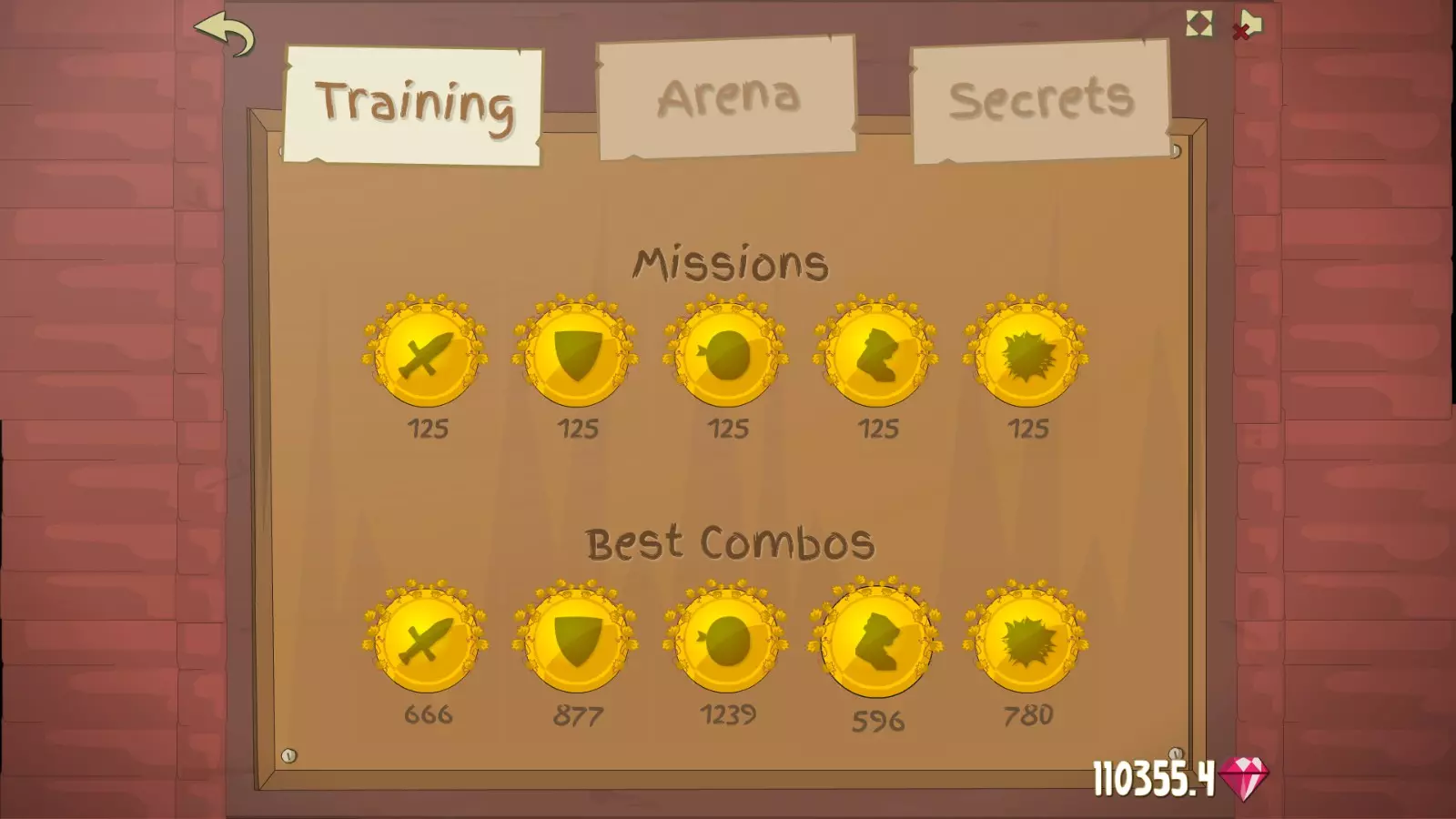 2.1. 训练勋章 木质、青铜等勋章所需的连击数、星级连击数和任务分数超级金牌:力量 铜 银 金 铂金 超级金 任务数 5 10 20 35 50 连击数 40 80 125 200 300 格挡 铜 银 金 铂金 超级金 任务数 5 10 20 35 50 连击数 40 80 125 200 300 精准度 铜 银 金 铂金 超级金 任务数 5 10 20 35 50 连击数 25 50 75 100 150 闪避 铜 银 金 铂金 超级金 任务数 5 10 20 35 50 连击数 25 50 75 100 150 暴击 铜 银 金 铂金 超级金 任务数 5 10 20 35 50 连击数 40 80 125 200 400 2.2. 训练任务 力量 1. 提升属性值x2(每次重置+1) 2. 达成连击x27(每次重置+10) 3.【获得11颗星(每次重置+4)】 4. 19秒内无失误(每次重置+2) 5. 达成4倍星星连击(每次重置+1) 【重置+更难的任务+更多技能点奖励】 格挡 1. 属性提升2倍(每次重置+1) 2. 达成27连击(每次重置+10) 3. 获得9颗星(每次重置+3) 4. 19秒内无失误(每次重置+2) 5. 达成3倍星星连击(每次重置+1) 【重置+更难的任务+更多技能点奖励】 精准 1. 属性提升2倍(每次重置+1) 2. 达成21连击(每次重置+5) 3. 获得11颗星(每次重置+4) 4. 16秒内无失误(每次重置+2) 5. 达成5倍星星连击(每次重置+1) 【重置+更难的任务+更多技能点奖励】 闪避 1. 属性提升2倍(每次重置+1) 2.普通难度 1. 达成21连击(每次重置+5) 2. 获取11颗星(每次重置+4) 3. 16秒内无失误(每次重置+2) 4. 达成5星连击(每次重置+1) 每次重置后任务难度提升,技能点奖励增加 困难难度 1. 属性提升x2(每次重置+1) 2. 达成27连击(每次重置+10) 3. 获取21颗星(每次重置+4) 4. 16秒内无失误(每次重置+3) 5. 达成7星连击(每次重置+2) 每次重置后任务难度提升,技能点奖励增加 3. 英雄