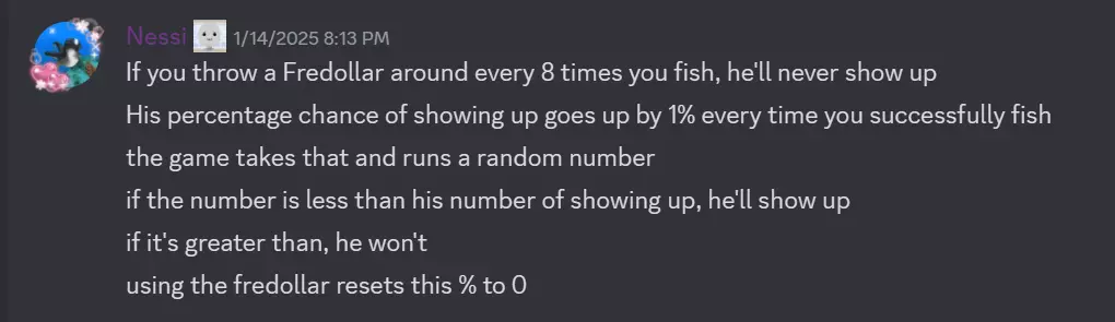 如果你因任何原因无法查看图片,以下是文字记录: “如果你每钓鱼8次就使用一次弗雷多拉尔,他就永远不会出现。 他出现的百分比概率会在你每次成功钓鱼后增加1%。 游戏会据此生成一个随机数。 如果这个随机数小于他的出现概率数值,他就会出现。 如果大于,他就不会出现。 使用弗雷多拉尔会将这个百分比重置为0。” 鱼饵列表 软糖蠕虫 价格:10美元 效果:-5%鱼竿速度 描述:专门用于吸引喜欢啃咬质地类似奶嘴物质的鱼类。实际上只能钓到基础鱼类。 仇恨邮件 价格:20美元 效果:-10%鱼竿速度 描述:一封来自弗雷德里克曾经管理过的前岛屿的信件。 软糖(?【小熊软糖】价格:30美元 效果:鱼竿速度-15% 描述:它在被强行挂到鱼钩上之前,可能活着,也可能没有。这只小熊软糖的内部充满了奶酪。那么,它算是一只奶酪熊吗? 【灯泡】价格:40美元 效果:鱼竿速度-20% 描述:想知道灯泡在水下是否还能亮着吗?或许不能。不要在家尝试。只能在海洋里,而且只能在名为XoronB的星球上。 【剃须刀片】价格:50美元 效果:鱼竿速度-25% 描述:有时候,为了钓到鱼,你就得把鱼切开。 【爱心棒棒糖】价格:60美元 效果:鱼竿速度-30% 描述:说你会再见到我,即使只是在你最狂野的梦里……啊……啊……岛民形态的感知黏土 价格:70美元 效果:鱼竿速度-35% 描述:一块形似普通岛民的感知黏土。XoronB星球上的鱼喜欢捕食岛民,因为岛民的黏土身体味道极为鲜美。 可疑的鸡块 价格:80美元 效果:鱼竿速度-40% 描述:这块鸡块究竟从何而来?无人知晓。这对XoronB星球的所有居民来说都是一个彻头彻尾的谜……或许它来自XoronC星球? 超凡蘑菇 价格:90美元 效果:鱼竿速度-45% 描述:有人说,如果你浅尝一口,就会开始尝到颜色的味道。 弗雷多拉尔 价格:100美元 效果:鱼竿速度-50%,将菲什德里克的生成概率重置为0% 描述:弗雷德里克的巨大 ego 再次作祟。如果你不够小心,某条鱼可能会抢劫你……偶尔使用【Fredollar】来让它平静下来…… 鱼类列表 未知靴子 稀有度:新手 最低诱饵:无 售价:5美元 描述:一只看起来曾属于某个渔民的靴子。希望他没事,但就这片海洋的情况来看,可能性不大。 土豆鱼 稀有度:新手 最低诱饵:无 售价:25美元 描述:通常被认为是海里最糟糕的鱼,土豆鱼的形状——并且就是——由土豆构成。你可以把它放进烤箱烤,很快就能得到一份美味的小吃!……它甚至自带盐分。我猜是这样。 爆米花鱼 稀有度:糟糕 最低诱饵:仇恨邮件 售价:50美元 描述:爆米花鱼是一种深海掠食者,会在寻找食物时游到海面。它会向毫无防备的受害者递出一颗小爆米花籽,然后将他们一口吞进肚子里。真美味。 觉醒鱼 稀有度:非常差 最低诱饵:小熊软糖(?) 售价:75美元 描述:觉醒鱼是一种五彩斑斓的鱼,游得快,捕食更快。由于它在海底隐藏了数百年,身上形成了彩虹般的色彩图案,如今在温暖的阳光下,它骄傲地在水面游弋,闪闪发光。自由吧,觉醒鱼,自由吧。 醉醺醺的丈夫 稀有度:差 最低诱饵:灯泡 售价:100美元 描述:醉醺醺的丈夫鱼正如你所料。它晚上从珊瑚礁出来,一路游到当地的海鲜餐厅,吃了很多微塑料。当他早上醒来时,会抱怨前一晚宿醉带来的剧烈头痛。 普吉尔 稀有度:普通 最低诱饵要求:刀片 售价:125美元 描述:普吉尔是海洋中最悲伤的鱼。没人知道原因。它常常把眼睛睁得大大的,尽可能装出无辜的样子,好让周围的捕食者不要吃掉它。但这通常没用。 长新月鳍鱼 稀有度:良好 最低诱饵要求:心形棒棒糖 售价:175美元 描述:长新月鳍鱼是“月亮”鱼的后代,这种鱼在XoronB星球已经灭绝。幸运的是,假以时日,长新月鳍鱼最终会进化回圆形的形态。鱿鱼杰克 稀有度:非常好 最低诱饵:岛民形态的有感知黏土 售价:225美元 描述:鱿鱼杰克在XoronB上极为罕见,因为该物种目前正濒临灭绝。没人知道它来自哪里,也不知道它是如何来到这个星球的,因为弗雷德里克并非亲手创造了它。它就是这么出现了。 P博士鱼 稀有度:专业级 最低诱饵:可疑的鸡块 售价:275美元 描述:潜伏在海洋最深处的一个泻湖里,那里会生成一种名称相似的苏打水。这种鱼富含碳酸,喝下去能很好地解渴。 绒毛蜂鱼 稀有度:传说级 最低诱饵:外星蘑菇 售价:350美元 描述:XoronB上有名的漫游者。绒毛蜂鱼会伪装成鱼类,当捕食者靠近时便会蜇刺它们。它们的毒刺含有致命毒素,能瞬间使受害者失去行动能力。 Fredfish 稀有度:OP 最低诱饵:Fredollar 售价:400美元 描述:弗雷德里克众多仿自身形象的造物之一。游荡于XoronB的海洋中,是个打不死的家伙。尽管和Frysh是同类,却以在Frysh发起威吓时畏缩逃避而闻名。