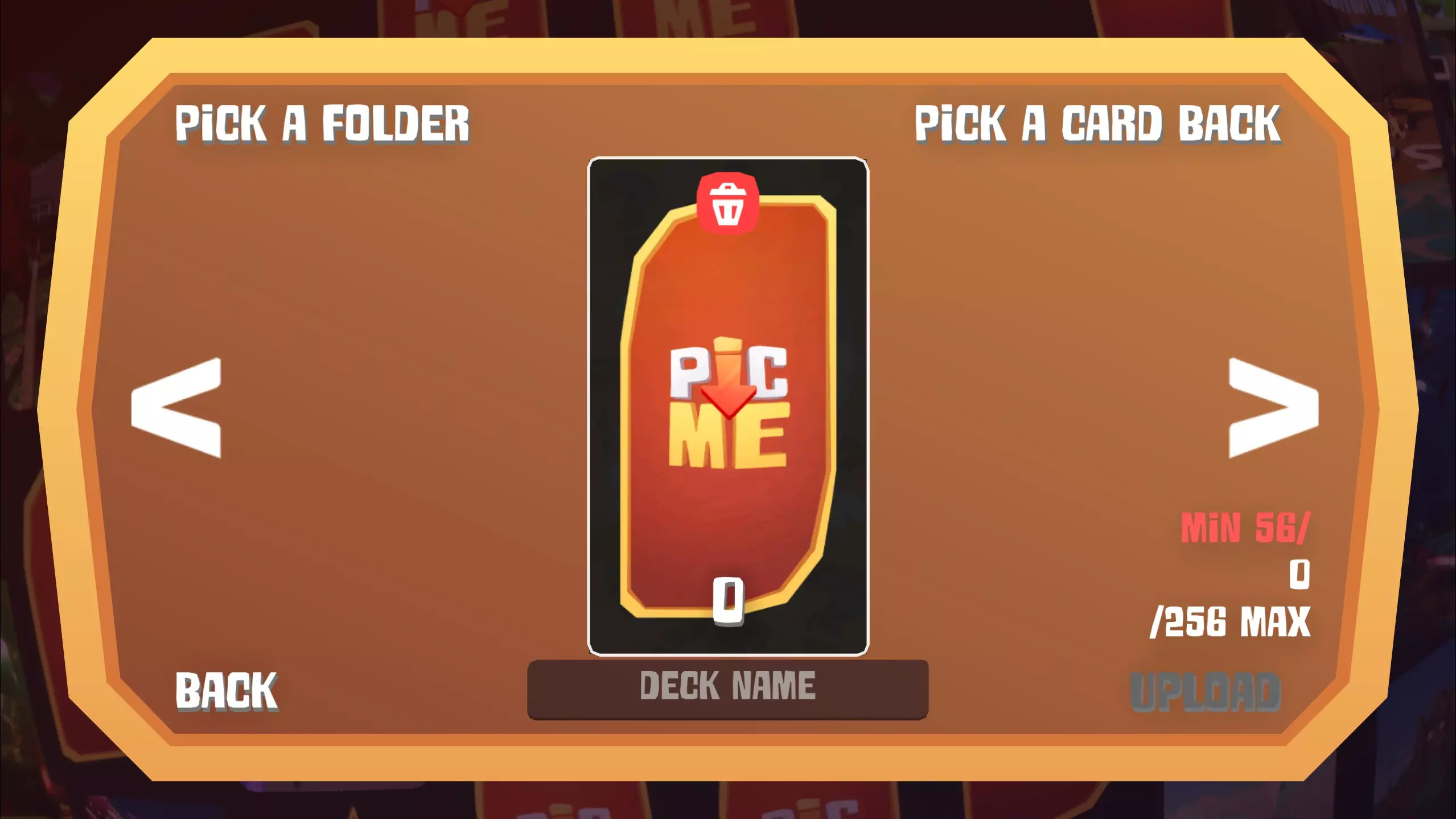 现在你可以通过侧边的箭头浏览所有图片,如果图片不是9:16比例,你可以通过拖动来重新调整居中位置(这一步不是必须操作)。 你可以点击卡片顶部的垃圾桶图标来删除卡片。 如果你已上传足够数量的卡片,56/256之间的数字应该会显示为白色。 最后一步:你需要为你的卡组命名。 Steam不允许使用某些特殊字符,建议使用纯文本命名,以避免出现问题。 如果所有步骤都操作正确,你应该可以点击“上传”按钮。 游戏现在会加载你所有的卡片并将其上传至创意工坊(根据卡组大小和你的网络速度,这可能需要几分钟时间)。 如果上传成功,你将会看到一个弹窗。