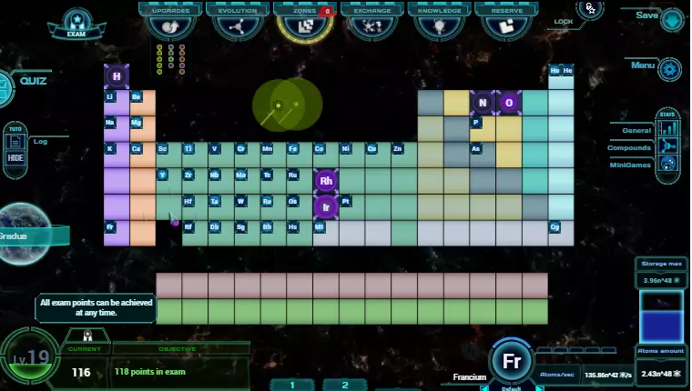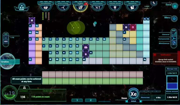 如何获取全部118个考核点数? 等级 1-20级:完成目标(左下角方框),通过自然选择推进进化,直至达到最后一级。 只有少数目标比较棘手。最值得注意的是一个每10秒变化一次的目标,因此无法完成。进入顶部的某个菜单并打开那里的目标框。框中的文字会提示你返回主屏幕,目标后面会慢慢出现越来越多的感叹号。等待大约一分钟,然后返回主游戏屏幕,即可发现目标已完成。 其他所有目标都不言自明,或需要一些关于元素的“知识”。 升级 可在升级菜单(F1)中购买升级。总共有636个升级项。从星球获得的额外升级不会影响总数。 编号 名称 描述 21 购买100个升级 - 22 购买200个升级 - 23 购买400个升级 - 24 购买所有升级 总计636 多样性 化合物可在【进化】菜单(F2)中购买,该菜单需要使用一些原子解锁。在【升级】菜单中购买【槽位】升级,可获得最多四种不同的化合物购买选项。5分钟后选项会自动更改,但你也可以在3分钟后点击【新请求】来更改选项。总共有21种不同的化合物,每种都必须至少购买一次。硫酸铜。等待后续出现的化合物(它们更复杂),如果还没有这些化合物就点击它们,否则就点击看起来新的那个。如果你知道缺少哪些化合物(可以在化合物菜单中查看,位于屏幕中右侧),且它们没有出现,可以尝试专注于一种化合物,因为还有一个成就需要点击同一化合物20次。在储备菜单(F6)中,你可以通过投资“REPOP”来减少等待时间。此外,在奥陶纪时期获取“化合物弹窗提醒”功能,这样每当有化合物即将出现时就会收到警告提示,即使你不在主游戏界面也不会错过。不过,如果你是主动游玩,选择“额外2个化合物弹窗”选项。总共有21种不同的化合物。每个都需要至少点击一次。 注意:我直到激活“额外出现2种化合物”选项后才找到硫酸铜(CuSO4)。 编号 名称 描述 53 点击5种不同的化合物 - 54 点击10种不同的化合物 - 55 点击所有不同的化合物 共21种 捕捉者 点击任意化合物达到特定次数,与“收集者”考核点的提示相同。 编号 编号 名称 描述 56 点击10个化合物 - 57 点击25个化合物 - 58 点击50个化合物 - 59 点击100个化合物 - 活跃时间 游戏保持开启状态达到特定时长。 编号 名称 描述 60 游戏时长30分钟 - 61 游戏时长1小时 - 62 游戏时长2小时 - 63 游戏时长5小时 - 64 游戏时长12小时 - 总时长 总时长包含活跃游戏时间和游戏未开启时的闲置时间。 编号编号 描述 65 创建游戏后1天 - 66 创建游戏后2天 - 67 创建游戏后4天 - 68 创建游戏后1周 - 继续游戏 累计继续游戏存档特定次数。 编号 名称 描述 69 重返游戏5次 - 70 重返游戏10次 - 71 重返游戏20次 - 似曾相识 累计访问不同菜单特定次数。若想快速获取经验值,可使用快捷键(F1-F6)。 编号72 升级似曾相识:访问升级界面250次(F1) 73 进化似曾相识:访问进化界面100次(F2) 74 区域似曾相识:访问区域界面150次(F3) 75 兑换似曾相识:访问兑换界面40次(F4) 76 知识似曾相识:访问知识界面150次(F5) 77 储备似曾相识:访问储备界面100次(F6) 78 考试似曾相识:访问考试界面100次 遗忘:解锁所有菜单并在一段时间内远离它们。通过花费原子解锁所有菜单,返回游戏主界面并观看几集瑞克和莫蒂。当考试标签闪烁时再回来。 编号 名称 描述 79 无需升级 1小时内不进入升级界面 80 无需进化 1小时内不进入进化界面 81 无需区域 1小时内不进入区域界面 82 无需兑换 1小时内不进入兑换界面 83 无需知识 1小时内不进入知识界面 84 无需储备 1小时内不进入储备界面 85 无需考试 1小时内不进入考试界面 小游戏 小游戏会偶尔出现在主游戏屏幕上。测验是目前最常见的一种。测验之间的等待时间可在储备菜单中减少。在该菜单中,你还可以购买能让小游戏难度降低一些的升级。在第四纪时期获取【小游戏弹出提醒】或【小游戏更频繁出现】。 编号 名称 描述 86 5/5 correct ansers in Quiz 一次测验中答对所有题目。 87 Win in minigame arkanoid 这是一款带有周期元素的打砖块克隆游戏。你需要在球用完之前射掉所有118种元素。尝试将球射向侧面,使其能越过元素。要赢得游戏无需接住元素,但接住它们会为其生产带来永久加成。当主游戏屏幕背景中出现蓝色球体时,即可激活该游戏,点击蓝色球体即可。 88 Win in the minigame hole card 在该游戏中,你需要比较两种元素的质子数。要获得考试分数,你需要【完美无缺】地比较所有118种元素。你可以打开元素周期表查看质子数,且游戏没有时间限制。当你点击一个轻微晃动的元素 tile 时(这种情况相当罕见),即可激活该游戏。 89 Win in the minigame matching 这是一个记忆游戏,一半的 tile 显示元素名称,另一半显示元素符号。游戏没有时间限制,但你只有一定次数的尝试机会。你可以在电子表格或纸上做笔记。要获得考试分数,你需要在解锁全部118种元素后,完成所有15个关卡(通常每个关卡包含10种元素)。要进入该游戏,你需要点击一个出现的非元素方块。这个方块通常会出现在“Ba”之后的空隙中,伪装成青柠绿色的方块(见下图)。 打砖块小游戏(背景中会出现一个蓝色小球):在化合物菜单(中右位置)中,你可以查看已购买的化合物。 25 出售5种不同的化合物 - 26 出售10种不同的化合物 - 27 出售15种不同的化合物 - 28 出售所有不同的化合物 共21种 区域 区域可在【ZONES】菜单(F3)中升级,该菜单需要消耗一些原子解锁。每个