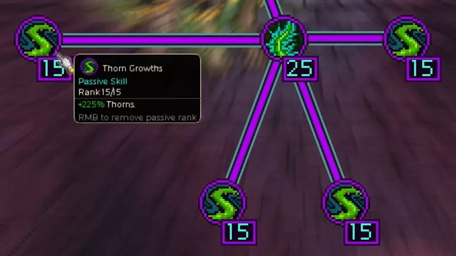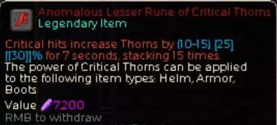 在计算毒气伤害时,死亡士兵套装效果会使荆棘值被视为毒属性并加算到基础伤害中。要有效提升荆棘值,可使用这件传说武器【碎肉者】的固有技能以及该通用符文。此外,远征树的所有复仇被动技能都必须点满。