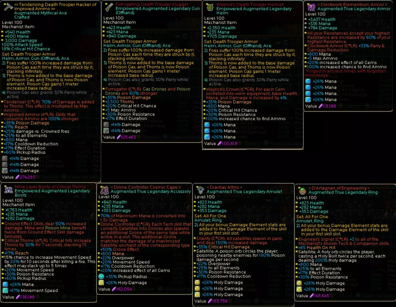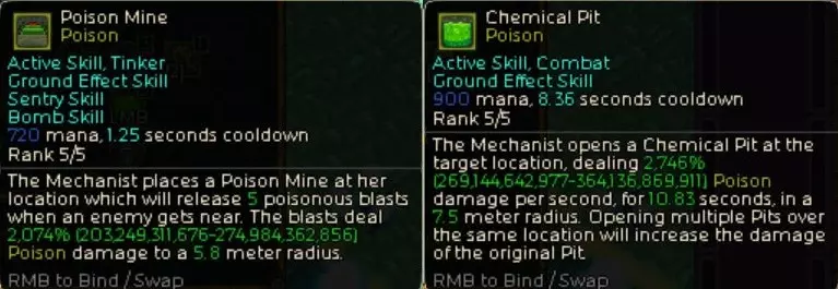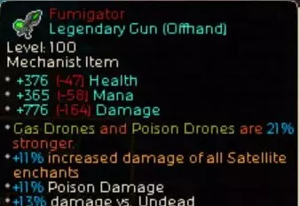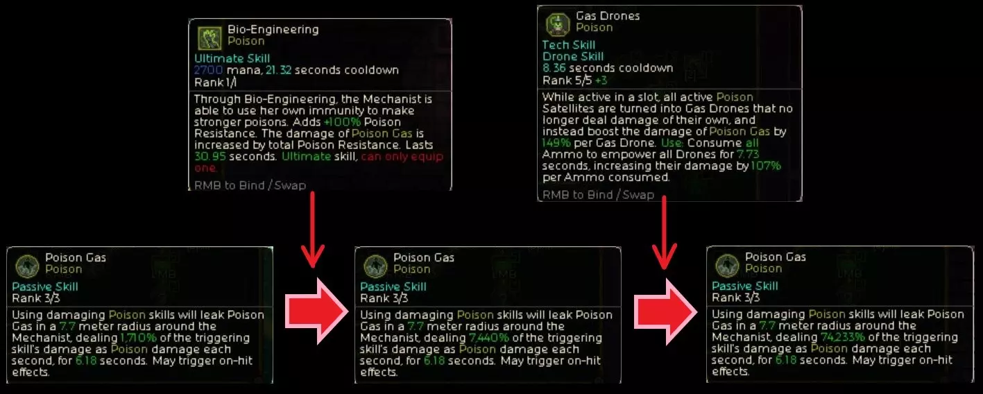 毒气的倍率首先会通过这件传说装备【Fumigator】的效果以及【Gas Drone】的被动来大幅叠加(如上图)。在此基础上,再用毒属性终极技能【Bio-Engineering】进行强化,最后发动【Gas Drone】的技能,就能使技能倍率提升到数万%,这就是其运作机制。