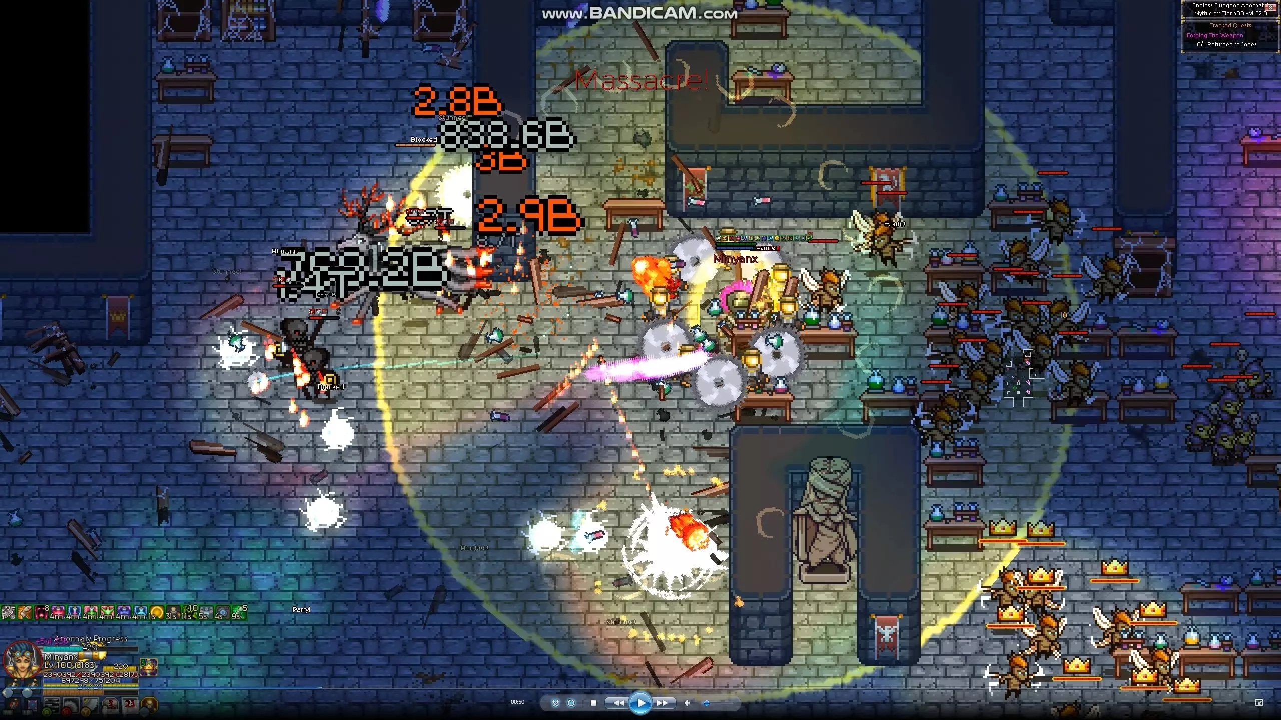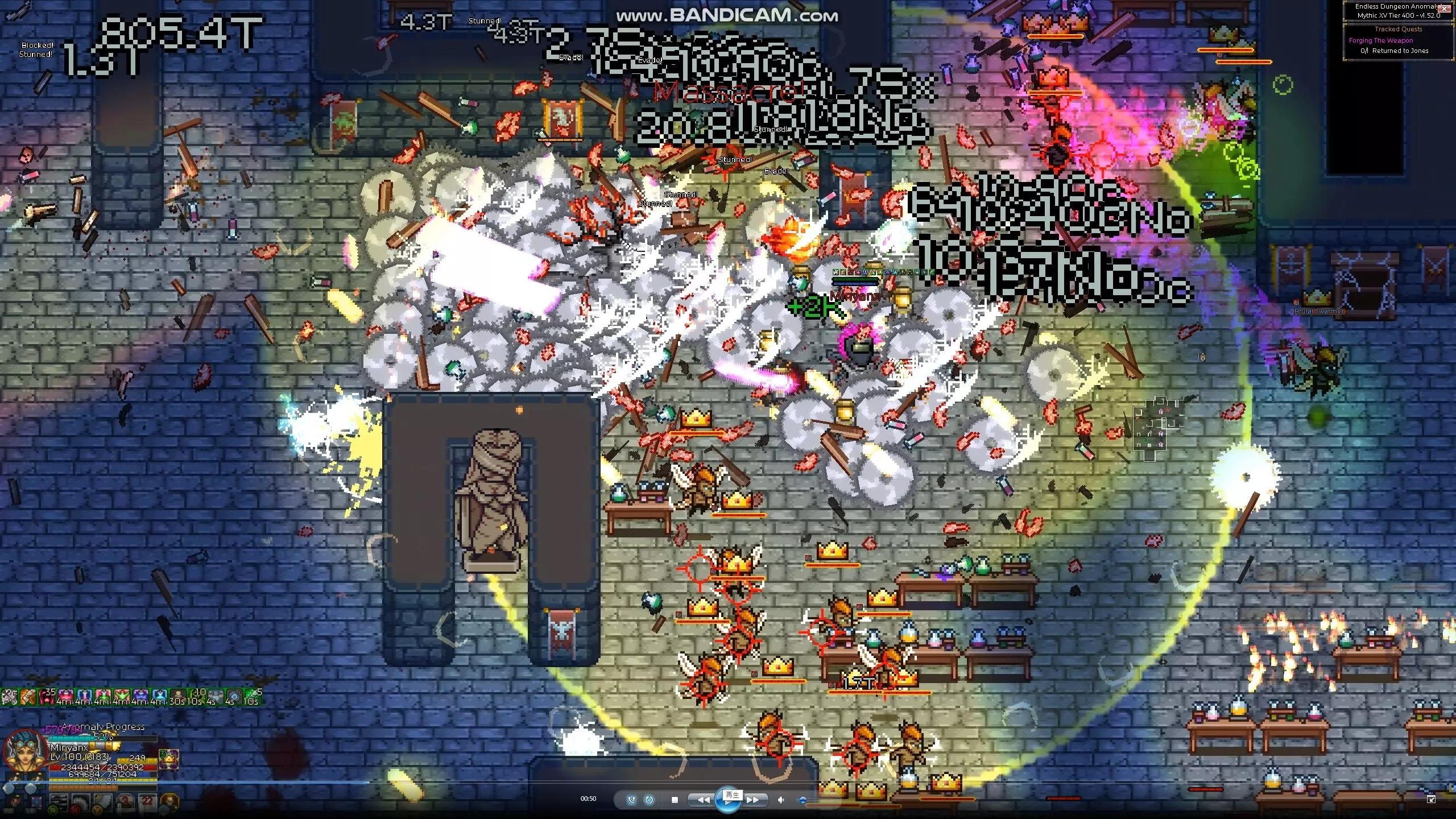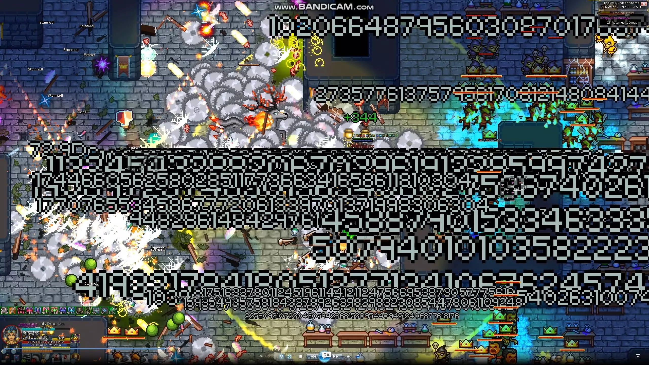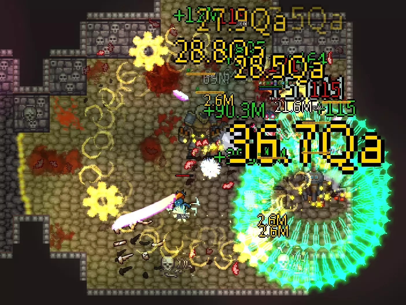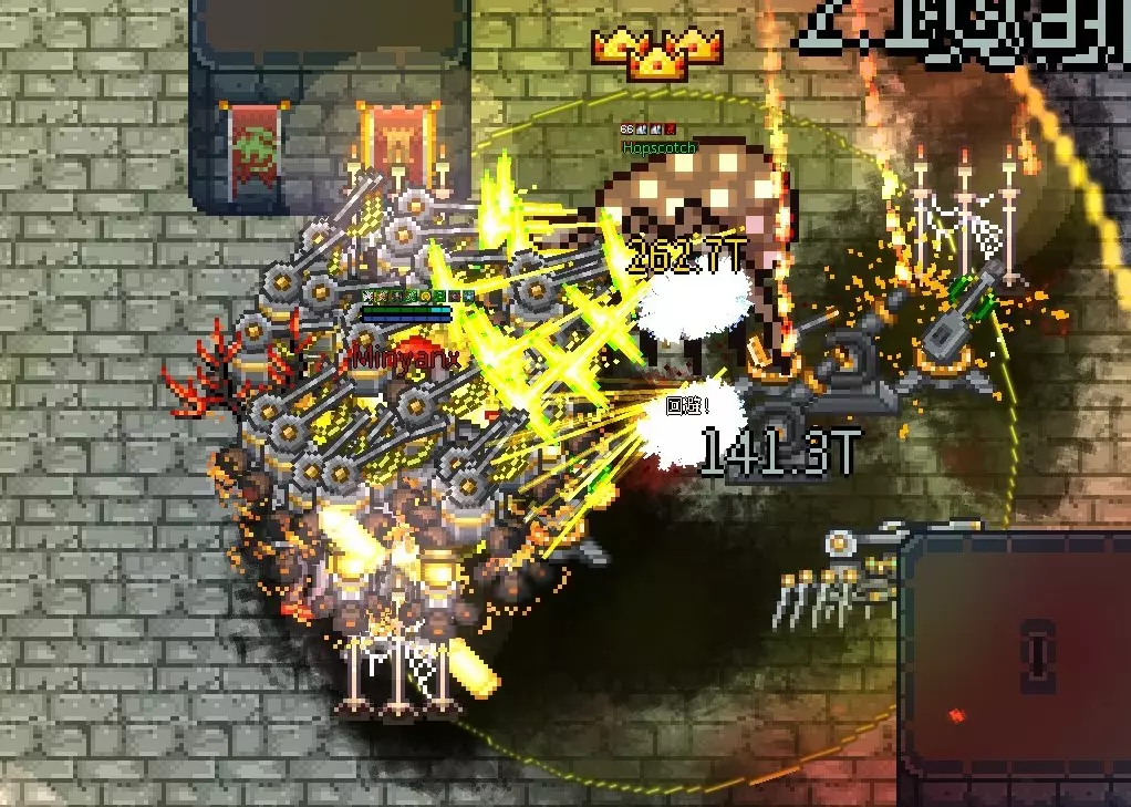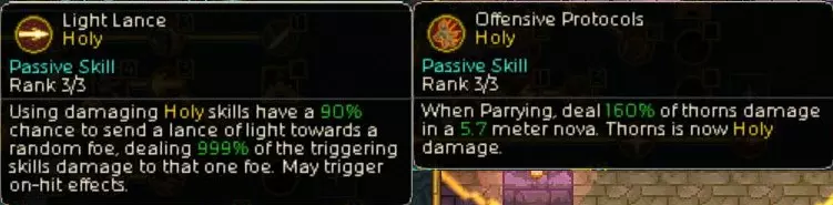 以神圣属性被动技能【光明之矛】为核心的build。 要触发【光明之矛】,必须使用带有神圣属性伤害的技能,但机械师的神圣属性主动技能除了【漩涡打击】外均为有冷却时间的技能,无法连续释放。无冷却的【漩涡打击】其技能动作本身也需要0.5到1秒,同样无法连续释放。 因此,通过被敌人攻击时触发的反击被动技能【进攻协议】来发动【光明之矛】才是正确玩法。【光明之矛】拥有一些效果强大的符文和套装效果,将这些组合起来的话,应该会非常强力。我本来以为……但在尝试各种技能游玩时,偶然发现了一个可以任意高速连射【Light Lance】的漏洞(?)。 画面上一闪一闪地散布着黄色光线,看起来很奇怪,让人忍不住想笑。 虽然从画面上看这只是个小把戏,但用这个方法也轻松突破了500层。500层时还有很多余力,要是好好使用增益效果的话,感觉还能挑战更高层数。