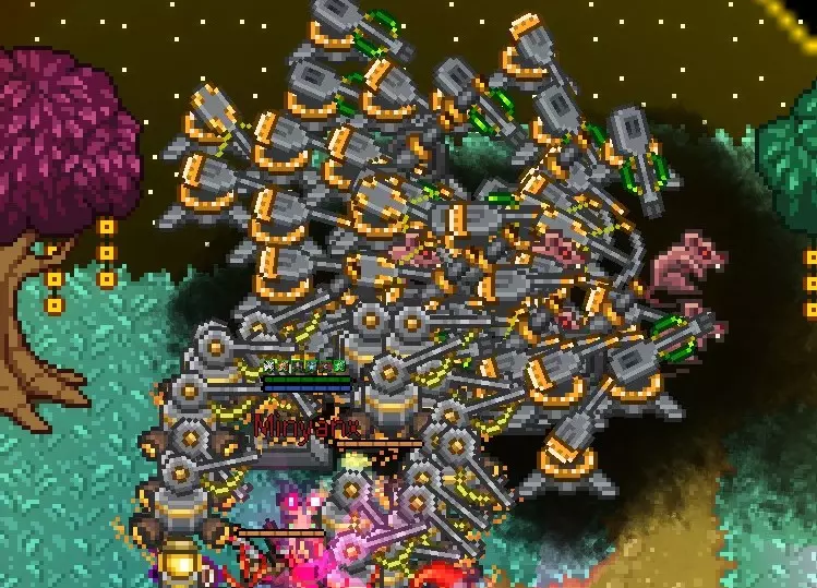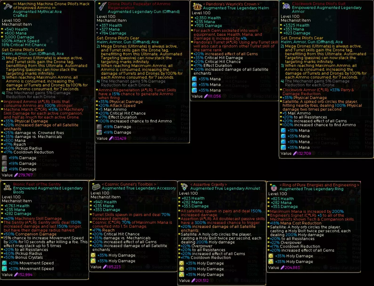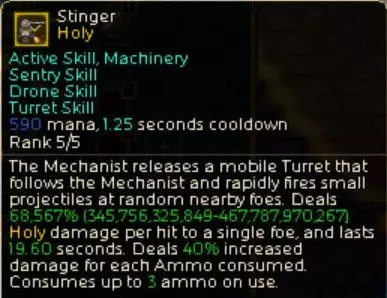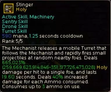 整体机制:通过无人机驾驶员的套装效果将炮塔视为无人机,从而让其能受到多种倍率加成。虽然直接作用于炮塔本身的倍率附魔并不多,但通过将其视为无人机,就能增加倍率的乘积运算。《英雄旧忆》的核心机制正是乘法运算。 不过,我最初是围绕物理属性特化炮塔来构建这套玩法的。但该玩法的瓶颈在于,每次移动后都需要重新部署炮塔。于是我改变了方向,强化了能和自己角色一起移动的圣属性炮塔【Stinger】,并以圣属性为核心重组了构筑,形成了现在的形态。
