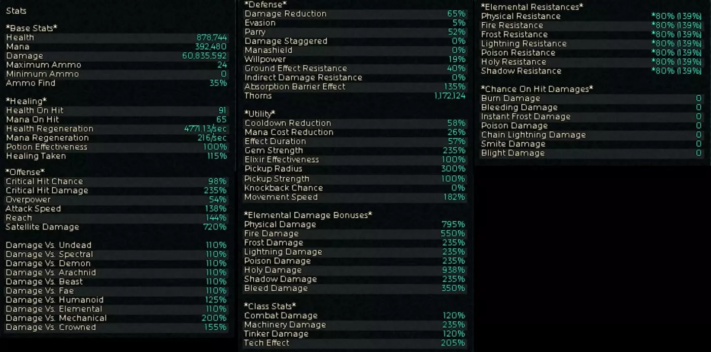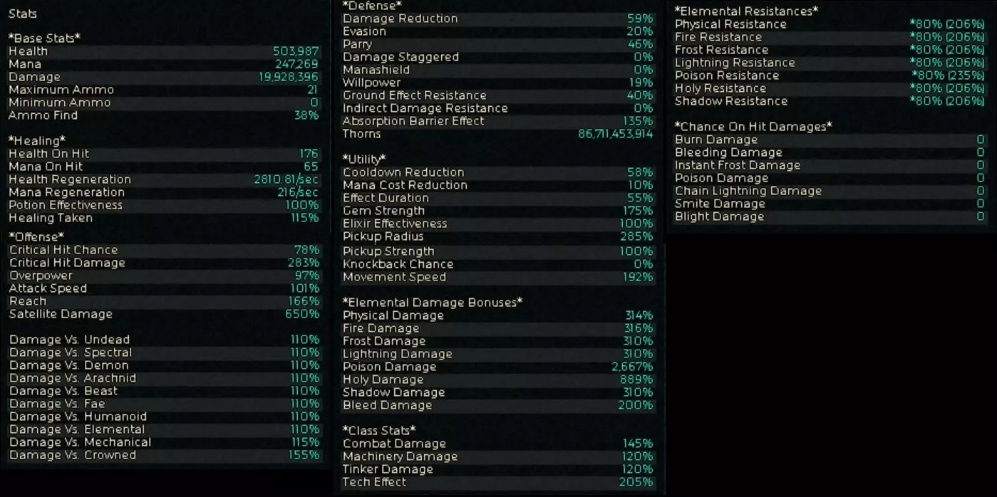 具体来说,这是关于护符和戒指上镶嵌的魔法石的附魔选择问题。是选择火焰:神圣为2:0、1:1还是0:2。 我的结论是,如果是没有增益效果也能轻松击败的低层级敌人,2:0比较好。但当火力开始不足时,就换成1:1。0:2似乎操作次数不够。 =================== 3.荆棘与毒气流派综合火力 ★★★ 对多数火力 ★★★★ 对单体火力 ★★★ 瞬间最大火力 ★★★★ 操作性 ★★★★ 生存性能 ★★★ 【思路】 将毒属性被动技能【毒气】强化到极限的配装。 首先,【毒气】是指“当使用任意毒属性技能时,机械师周围会在一定时间内自动产生毒气,对敌人造成伤害”的技能。也就是说,无需将作为触发条件的主动攻击技能直接命中敌人,只要从敌人附近经过,就能造成毒气伤害。上面视频中敌人瞬间爆炸四散,并非是快速使用了某种主动技能,而是受到了这个【毒气】的持续DOT伤害。另外,视频中出现的Qa这个伤害单位,是T(万亿)的1000倍,即Quadrillion的缩写,在日语中相当于千兆伤害。真的很强。到了这个阶段,Qa级别的伤害已经是理所当然的了。【优点和缺点】 优点 - 能持续造成高额伤害 - 除触发增益效果外,只需在地图上移动即可 - 只要弹药充足,火力就能维持 缺点 - 初期弹药积累前实力较弱,容易死亡 - 需要留意增益效果的维持和弹药数量的管理 - 外观比较朴素 【装备和技能】