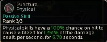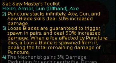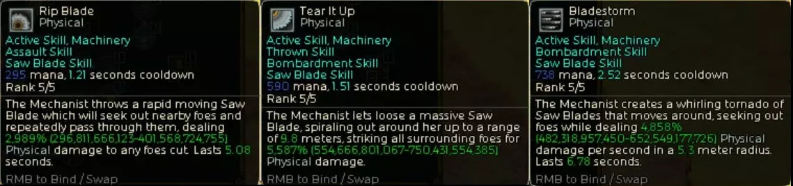 既然是锯刃(Saw)流派,我决定以锯刃技能为主。各种增益效果触发时的技能威力如上所示。不过仔细想想,或许用枪械技能或斧头技能也不错。又或者利用神圣属性的被动技能神圣之孔(Holey),搭配神圣属性的耙射(Rakeshot)似乎也行,现在才想到这一点。感觉还有一些改良的空间……穿刺(Puncture)的技能强化