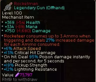 整体机制:与前项的炮塔构筑类似,这是一种通过使用无人机技能消耗大量弹药来大幅强化伤害的构筑。因此,弹药不足时强度会变得不稳定。为此,我选择了增加最大弹药量并适当提高弹药生成率的附魔。此外,和炮塔构筑一样,适当强化无人机后就能持续输出。 不过,达成这一构筑的过程并非一帆风顺,以下将讲述相关情况。 采用效果的取舍选择:火箭人(Rocketman)的固有附魔