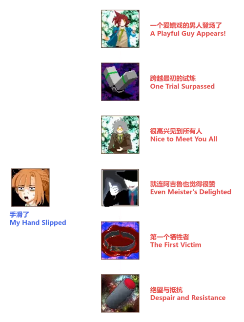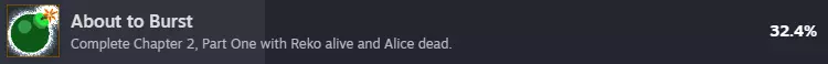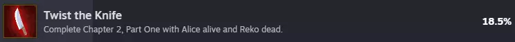 第二章 发生在第二章的成就。 13/14 若想让爱丽丝存活,在讨论时必须耗尽时间,或者在必须选择是否推开假瑞子(Reko Falsa)时右键点击取消对话。