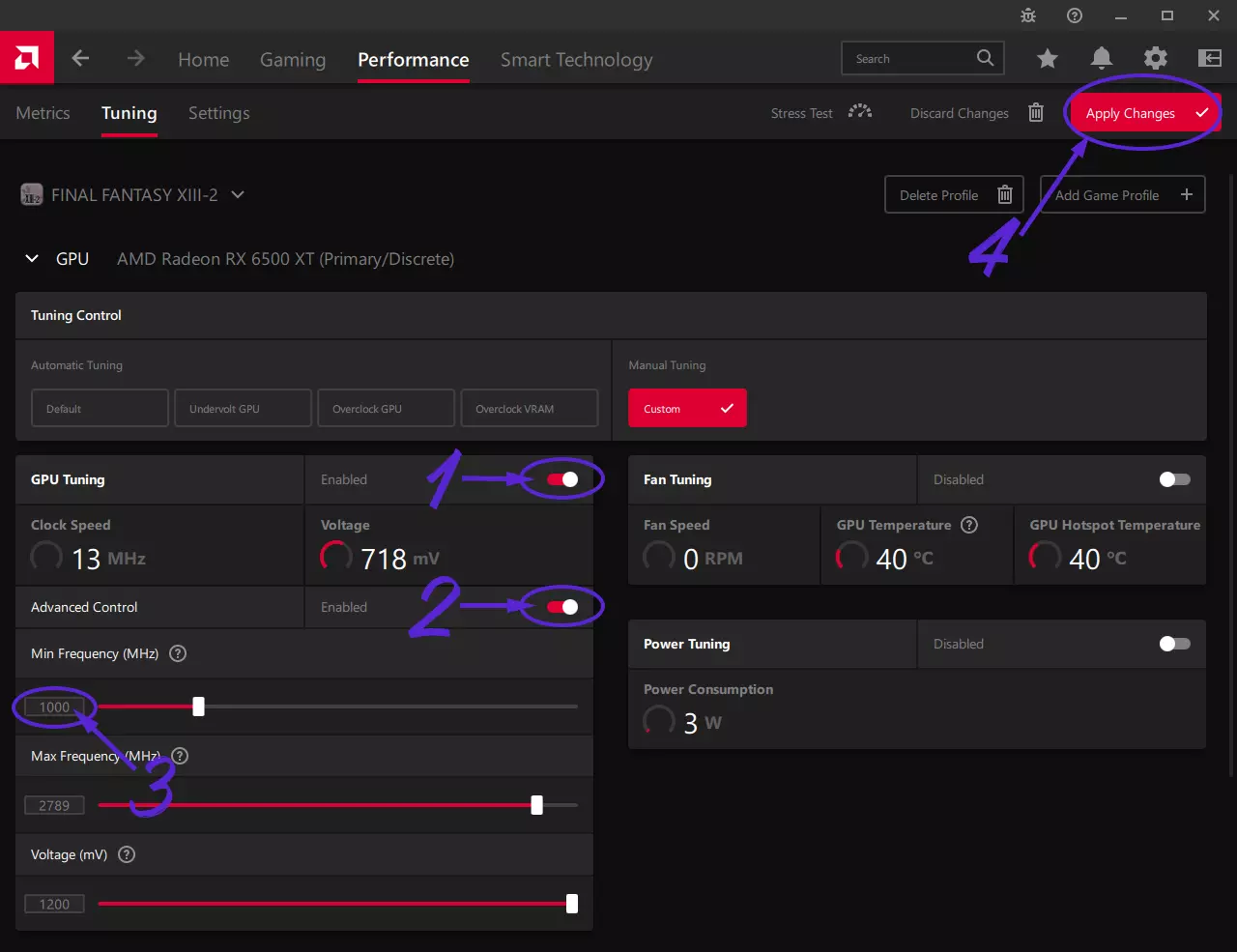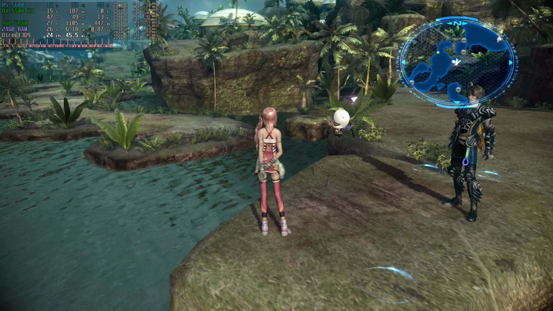 确保启用【GPU 调节】功能 启用【高级控制】 为【最低频率】输入理想数值。请勿输入高于最大频率的数值(最大频率可在最低频率下方查看) 这需要根据具体情况调整。建议使用监控软件(我使用 Riva Tuner Statistic Server),然后进入游戏(注意:不是在菜单或时空枢纽中,而是在实际游戏场景中)并测量你的 GPU 频率。例如,你希望游戏达到 60fps,但实际只有 50fps,此时你的 GPU 频率仅为 600MHz,而你的 GPU 最大频率可达 2800MHz。那么可以尝试将最低频率提高到 1000MHz。如果仍未达到 60fps,则继续提高到 1400MHz 等。你需要重启游戏才能使设置生效。 同时请注意监控你的 GPU 温度。就我的情况而言,频率仍然不高,但功耗却增加了。 点击【应用更改】注意,正如AMD所说,如果应用的工作负载过小,其运行频率有时可能会低于你设定的值。在《最终幻想13-2》中,就我的情况而言,在菜单和时空枢纽界面,最低频率设置会被忽略。 我的当前系统配置如下: Windows 10 22H2专业版64位 Ryzen 5 5600处理器 RX 6500 XT 4GB PCI-E 4.0显卡 技嘉B550M DS3H主板(版本1.4) 24GB DDR4内存 测试及截图 未应用修复时 - 24帧