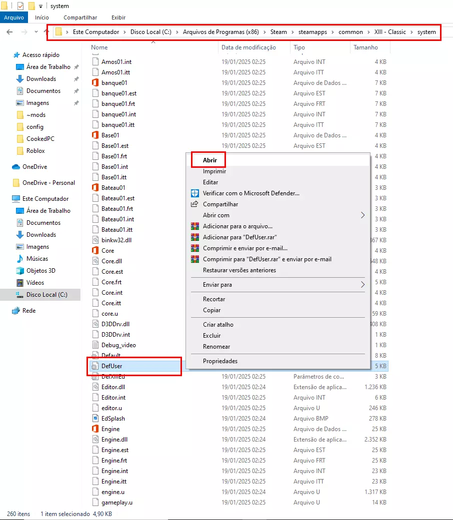 屏幕修复说明:若想以葡萄牙语进行游戏,请先前往【翻译】板块安装翻译包。否则,你将需要重新执行整个屏幕修复流程。 首先,进入游戏的安装目录: C: Program Files (x86) Steam steamapps common XIII - Classic 接着,打开【system】文件夹。在该文件夹中找到名为【DefUser】的ini文件,右键点击该文件并选择【打开】。该文件通常会用记事本打开,若系统提示选择程序,你可以选择任何能够读取和编辑文件的程序。