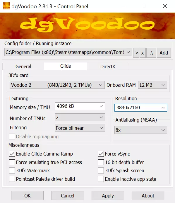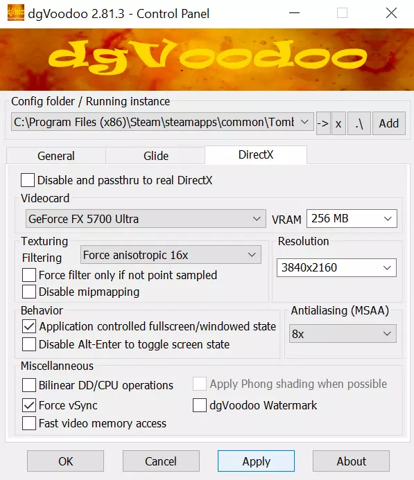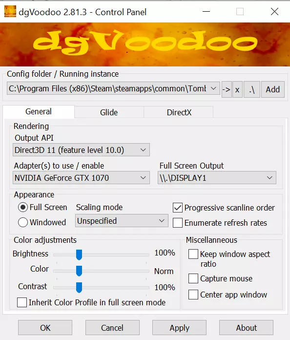 需放置在游戏文件夹中的文件: 设置 我们终于准备好所有需要的东西了。 注意:《古墓丽影》系列(一、二、三、四、五、六代)均有配套的命令运行设置。 控制 准备与整理 将所需文件复制到游戏安装文件夹: C: Program Files (x86) Steam steamapps common Tomb Raider (IV) The Last Revelation 下一步,运行dgVoodoo应用程序。 在dgVoodoo中选择游戏安装文件夹。 请严格按照以下图片操作: 常规