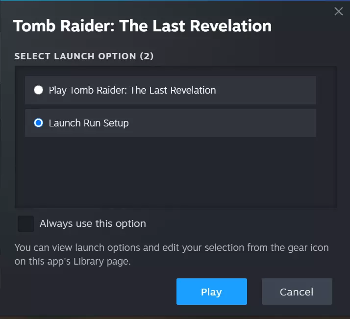 注意:补充说明 你可以在此处调整分辨率以获得更舒适的体验,调整时请务必在此处进行,而非在dgVoodoo中操作。 打开游戏《古墓丽影:历代记》 重要提示:请选择【启动运行设置】选项。