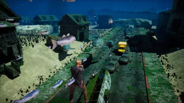 这是游戏《Undefined Survivors》的视频介绍,展示了被水淹没的城市场景,玩家可操控角色在其中持枪对抗鲨鱼等水下生物,体验独特的水下生存战斗玩法。