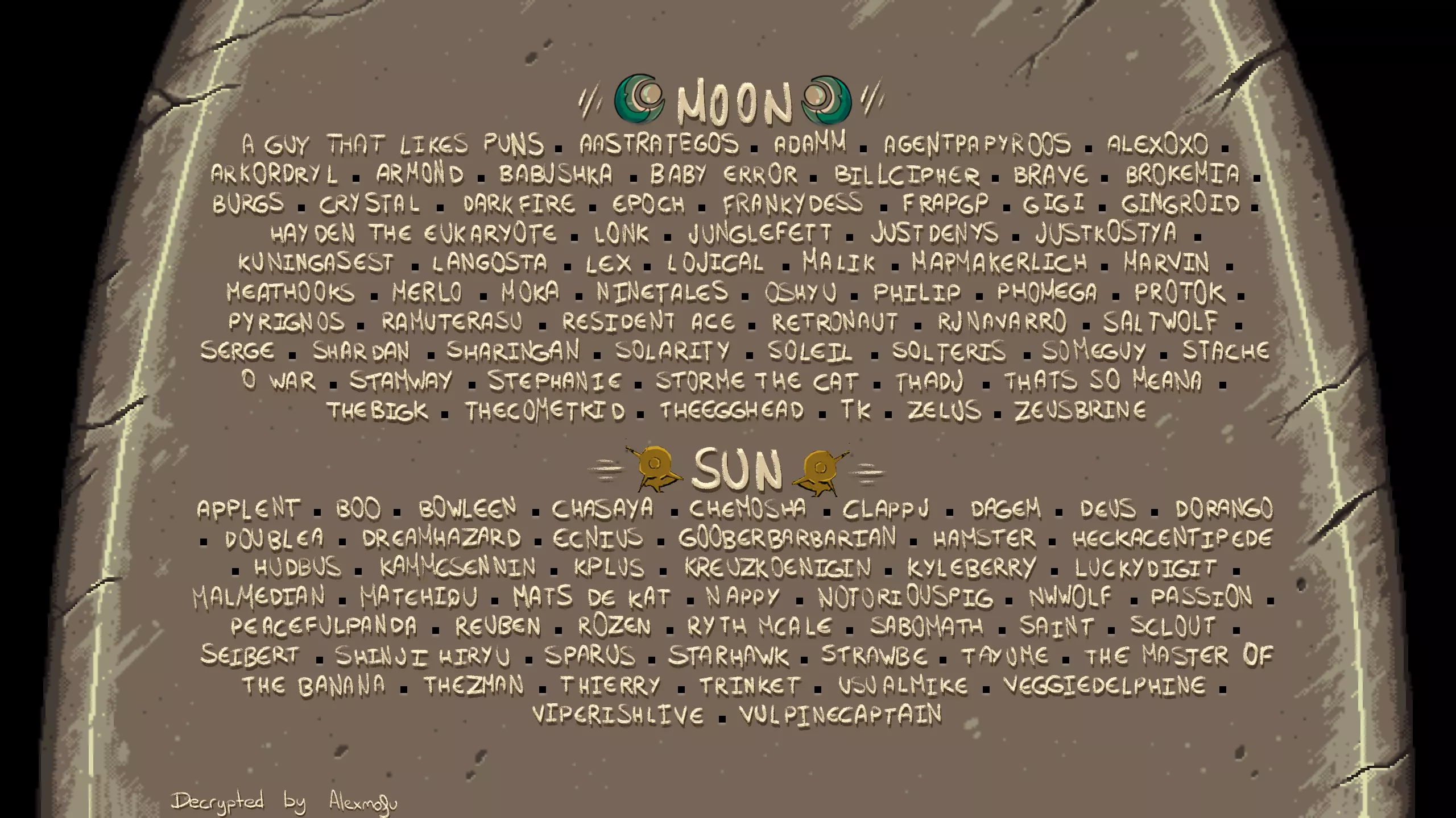 而且它们似乎是一些支持者的名字!你可以和Discord服务器用户进行对比。 引用自VertVentus:我觉得在“Sun”下方,第三行从左数第一个名字是“Hudbus”而不是“Hudfus” ·已修复!谢谢! ·符文词汇表 符文 对应文字 符文 对应文字