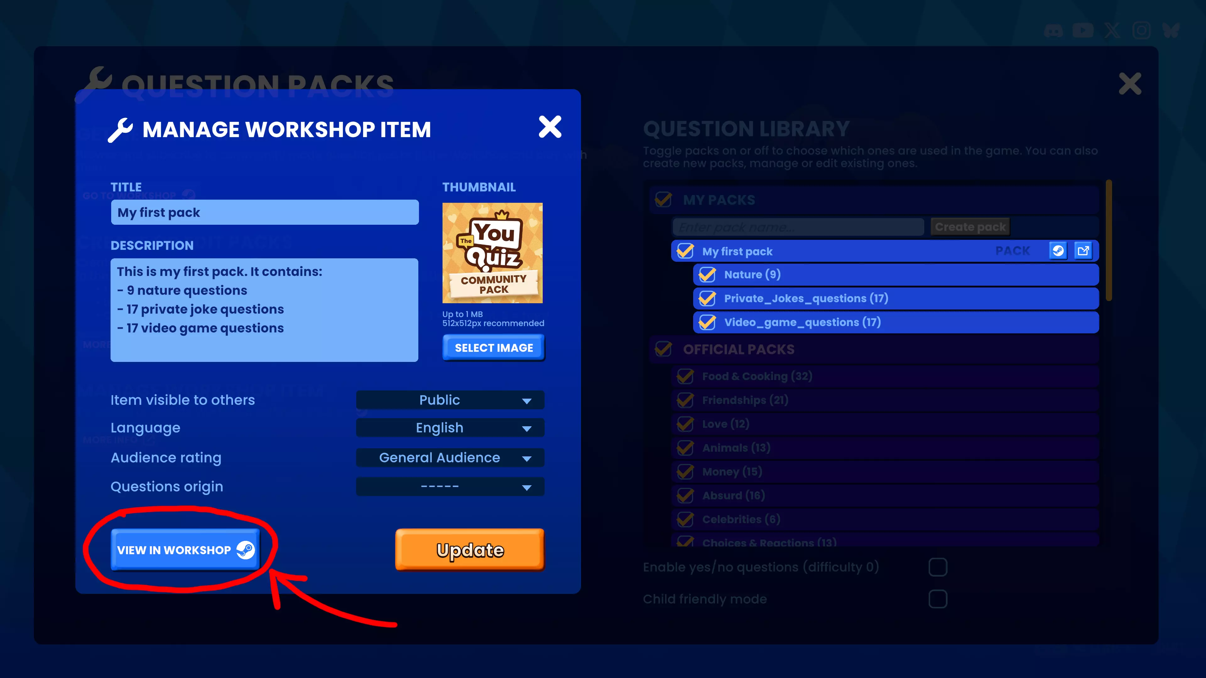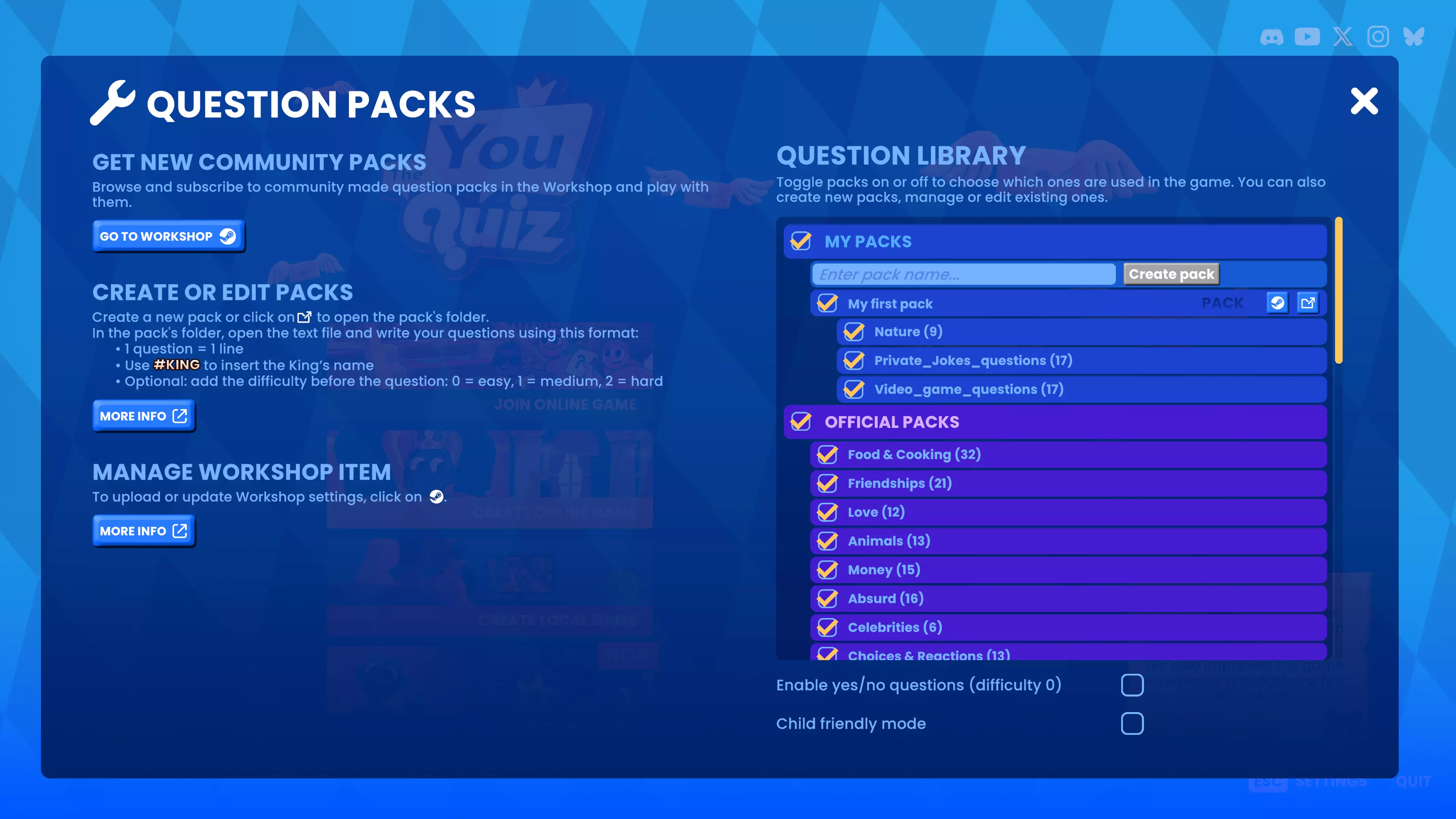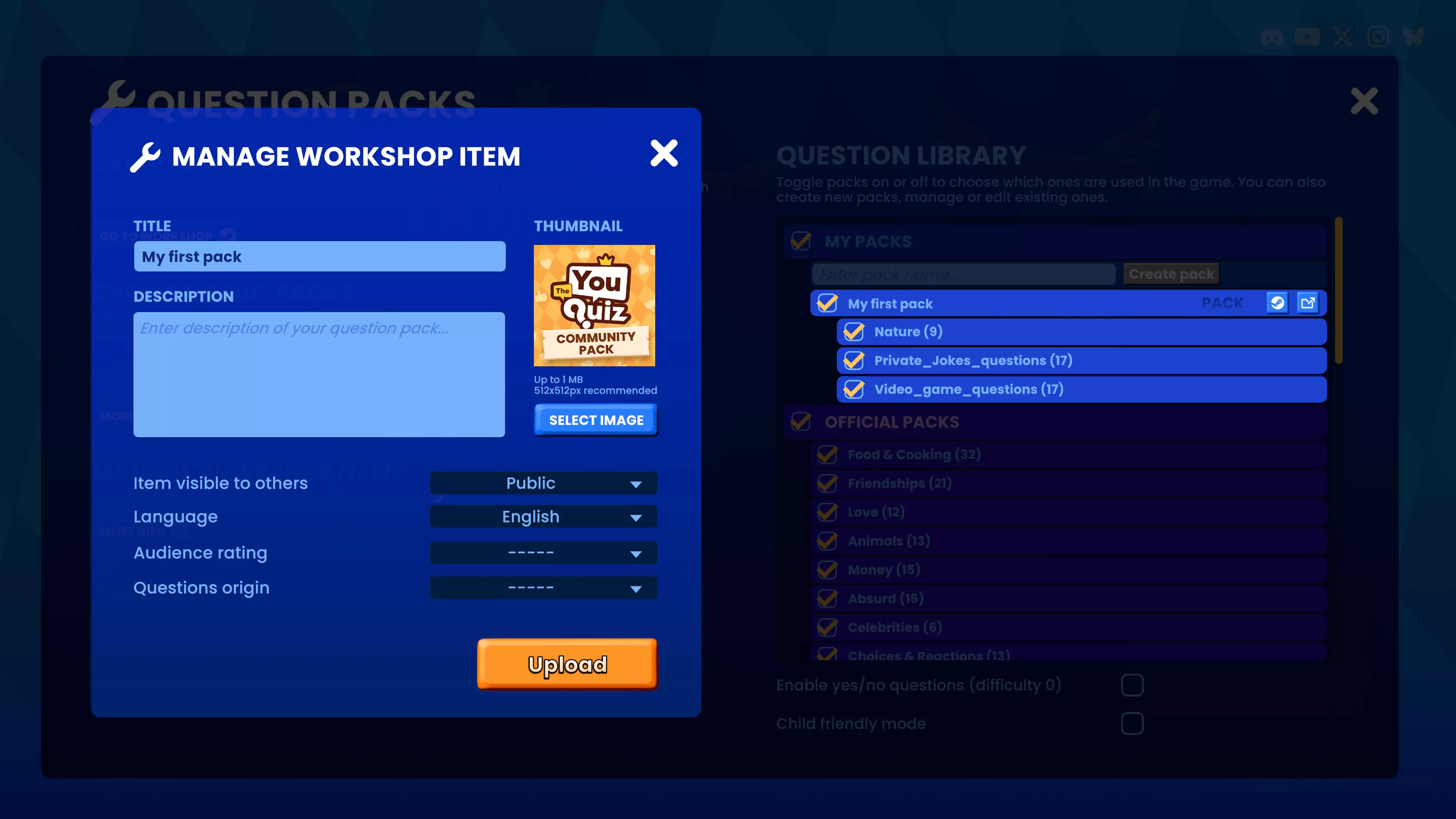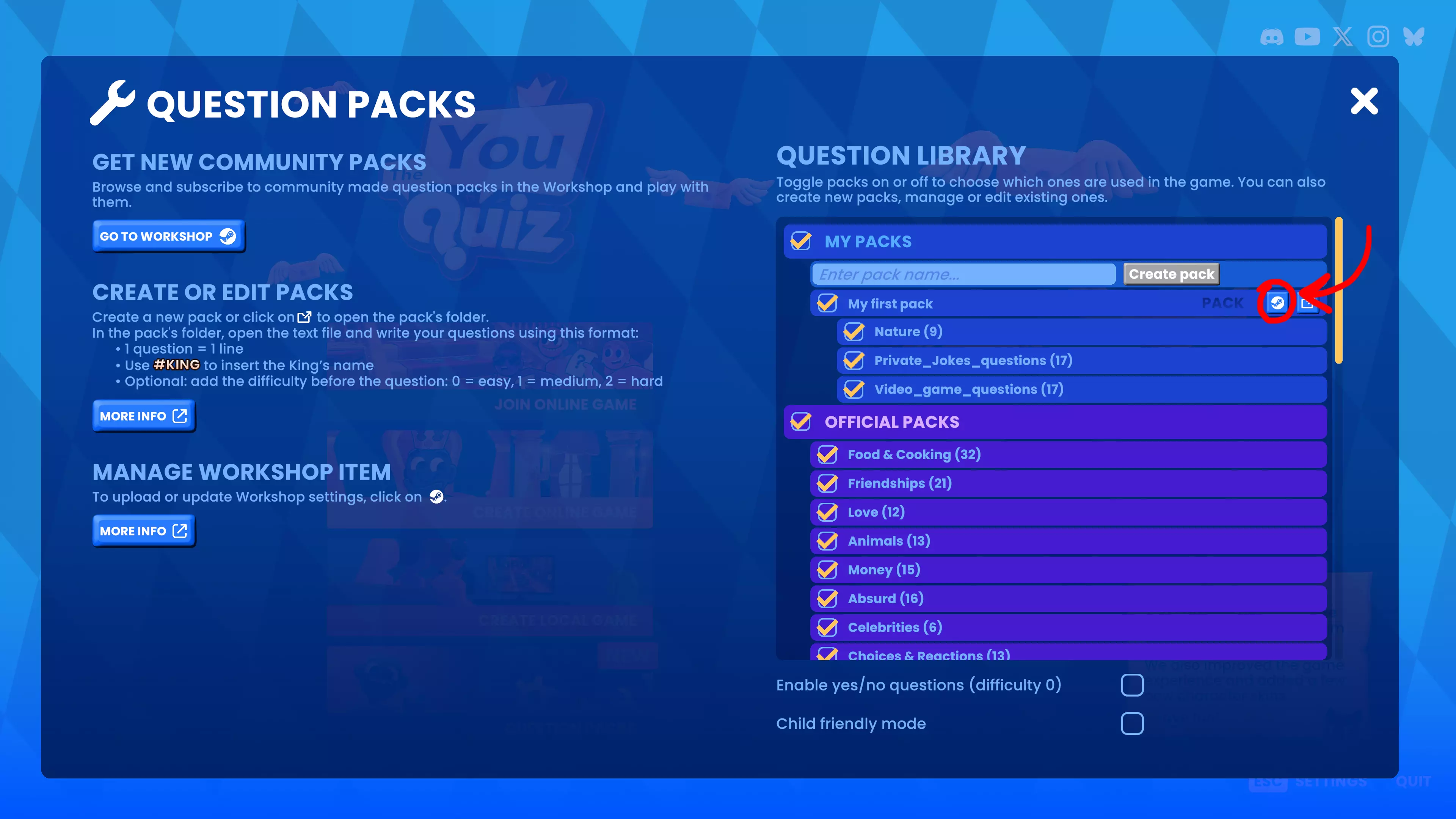 为《The You Quiz》创建你自己的问题包并与社区分享。本指南将说明如何编写问题、构建文件结构以及将你的问题包上传至Steam创意工坊。 要求: 你必须拥有《The You Quiz》的游戏副本才能创建自定义问题包。 朋友通行证不支持此功能。 创建或编辑自定义问题包: 1. 启动游戏并进入【问题包】选项。