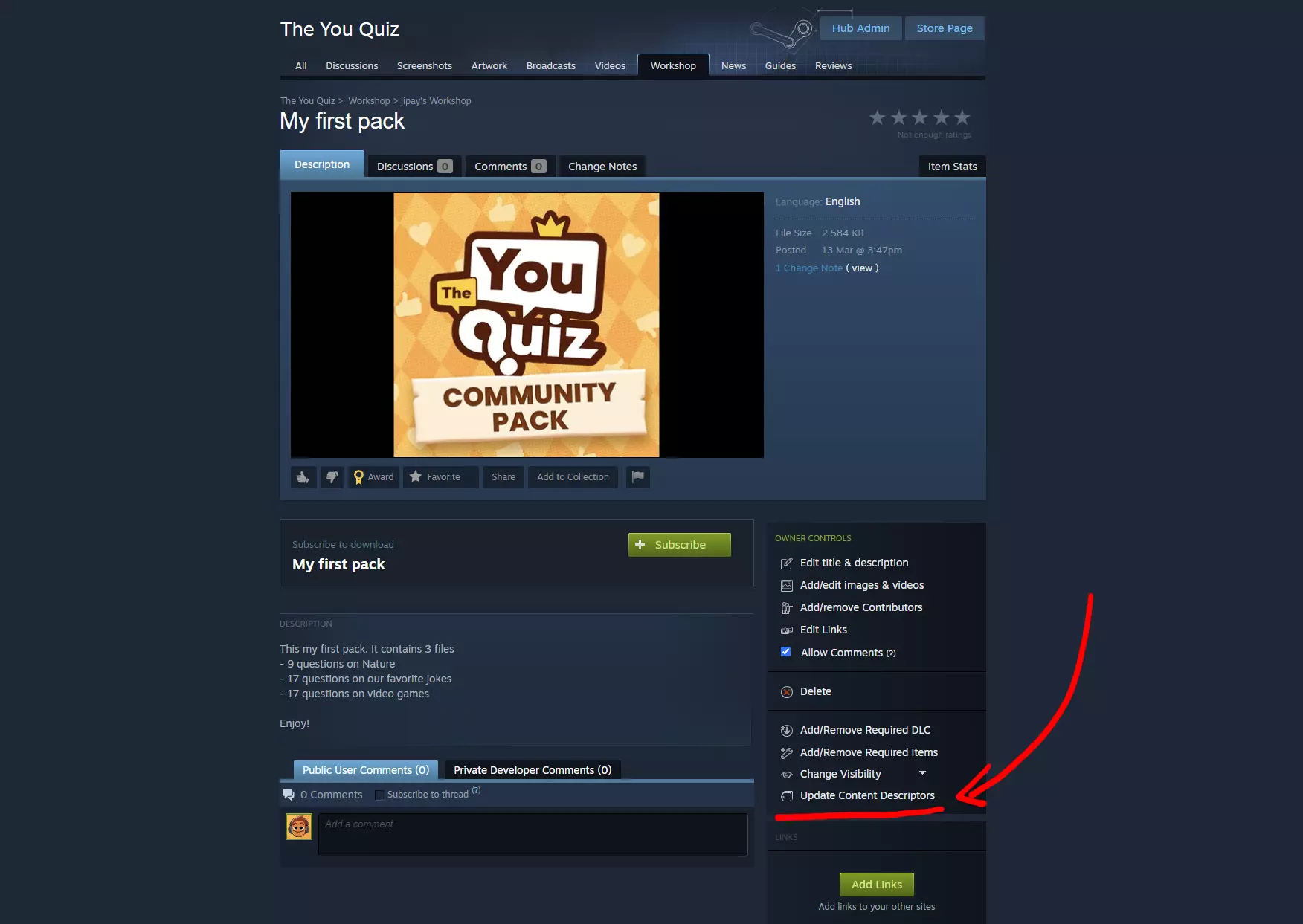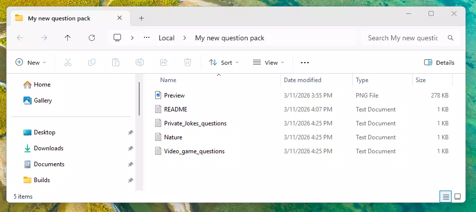 整理你的数据包文件 你的文件夹中会包含以下文件: 【My new question pack.txt】:包含问题内容。 【Thumbnail.png】:用于创意工坊的图片。 【README.txt】:包含使用说明。你可以根据需要将其删除。