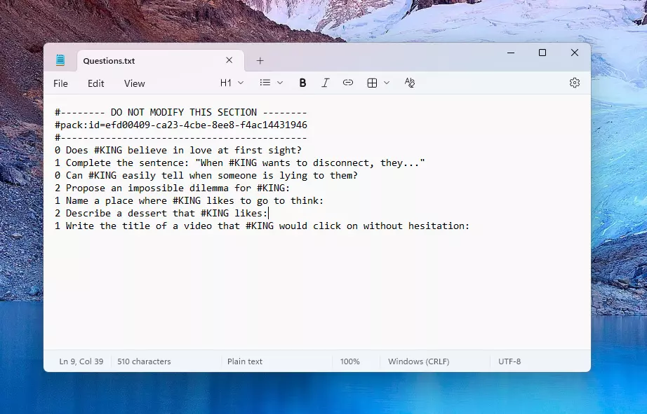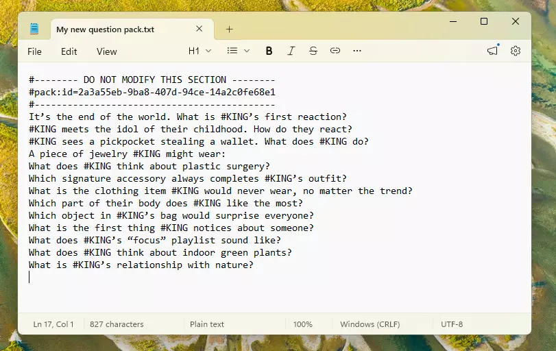 文件顶部有一个供游戏检索数据包的标题。 #-------- 请勿修改此部分 -------- #pack:id=7770166c-ce0a-4c3c-960f-bd89151a0447 #-------------------------------------------- 在该行下方编写你的问题,且不要修改此标题。 示例 什么是最好的冰淇淋? 1 #KING的完美夜晚是怎样的? 0 #KING更喜欢龙还是独角兽? 2 描述#KING的完美公寓: 如果你使用难度数字,你的文件应如下所示: