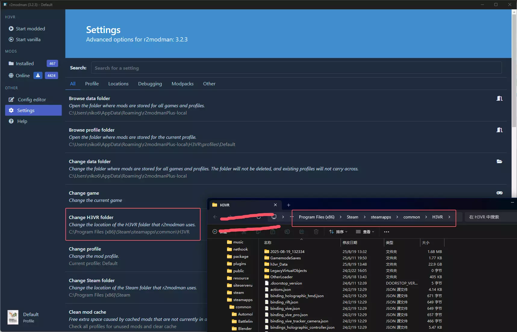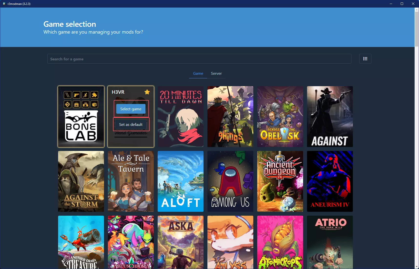 (如果打不开Thunderstore可以下载UsbEAm修改hosts,Thunderstore相关在网页相关,有两项都要改) 打开r2第一个页面应该是游戏选择页面,找到【H3VR】点【Select Game】(或者点【Set as default】设为默认游戏,下次打开r2会自动选择这个游戏)