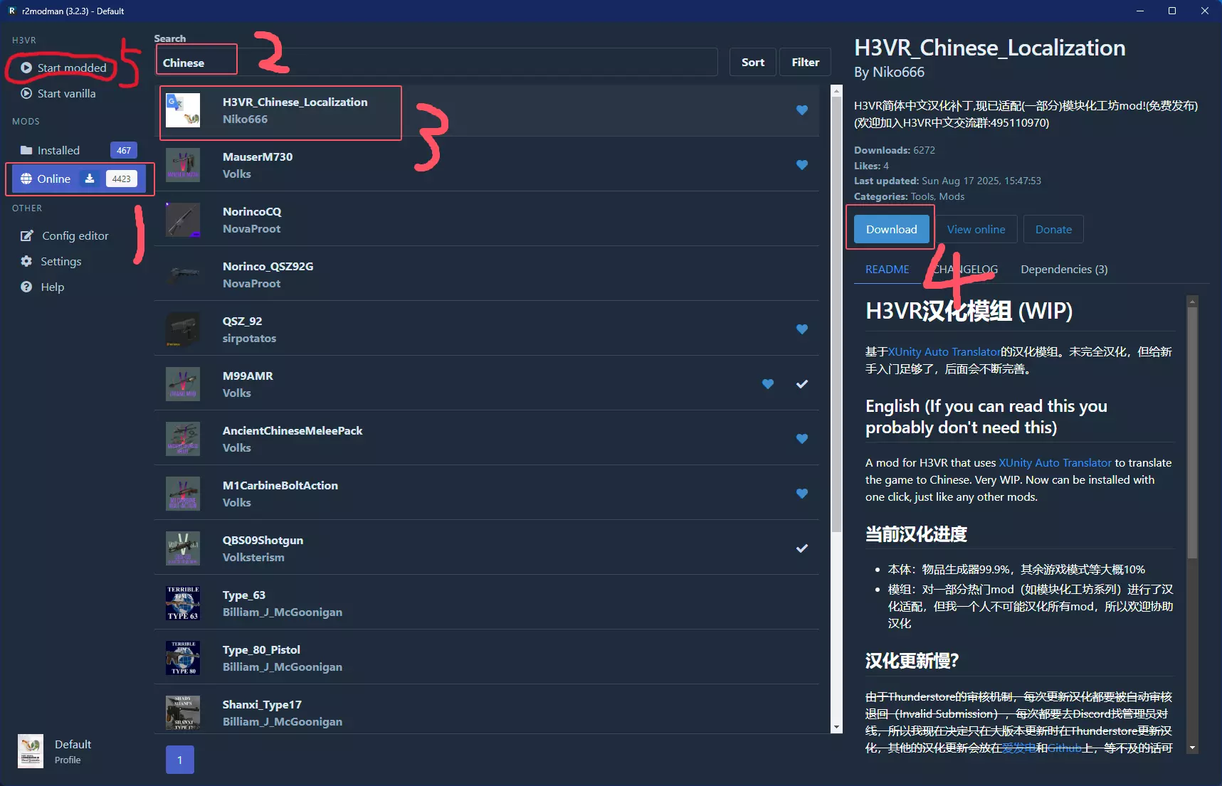 首先点击设置,确保游戏路径(更改H3VR文件夹)和Steam路径(更改Steam文件夹)设置正确,且所有目录都不含特殊符号(例如中文)。然后点击在线,在上方搜索框中搜索关键词Chinese,找到H3VR_Chinese_Localization,点击后右边会弹出简介(Readme),点击上方下载进行安装,最后点击最左侧的以模组启动来启动游戏,操作完成。
