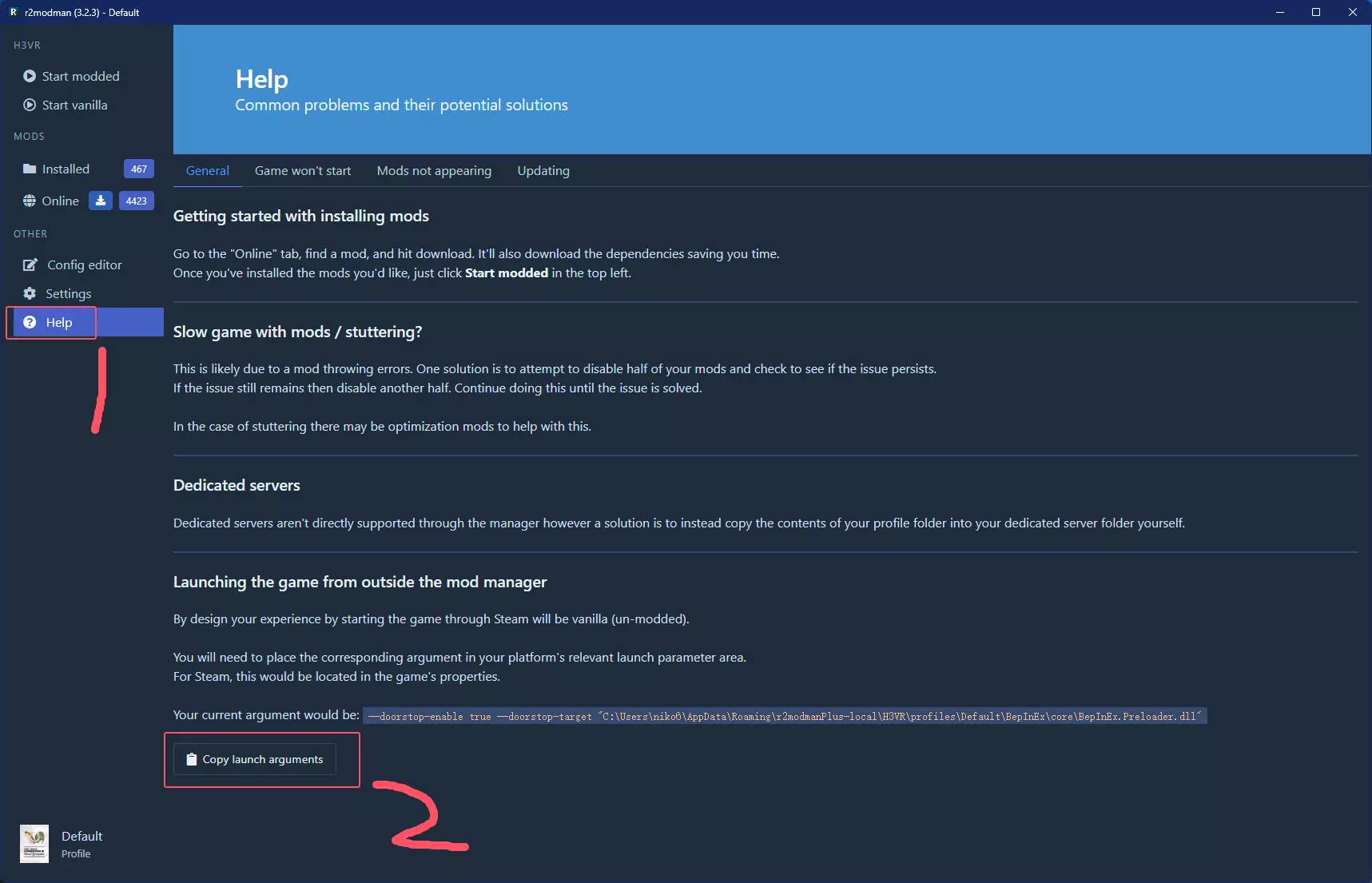 如果你觉得每次都要从R2启动很麻烦的话,可以点击【帮助】,在下方找到【复制启动参数】,点击即可复制启动选项。在Steam中右键游戏点击【属性】,将启动选项粘贴到输入框即可。