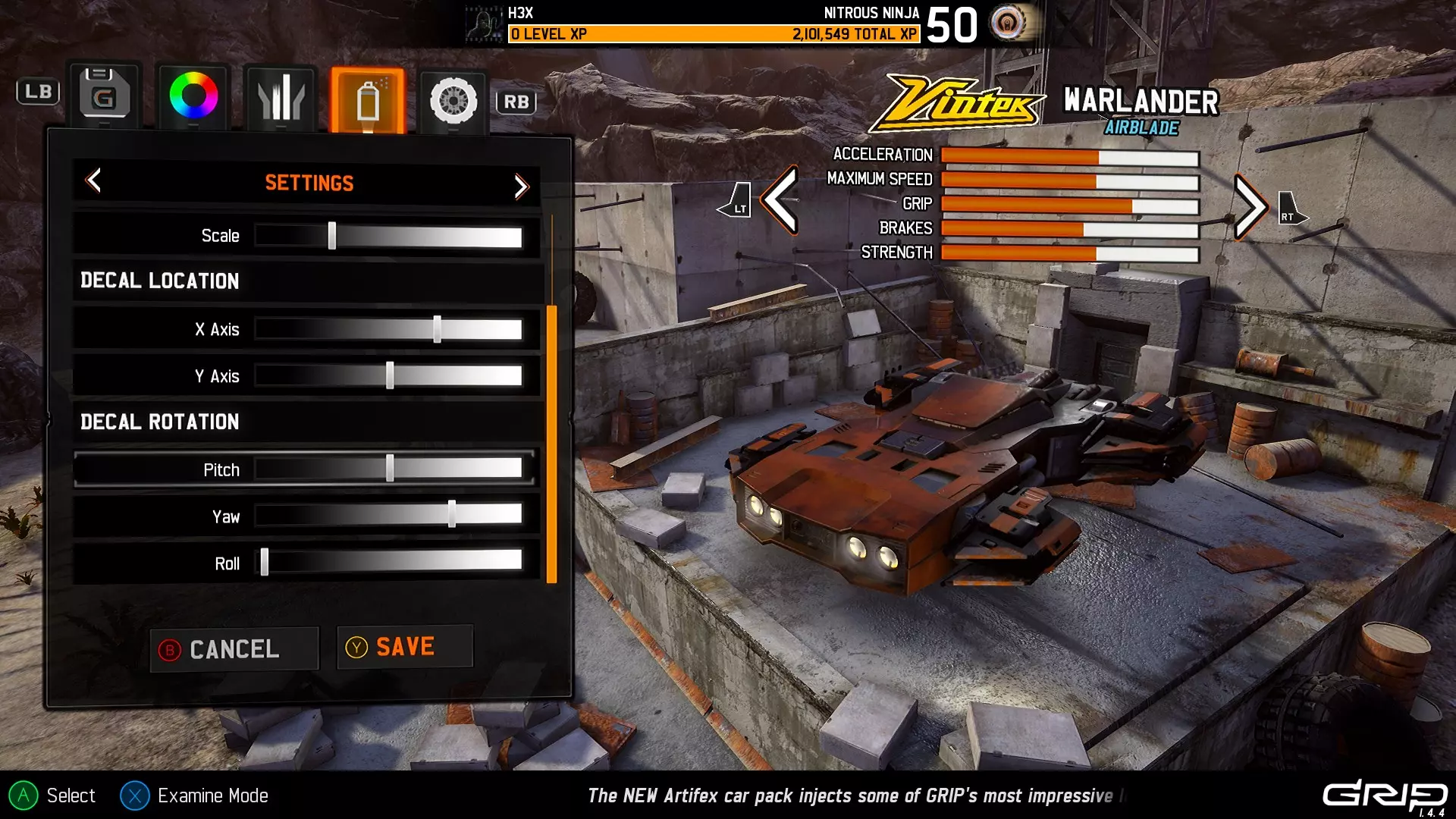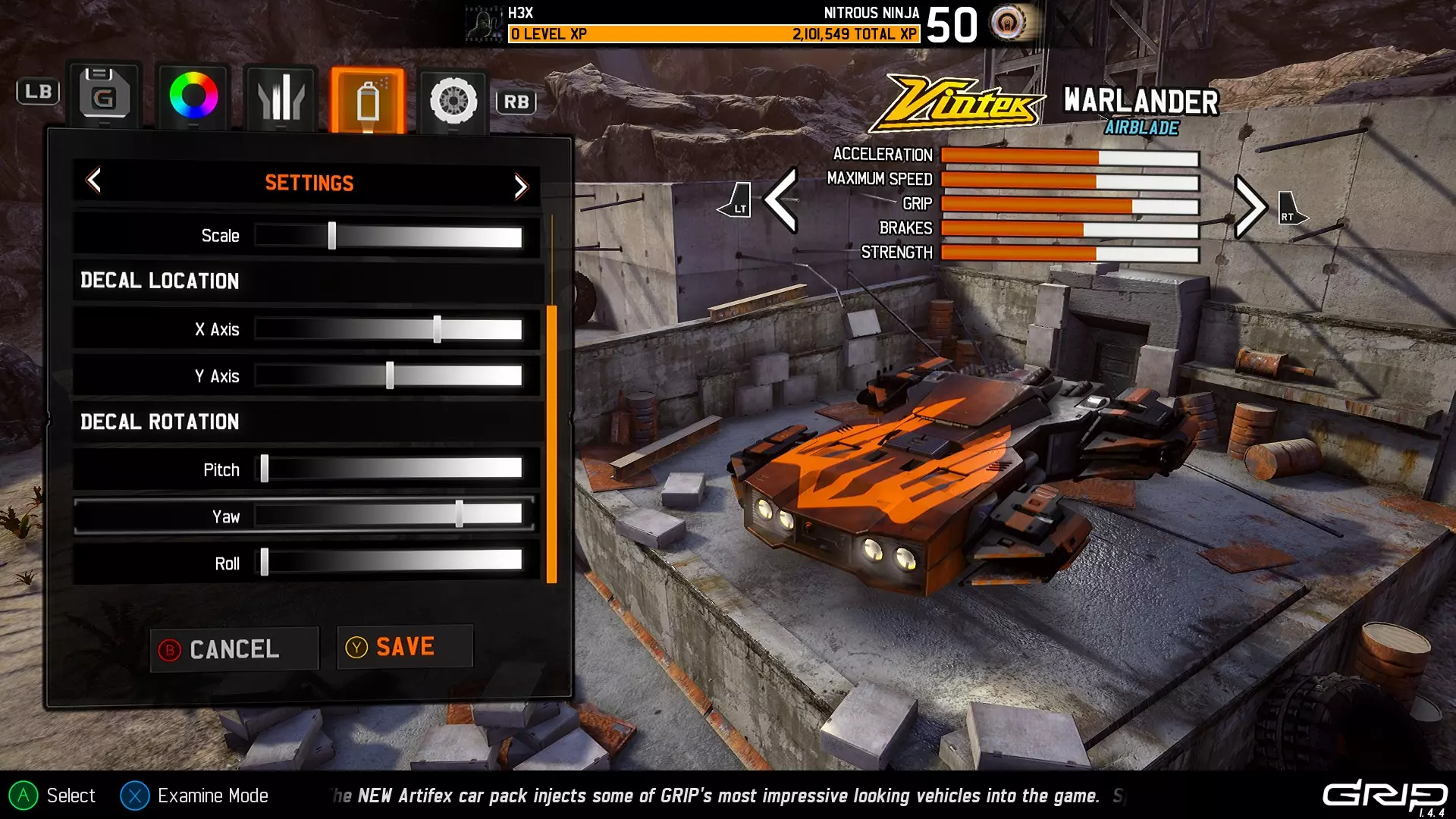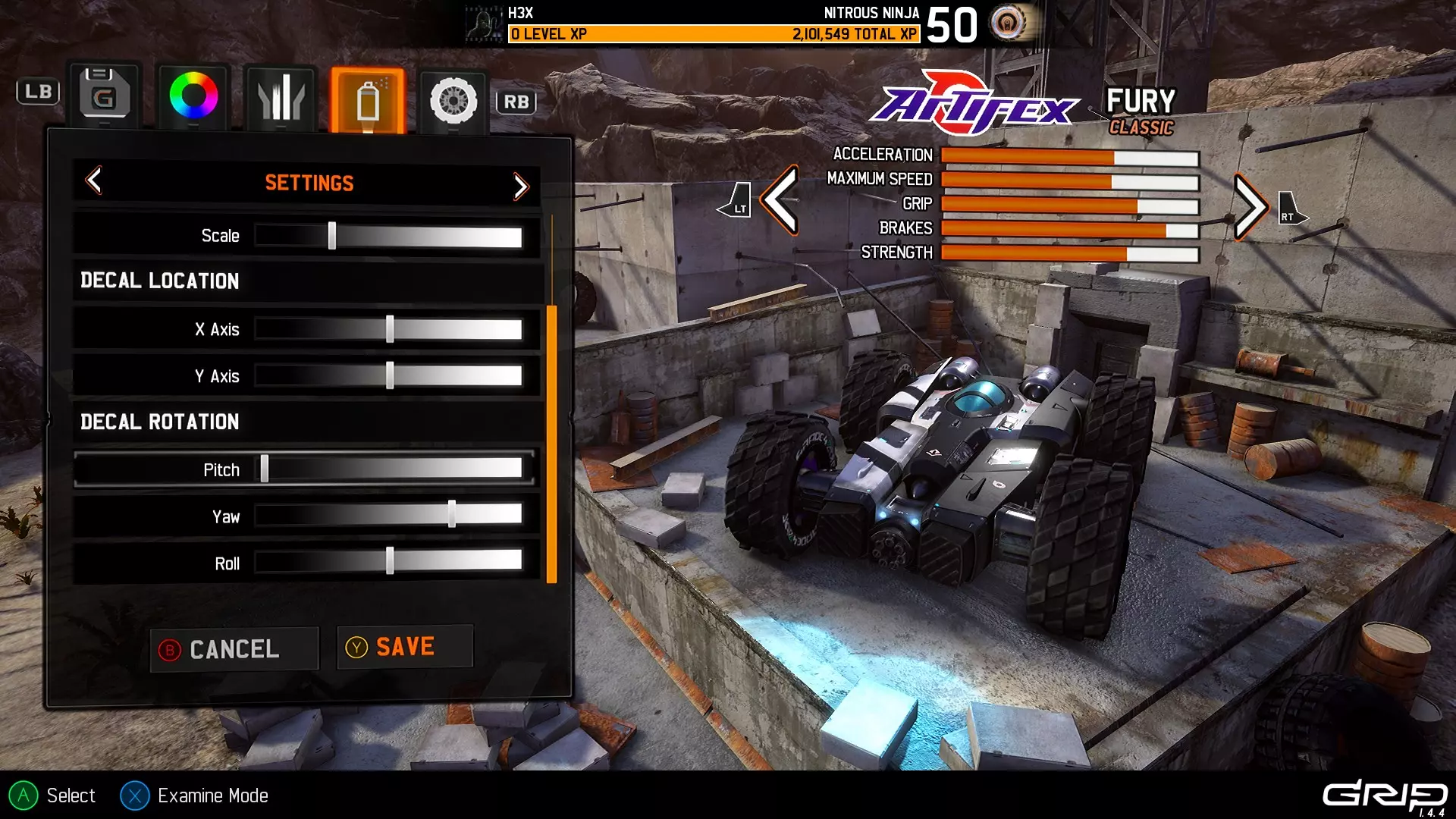 还需注意,每个设置的调节条包含100个档位,其中俯仰、偏航和横滚的调节条总共对应360度的旋转范围。 尽管这些数值目前在用户界面中不可见,但可以手动计数(使用控制器会非常方便,不过键盘也能操作)。 将每个调节条的最左侧设为起始点(即0),X轴和Y轴的默认值为50,而俯仰、偏航和横滚的默认值分别为0、75和0。(是的,这意味着将偏航值增加到100时,会从默认设置顺时针旋转90度,因此对于某些数值,你可能需要反向操作)