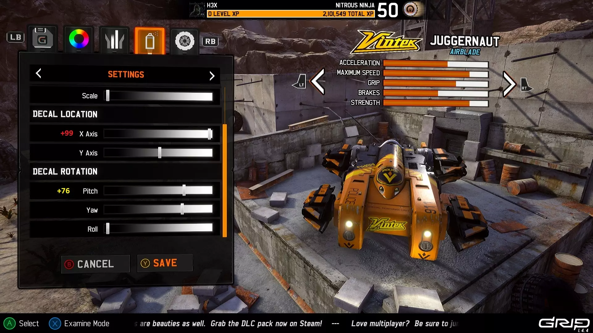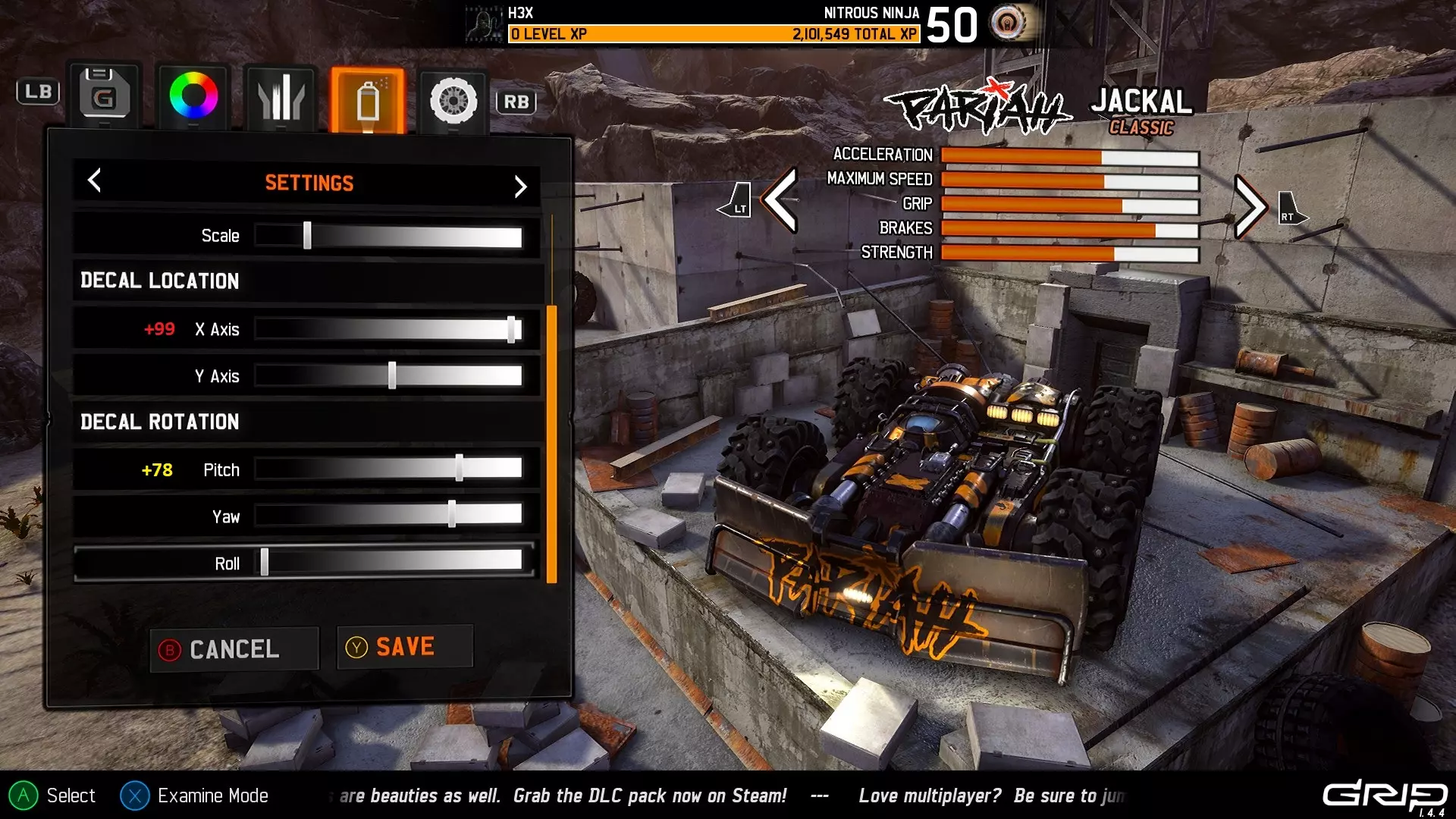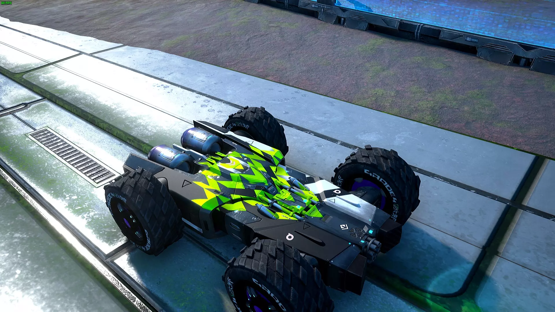 注意:由于贴花在车辆侧面的显示方式,很难在截图中区分Y轴移动和翻滚移动,但下一部分会详细介绍一些涉及翻滚的技巧。 俯仰还是翻滚? 我多次看到有人提到希望将贴花贴在车辆底部,虽然目前在车库中无法查看车辆底部,但放置贴花仍然没有问题。将俯仰或翻滚设置为+50的值即可实现。 例如,当车辆在游戏中翻转时,俯仰设置为+50的效果如下:
