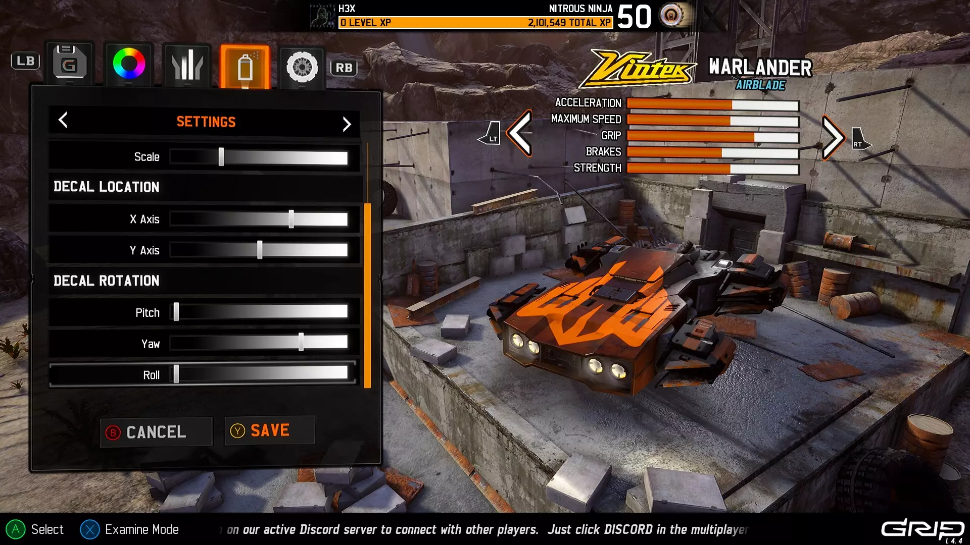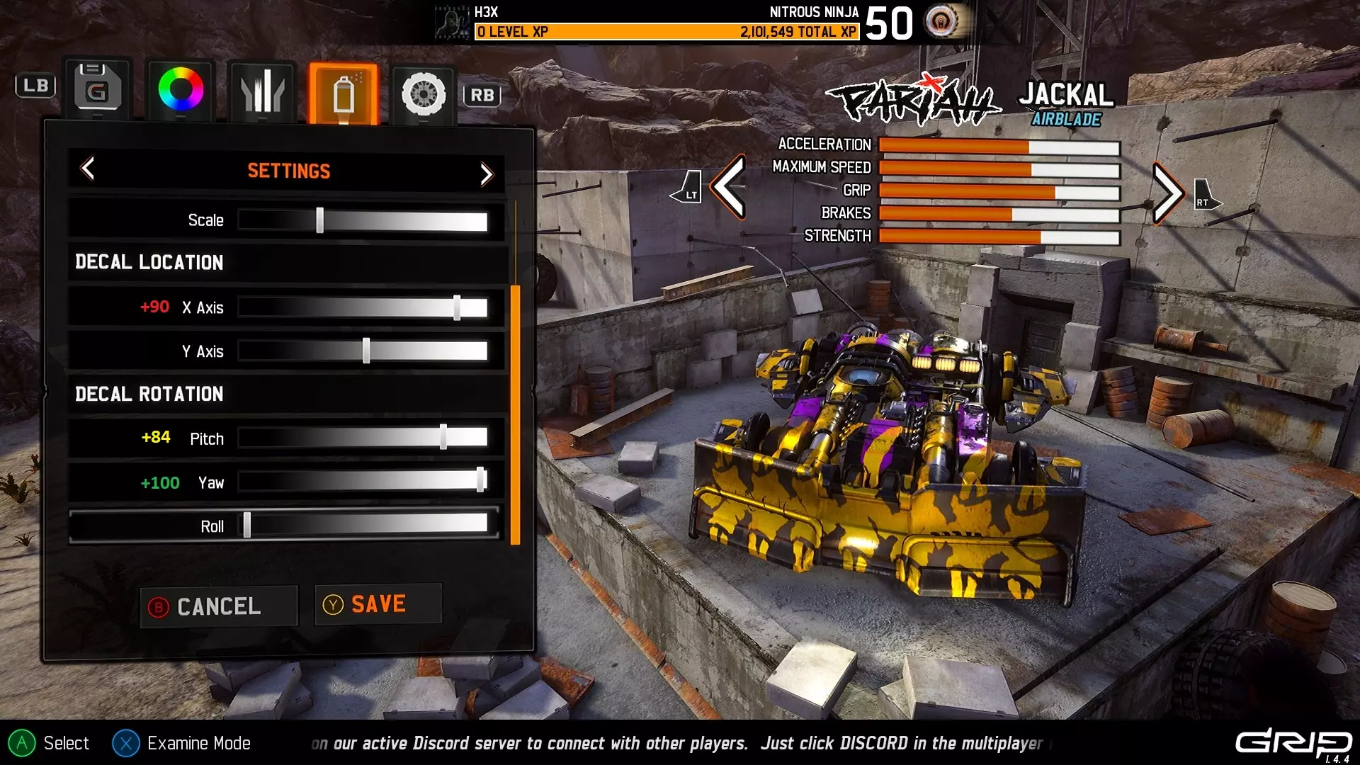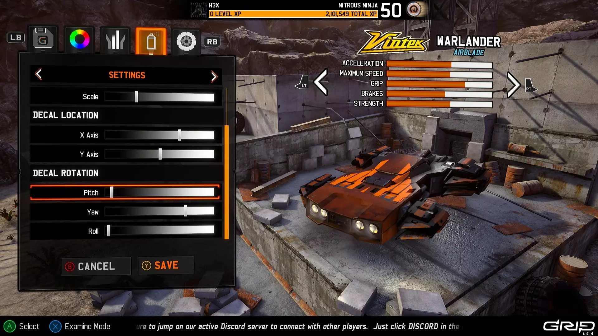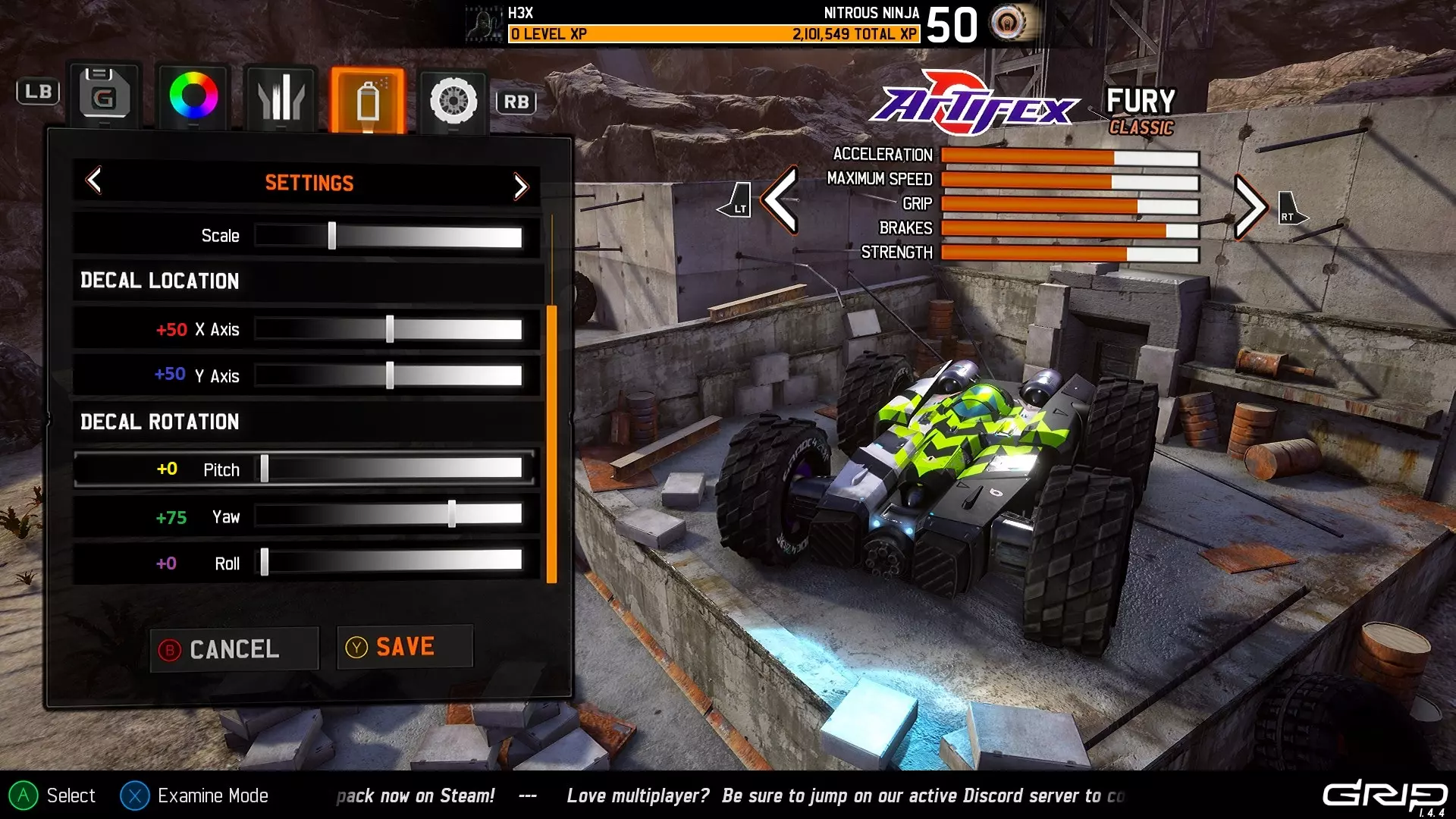 注意:由于贴花在车辆侧面的显示方式,很难在截图中区分Y轴移动和翻滚移动,但下一部分会详细介绍一些涉及翻滚的技巧。 俯仰还是翻滚? 我多次看到有人提到希望将贴花贴在车辆底部,虽然目前在车库中无法查看车辆底部,但放置贴花仍然没有问题。将俯仰或翻滚设置为+50的值即可实现。 例如,当车辆在游戏中翻转时,俯仰设置为+50的效果如下: