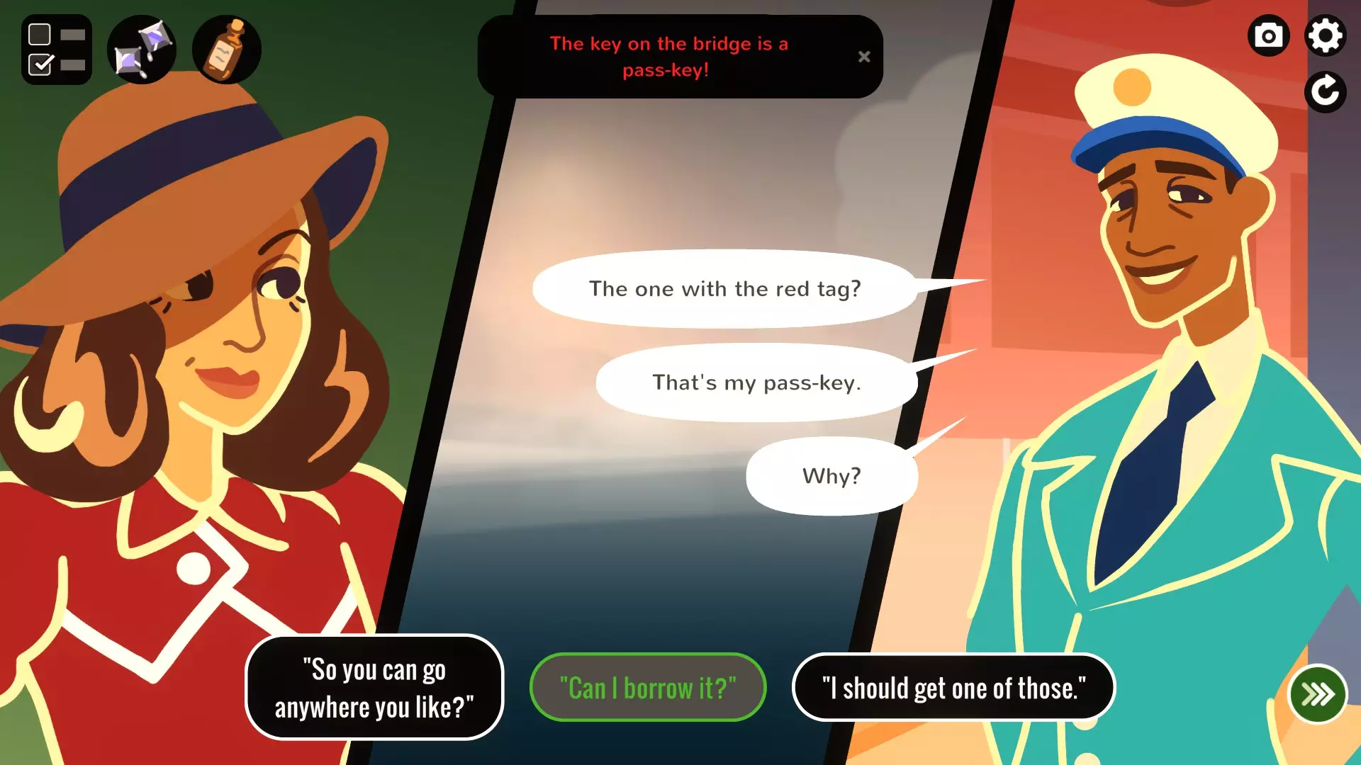 不留后患 风暴协议与龙卷风协议:将一切归咎于阿姆斯特朗女士,并在5/4小时内完成。这比你想象的要简单。 醒来,对乘务员大喊,拿起你的药片。跑到上层甲板,拿起你的耳环。等到安德斯走过,跟着他上舰桥。这里有个奇怪的情况,如果你在安德斯进入舰桥时已经在里面,他不会谈论通行证,但如果他已经在那里,他就会说。一直和安德斯说话,直到出现“通行证”选项。引诱他拿到钥匙,然后前往阿姆斯特朗女士的 cabin。走到书架前,打开《九位裁缝》,拿起勒索照片。回到舰桥,把照片给安德斯。按铃并开始会议。引导对话指向对那位女士的指控,让安德斯来扳倒她。我在11点12分按了铃,会议提前十分钟结束了。