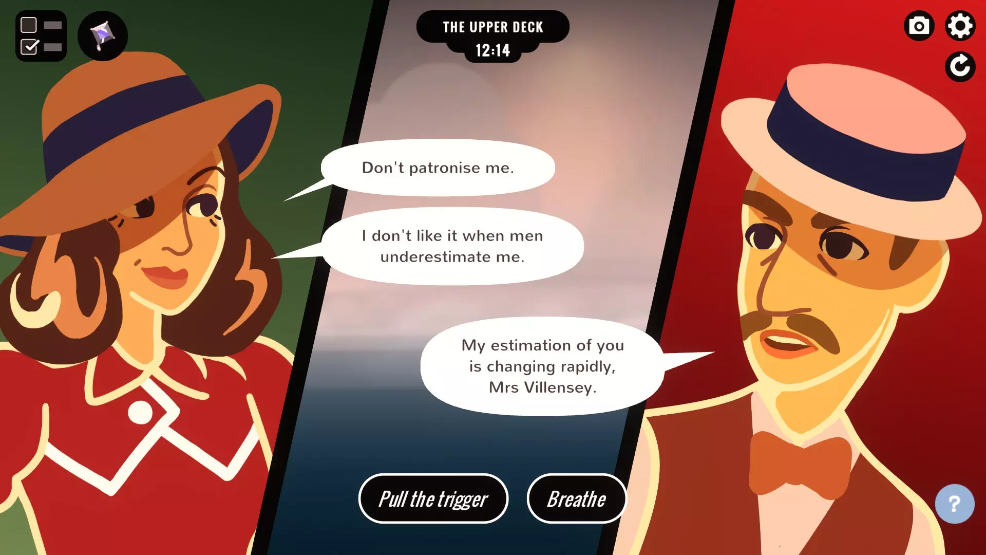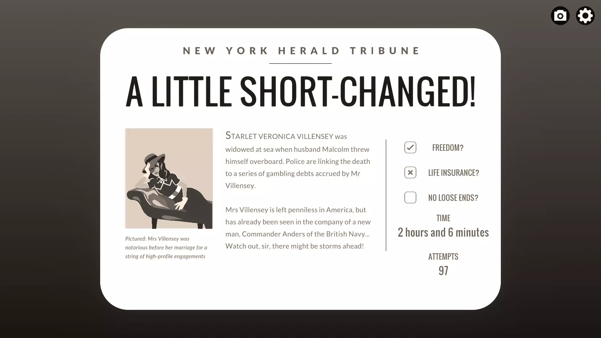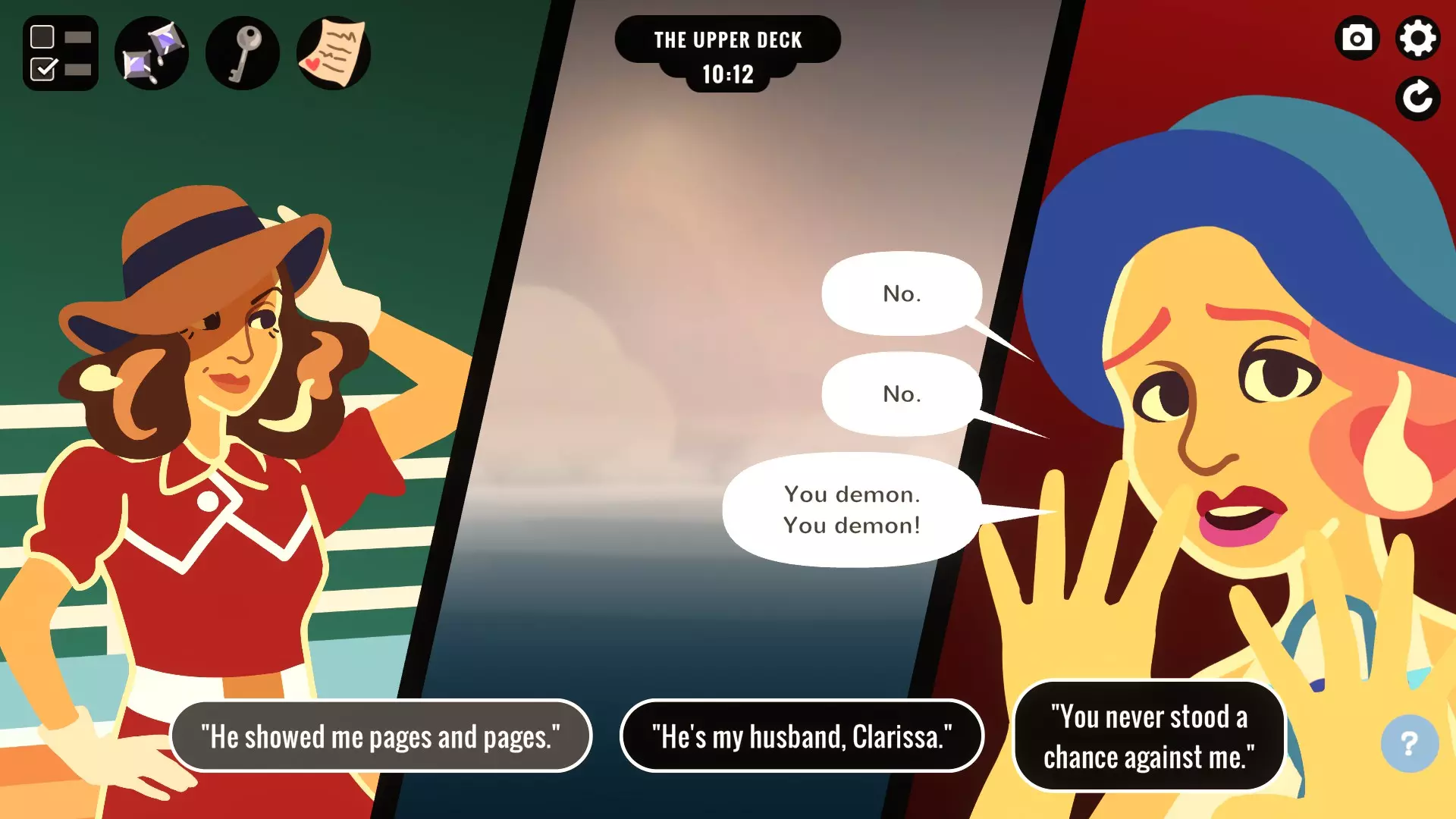 一切都结束了:将你丈夫的所有物品扔出船舱舷窗。前往吸烟室,拿走他的钱包和克拉丽莎船舱的钥匙。然后,闯入克拉丽莎的房间,查看她的床头柜,因为你丈夫在那里放了一本书。拿到书后,回到你的船舱,走向舷窗。依次将书、他的钱包,最后是他的衣服扔出舷窗,即可获得该成就。 联络官:与安德斯发生关系。早上11点前和他交谈,并约定11点30分在你的船舱幽会。准时赴约并与他调情,即可获得该成就。 紧打绳结:敲诈某人。我是通过了解到斯泰尔韦的偷渡者,然后在会议期间他将责任推给你时,威胁他保持沉默而获得的。在我的游戏流程中,斯特韦提到了我丢失的耳环,然后我说“我不是你应该担心的女人”,这会让他不再追究并解锁成就。从图标来看,你似乎可以用勒索照片对安德斯做类似的事情,但我不确定。希望能得到确认或反馈。 信仰之跃:让克拉丽莎从上甲板跳下去。跑到吸烟室,从你丈夫的夹克里拿到克拉丽莎的房间钥匙。然后,冲到她的 cabin,破门而入,从她的桌子上拿一首情诗。当克拉丽莎到达时,说服她在上甲板见面。 在对话中,给她看情诗,并说这是你丈夫给你的,你们还一起为此笑过。然后你可以残忍地折磨克拉丽莎,直到你说出“你根本不是我的对手”,这会逼得她自杀。