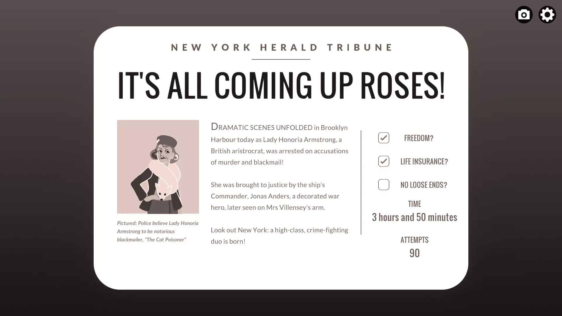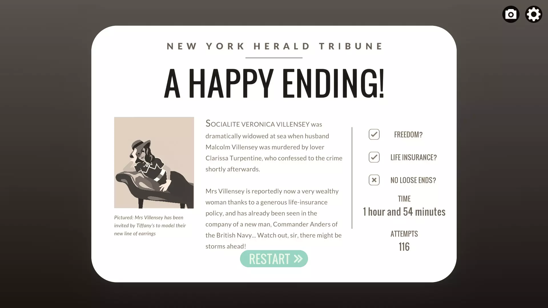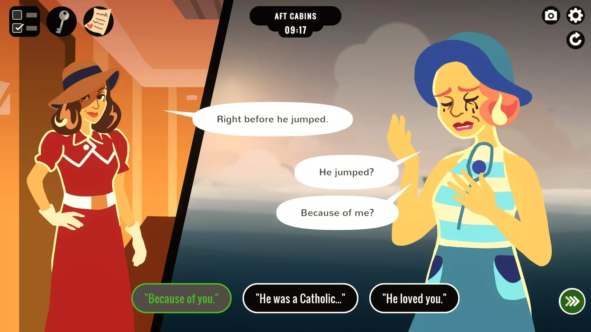 剧透提示 游戏有三个结局等级:自由(未被捕)、金钱(让他人因谋杀被捕)和毫无破绽(让阿姆斯特朗夫人因谋杀被捕)。 大致来说,如果会议上的证据无法定论,他们会默认“你丈夫是自杀”,这会让你获得自由结局。 各种速通成就都有不同的结局要求,所以请注意它们的具体条件,例如【Smooth Operator】和【Fast Work】只需你避免被捕并获得自由结局,而【Storm Protocol】和【Tornado Protocol】则要求你达成全部条件并获得毫无破绽结局。 安德斯是你的同伙,他会在会议上为你撒谎。例如,如果你已经伪造证据让克拉丽莎看起来很可疑,并且你自己的嫌疑不大,他就会撒谎说看到是她干的。这一点不适用于阿姆斯特朗夫人,因为她握有他的把柄,你需要帮他取回勒索照片,他才会配合陷害她。 把你的安眠药留在房间里总是个坏主意,因为会有人发现并认为你歇斯底里。 会议的流程相当固定:克拉丽莎会指控是你杀了他,并坚称昨晚看到你丈夫落水;阿姆斯特朗夫人会说落水前看到有个女人和他在一起;卡尔斯泰斯会拿出那只耳环,诸如此类。思考该怎么做时要考虑到这一点,因为操控或除掉某些人可以简化审判。假设你没有勒索他或把他赶走,你们就会在一起。 其他成就 这些成就需要你在游戏过程中完成特定的任务。 Reunited!:纵身跳海。随时都可以进行,但会结束当前游戏进程。 Take the Wheel:在安德斯早班期间去舰桥见他,并询问“我能试试掌舵吗?”你们俩会有一段温馨的互动并解锁成就。 God: I Hate Poetry:进入克拉丽莎的船舱,从她的书桌偷一首情诗。然后前往礼拜堂与上帝对话。会有一个选项让你和上帝一起吐槽她的诗,完成后即可获得该成就。例如,如果你杀了卡尔斯泰斯,他就不会拿出耳环。如果说服克拉丽莎坦白,当她一开始说话时,会议就会结束。 处理特定问题的方式多得令人眼花缭乱,有正确的也有错误的。 例如,你面临的一个问题是,当你把丈夫推下船时,另一只钻石耳环掉在了甲板上,如果不及时处理,这会将你与犯罪现场联系起来。成功的处理方式包括:在8:30前赶到上层甲板取回另一只耳环;在客舱浴室镜子前将你的耳环放进口袋,然后告诉斯泰尔韦特他找到的那只不是你的;得知斯泰尔韦特的秘密并以此要挟他保持沉默;杀死斯泰尔韦特;以及将你的耳环藏在克拉丽莎的客舱里,让她与犯罪现场产生关联。 失败的处理方式包括:给出矛盾的说法;谎称另一只耳环是玻璃的(辛格会识破你);说你前一天丢失了耳环(斯泰尔韦特会说当时有暴风雨,耳环肯定会丢失);被阿姆斯特朗夫人或斯泰尔韦特看到只戴了一只耳环,却还争辩说那不是你的。通用指南 在本部分中,将列出达成每种结局所需完成的事项以及一些可能的方法。 自由结局 有两件会降低你可信度的罪证:安眠药和丢失的耳环。只要处理掉它们,你就能轻松地将丈夫的死伪装成自杀。 安眠药:它们在你客舱的浴室里。如果被发现,乘务员会在会议上认为你精神失常。 处理方法: - 把它们装进口袋 - 让审判尽快结束,例如如果克拉丽莎认罪,就没人会质问你 - 把它们藏到克拉丽莎的房间里 耳环:当你谋杀丈夫时,你的一只钻石耳环掉在了上层甲板。8:30时,卡尔斯泰斯会发现另一只耳环。这是个麻烦,因为这会让你和犯罪现场扯上关系。 处理方法: 1. 冲到甲板上,在卡尔斯泰斯到达前捡起耳环。 2. 在浴室镜子前取下你的耳环,然后说服卡尔斯泰斯这不是你的。 3. 把卡尔斯泰斯扔下船灭口。 4. 找出卡尔斯泰斯的秘密,这需要从阿姆斯特朗夫人那里学到特殊的敲门声,然后检查他的船舱。当他在会议上提起耳环时,拿出勒索的证据让他闭嘴。 此外,虽然不是必须的,但如果克拉丽莎落水,会议会很快得出这是自杀协议的结论,因为克拉丽莎是唯一会指证你的人。“额外谋杀”部分中的任何一种方法都能实现这个目标。让克拉丽莎被捕的方法有很多。 用从丈夫夹克衫里找到的钥匙或万能钥匙进入她的房间并栽赃证据。安眠药会让她看起来精神不稳定,而丈夫的钱包则能证明她在丈夫死前见过他。有了这些,你就可以指控她,安德斯也会支持你。 让她自愿认罪。从她的书桌上拿一首情诗,然后开始和她交谈。把诗拿给她看。声称这首诗是丈夫跳楼前给你的。克拉丽莎会认为是自己逼死了他,并会在会议上认罪。 不留后患 敲诈者是阿姆斯特朗夫人,所以诬陷她谋杀可谓一举两得。不过,她在自己的船舱里掌握着对安德斯不利的铁证。你需要处理这件事来陷害她。 你可以使用万能钥匙进入她的船舱并拿走它,万能钥匙可以通过在与安德斯幽会后和克拉丽莎交换获得,或者在舰桥从他那里拿到。 如果你用安眠药给她下药,就可以扶她回船舱并拿走照片。拿上安眠药,前往餐厅,在下午和她交谈。点一杯饮料,用悲伤的问题分散她的注意力。先交换一次你们的饮料,然后在第二次交换前在你的饮料里下药。她会感到困倦,你就可以扶她回船舱获取照片。 你也可以从她那里买下照片,但需要1000英镑。获取金钱的方法:在没有钱的情况下和卡斯塔尔斯开始纸牌游戏,他会用500英镑换你的钻石耳环。从你丈夫的夹克衫里拿他的钱包,能多得400英镑。最后,当阿姆斯特朗夫人在小教堂时进去,暗中监视她。她祈祷完后,会在施舍盘里留下200英镑,你可以拿走。这样总共能有1100英镑,就能从她那里买下那幅画了。 或者,如果那位夫人死了,她