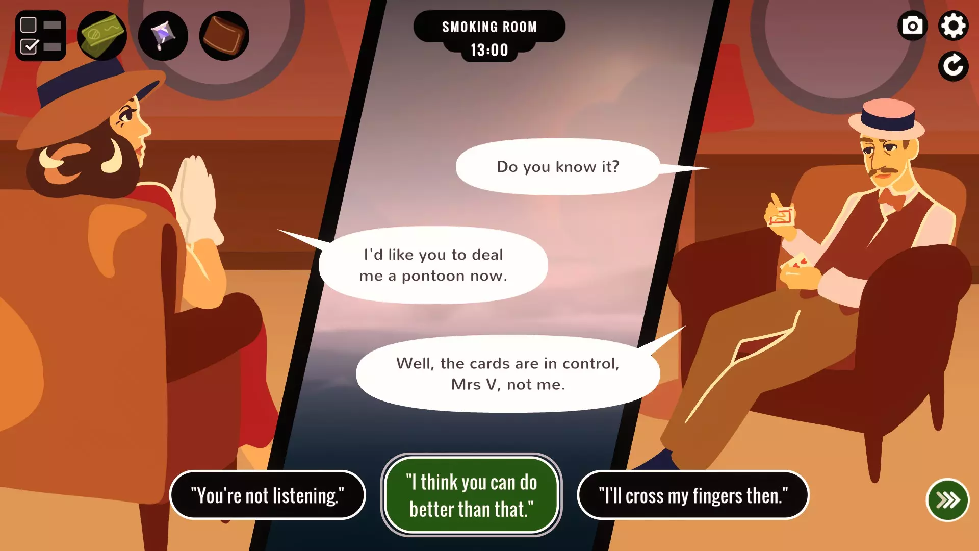 夺取家产:在纸牌游戏中让罗布·卡斯泰尔斯输得倾家荡产。 想办法得知他的秘密(可以向夫人学习敲门暗号并尝试敲他的门,或者在8:30前到达他的船舱),并用这个秘密威胁卡斯泰尔斯。开始纸牌游戏时,告诉他你要玩21点,这是能获得双倍收益的最佳牌型,然后下注300英镑。 我之前多次进行勒索并获得600英镑,但成就一直没有触发。而成功解锁成就的那一次,我拿走了耳环和用于勒索的证据,但没有拿钱包。在威胁卡斯泰尔斯之后,我用耳环换了500英镑,然后再通过21点威胁他,又获得了600英镑。他有不同的对话,说的是我把他的钱都赢光了,而不是他下注够了,然后成就就弹出来了。